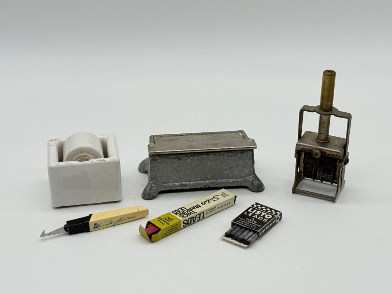 Lot # 146 - Vintage Porcelain & Cast Iron Stamp Moister, Date Stamp & More Starting Bid: $ 5.00 Bids: This sale will end in: |