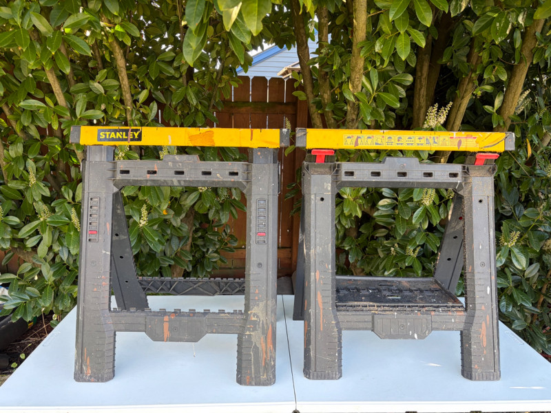 Lot # 116 - Stanley 32 inch Plastic Adjustable Folding Sawhorses Starting Bid: $ 5.00 Bids: This sale will end in: |