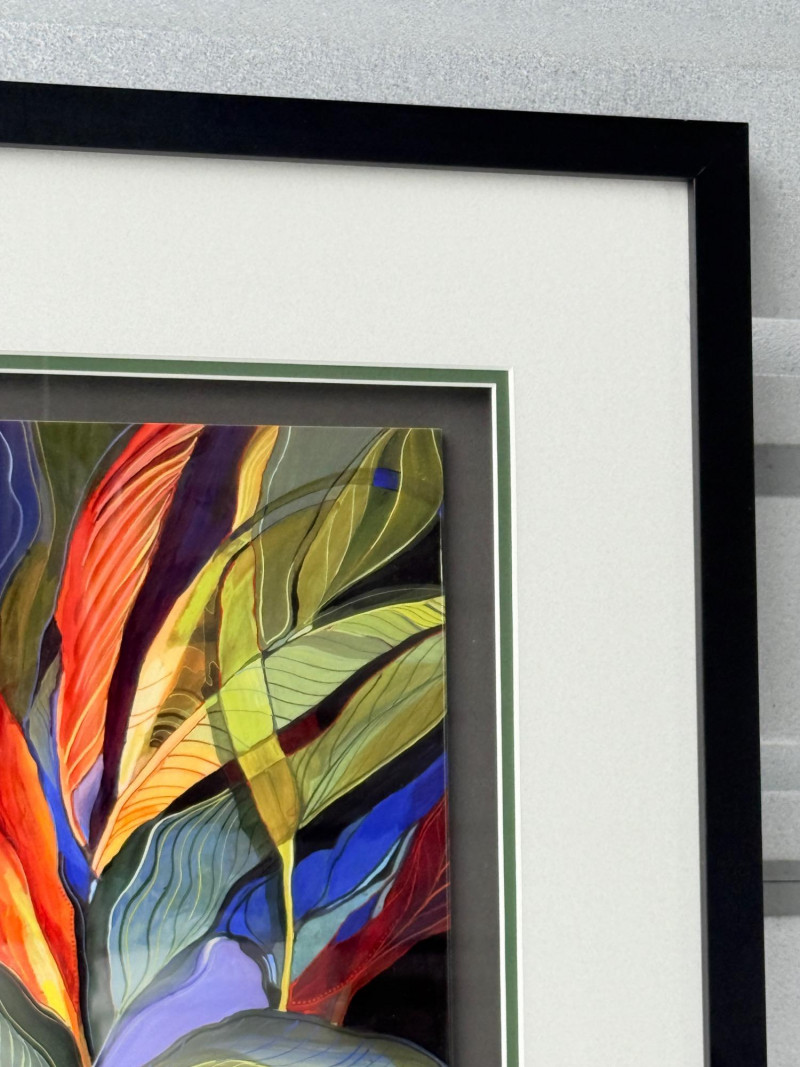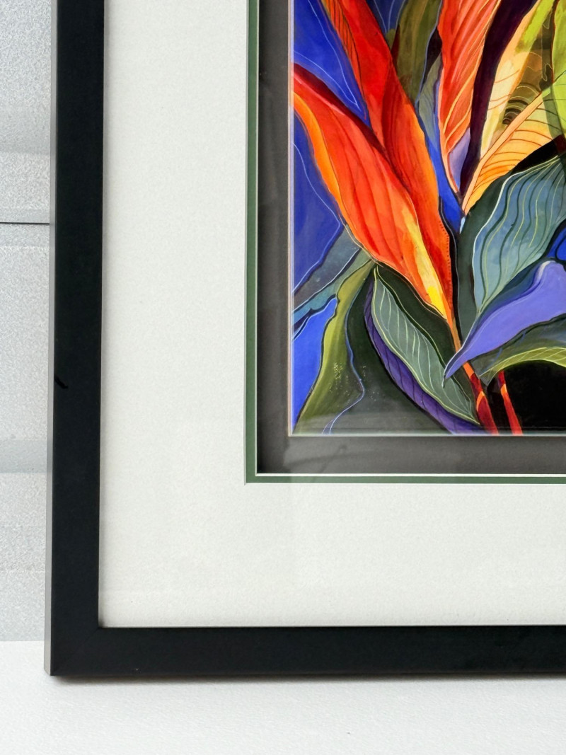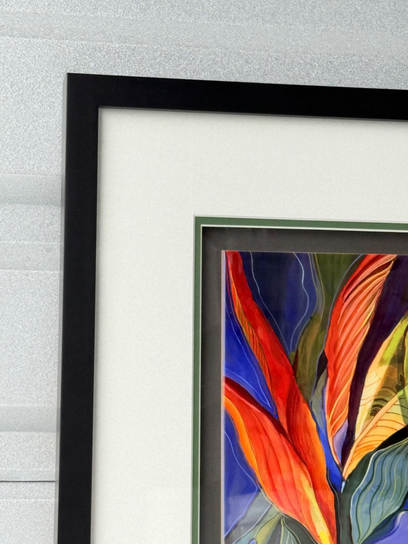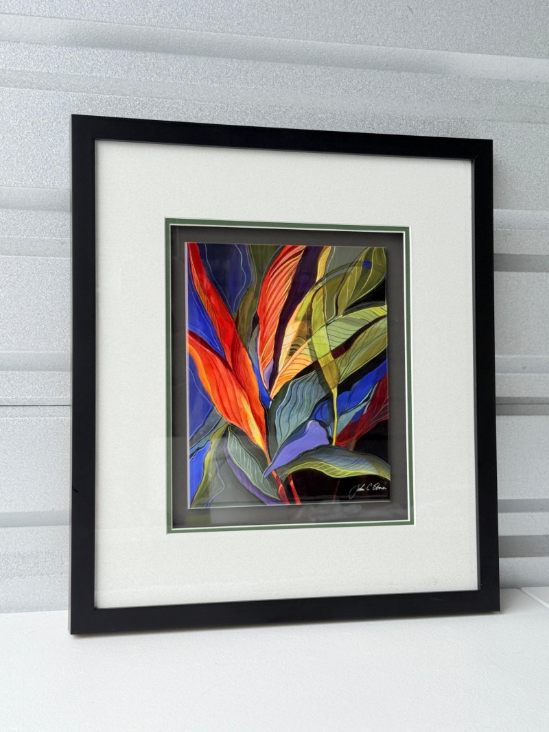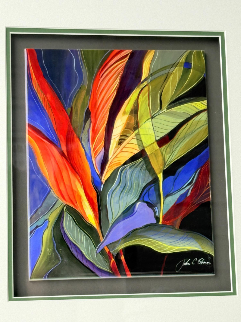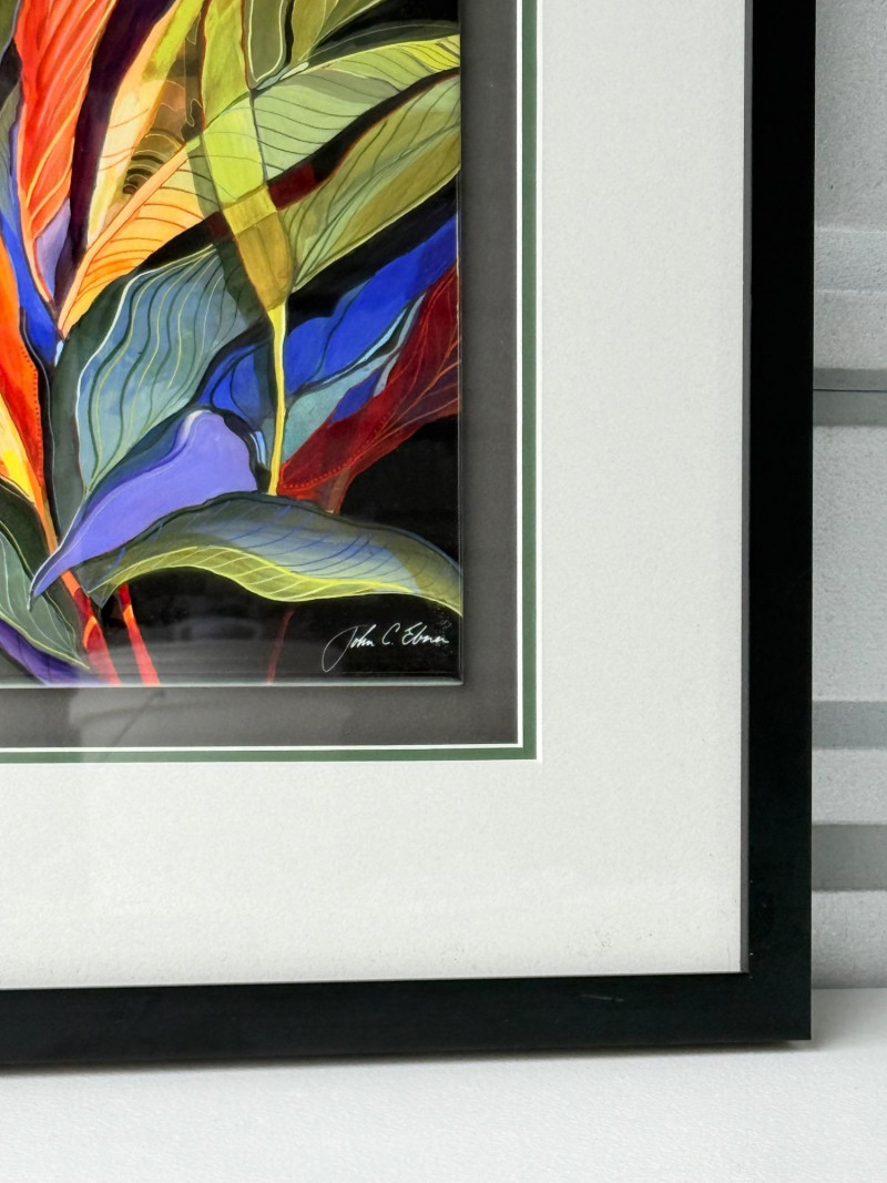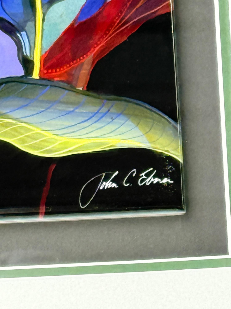 John C. Ebner - Framed Tropical Flower Art on Ceramic Tile, Signed