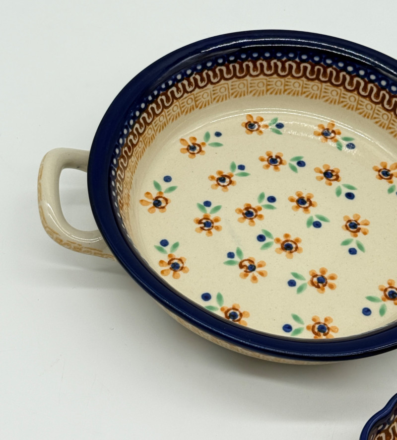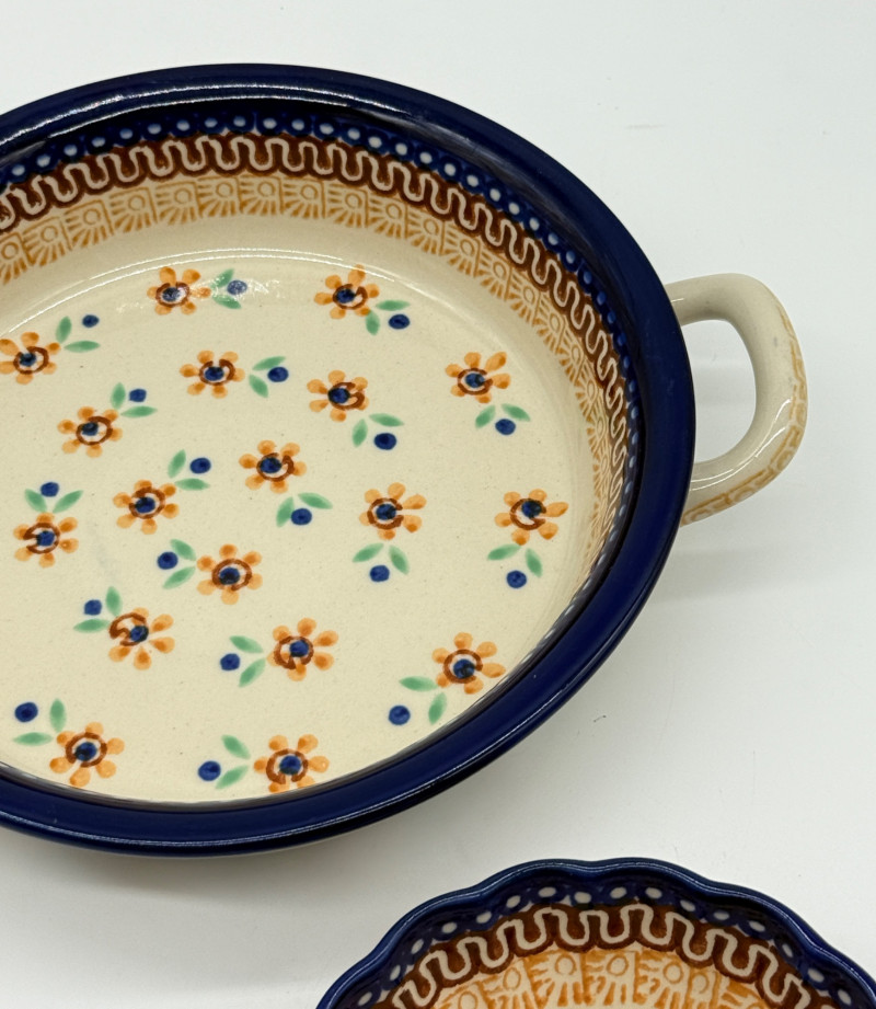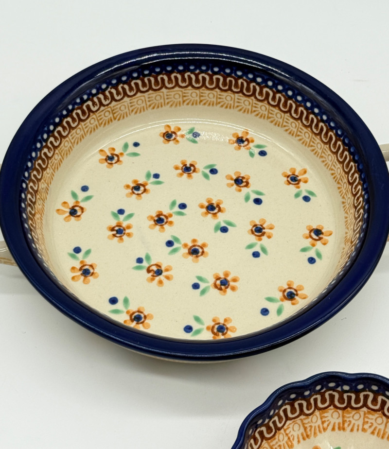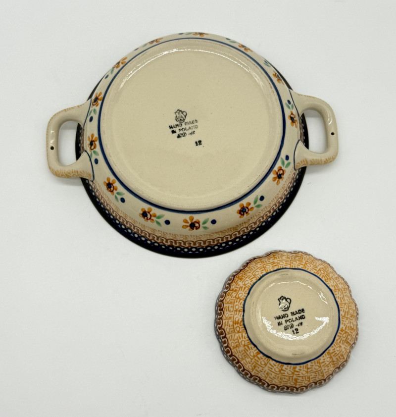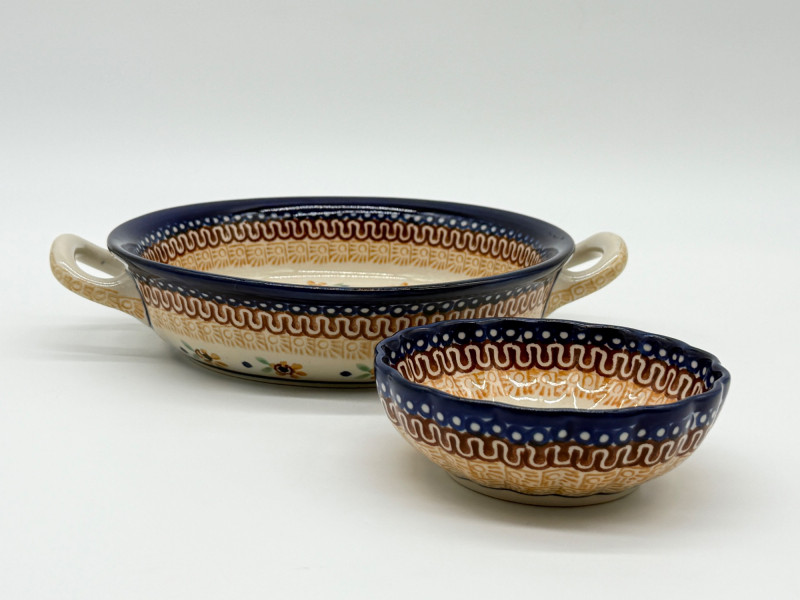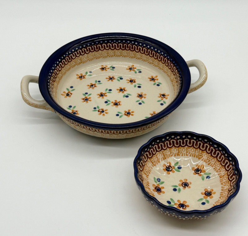 Polish Pottery Round Baker w/ Handles + Small Scalloped Bowl