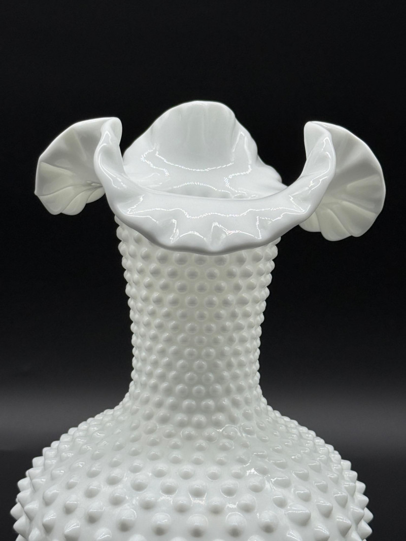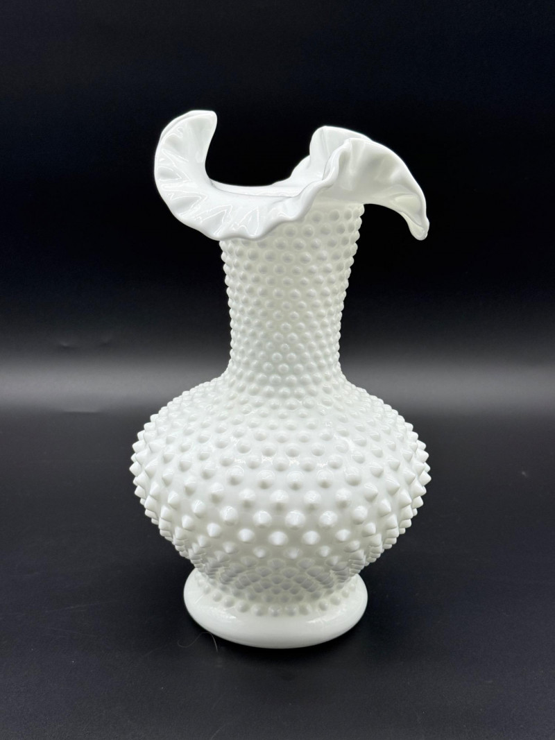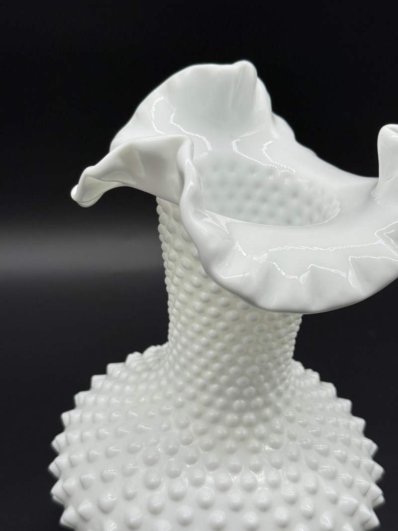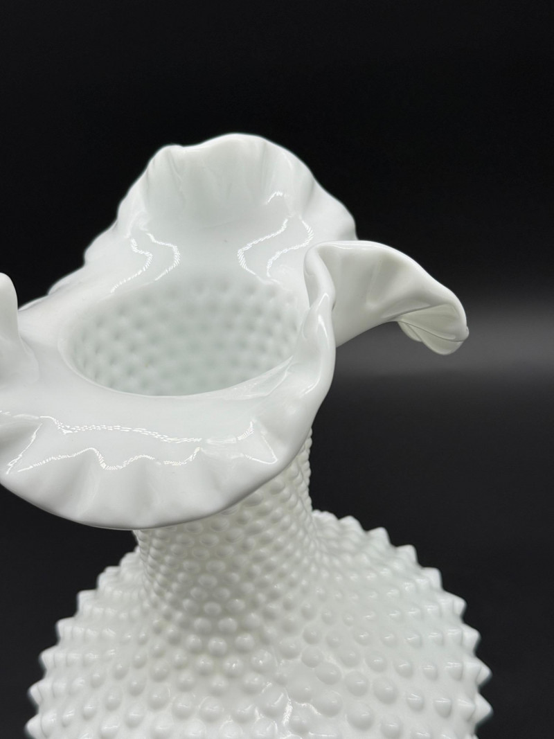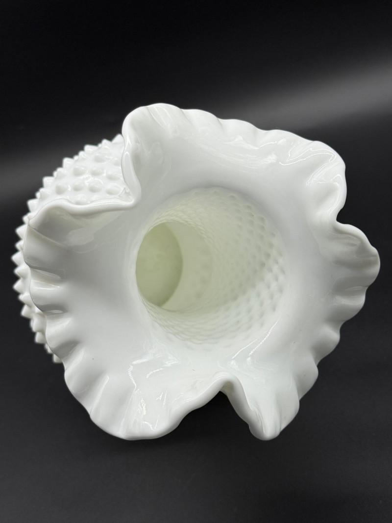 Vintage Fenton White Mile Glass Hobnail Ruffled Vase