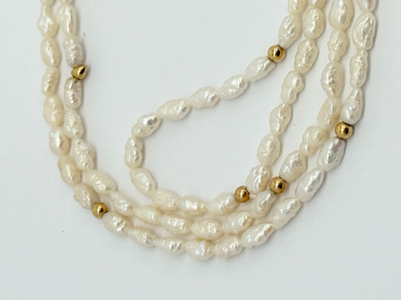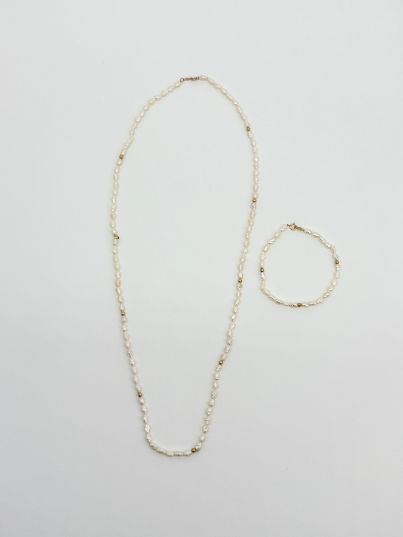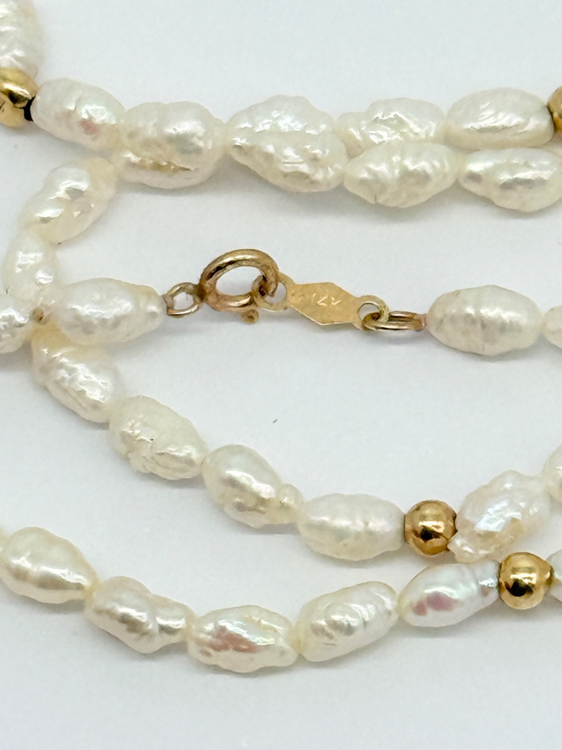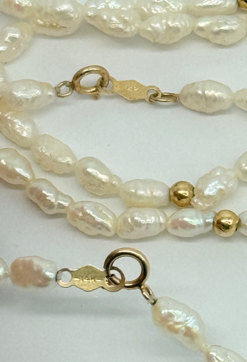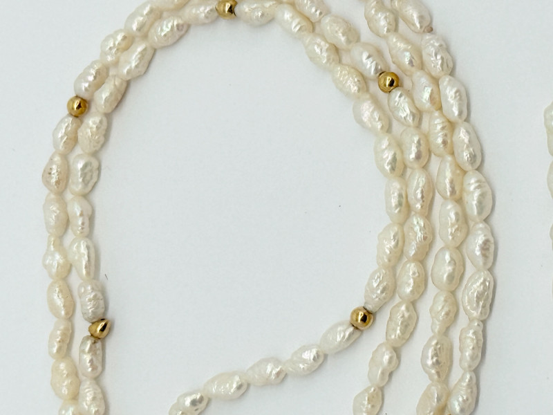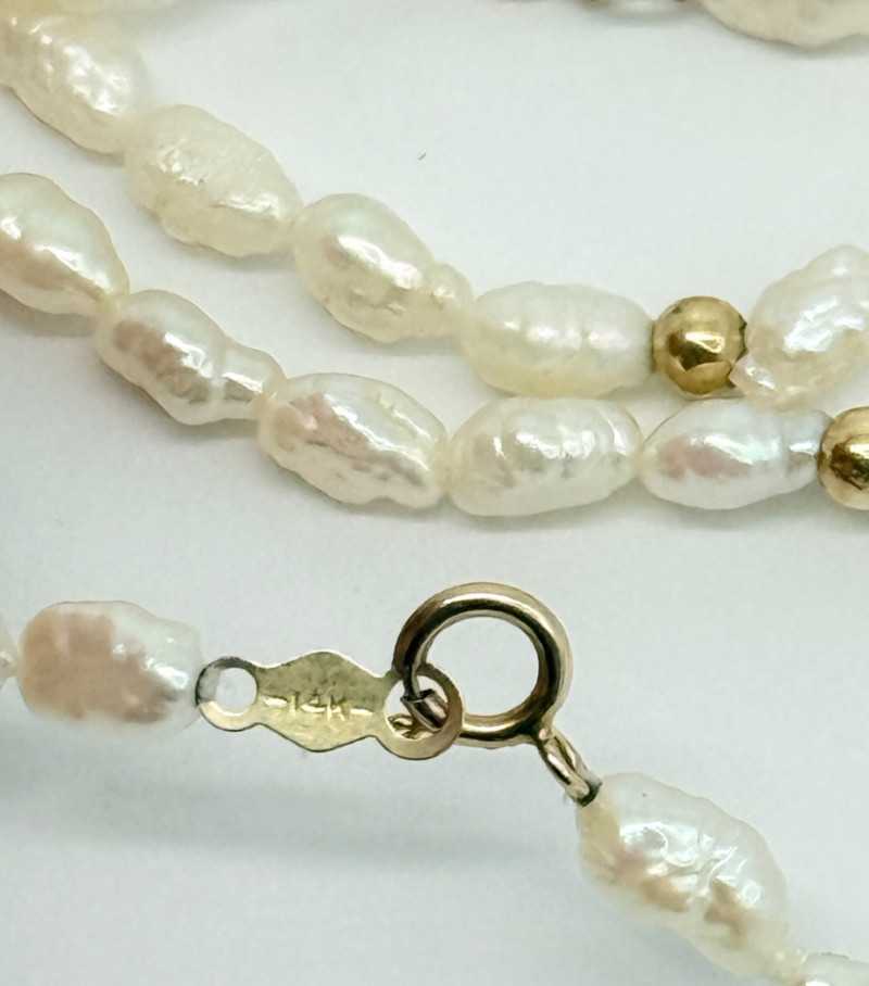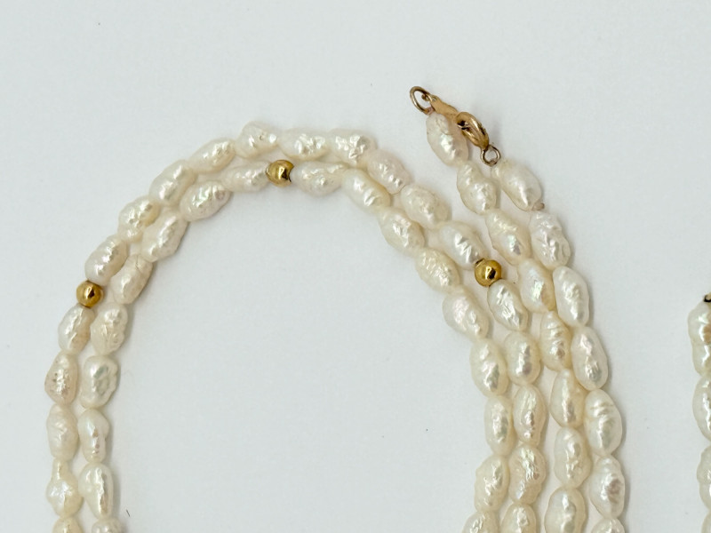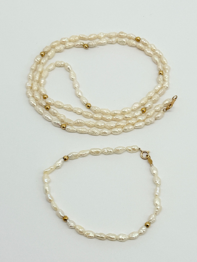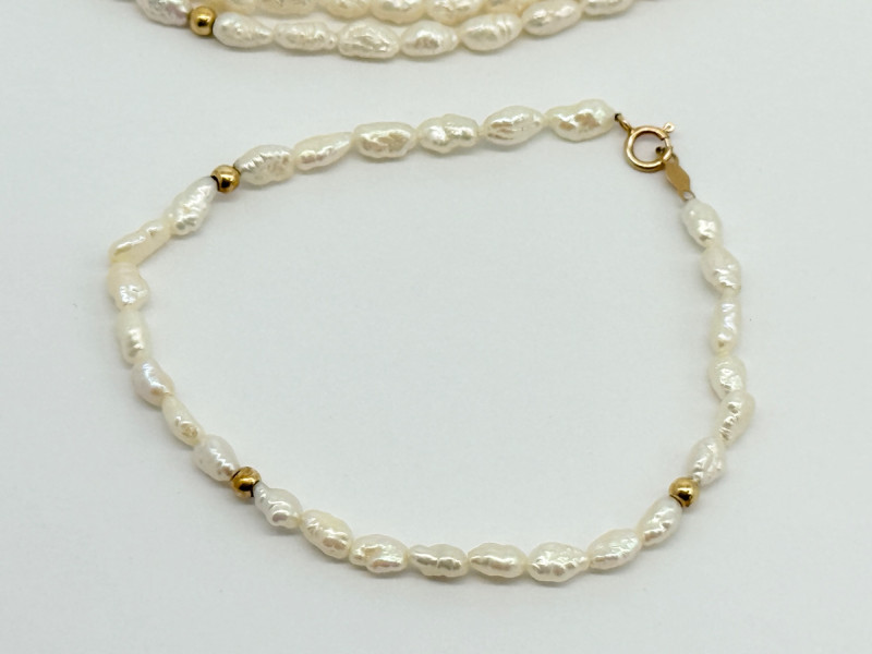 14K Gold Clasp Rice Pearl 20" Necklace & Matching Bracelet Disclaimer: The jewelry in this auction lot has not been tested. By placing a bid, you agree to purchase the item as is, with no guarantees regarding metal quality, content, or purity. Refunds will not be issued on these factors.