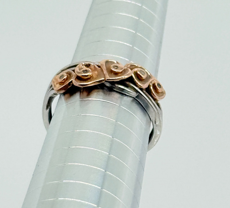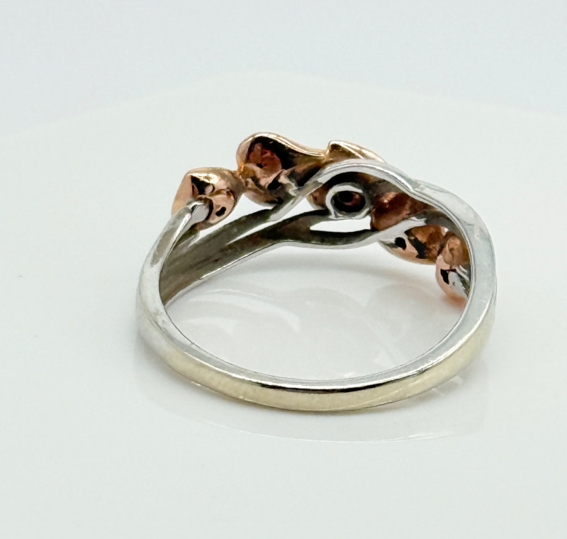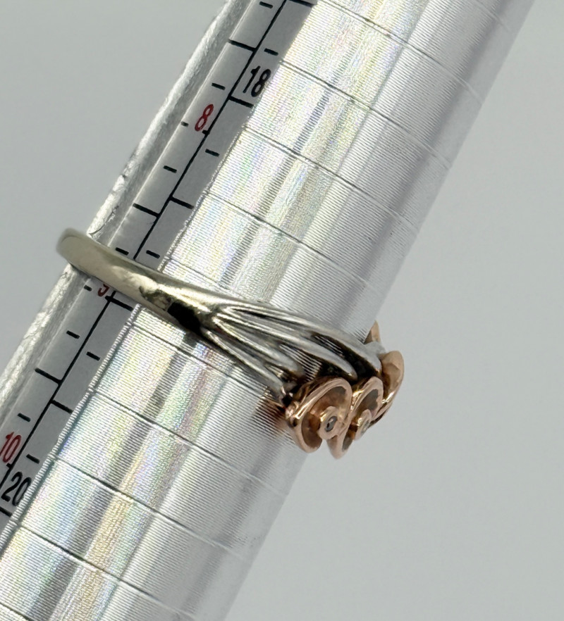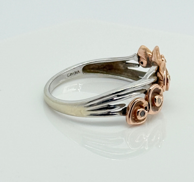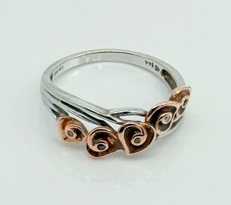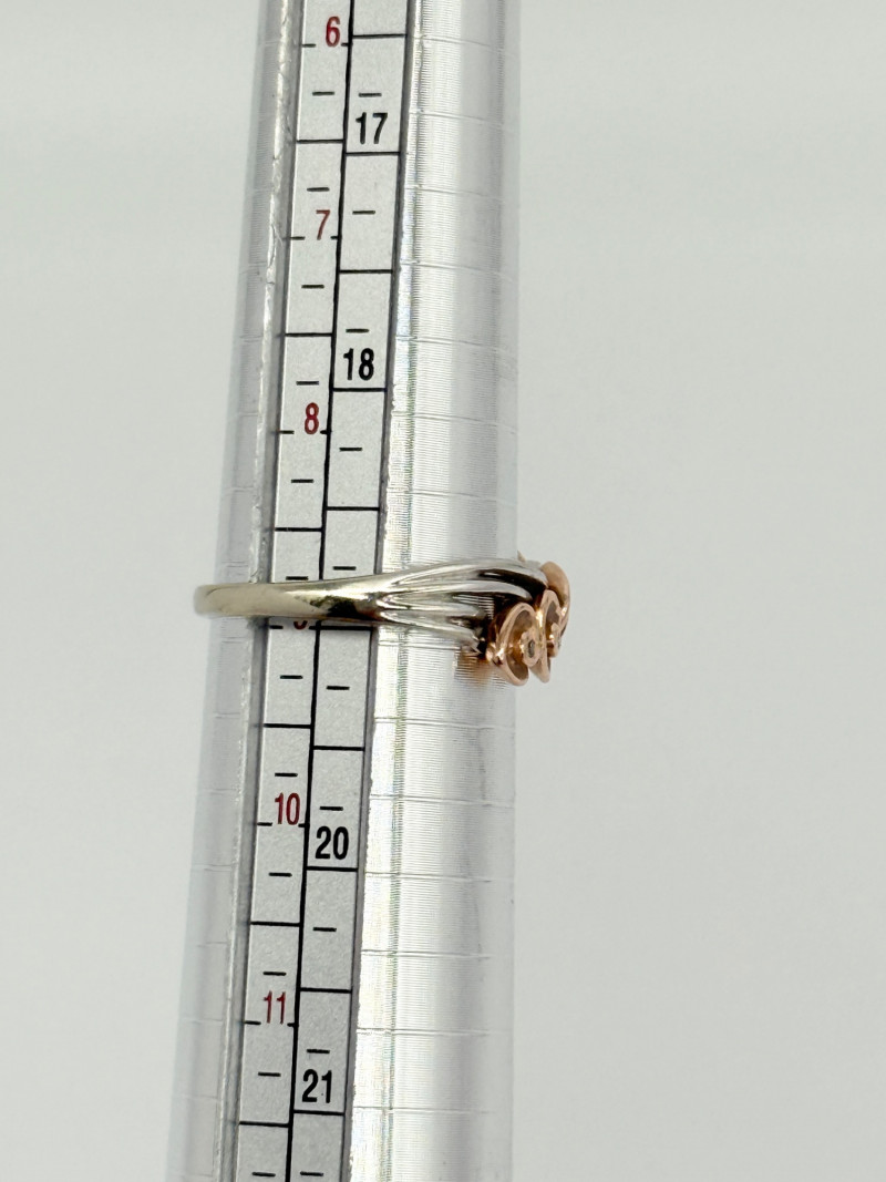 14k White Gold w/ Rose Shaped Rose Gold Diamond Ring, 3.92g Disclaimer: The jewelry in this auction lot has not been tested. By placing a bid, you agree to purchase the item as is, with no guarantees regarding metal quality, content, or purity. Refunds will not be issued on these factors.