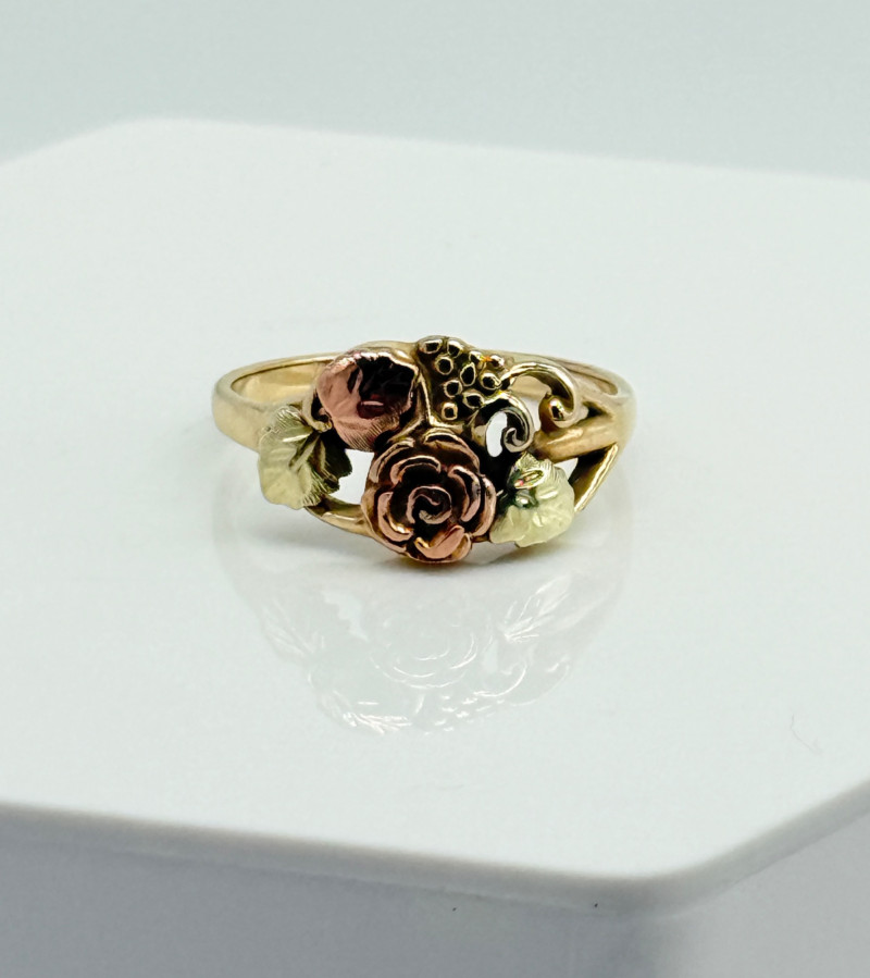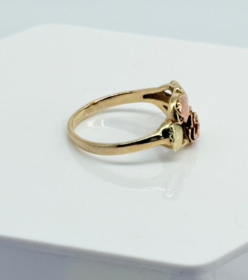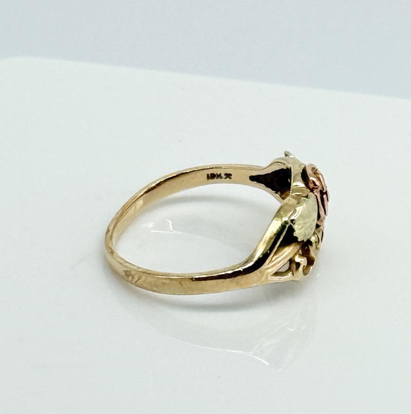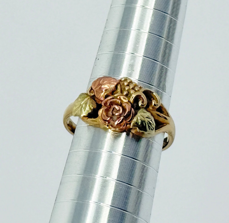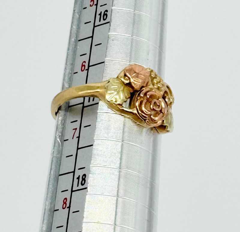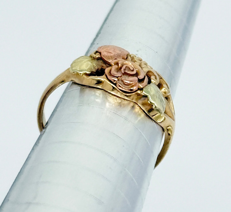 10K Black Hills Gold, Rose & Green Ring, 2.5g Disclaimer: The jewelry in this auction lot has not been tested. By placing a bid, you agree to purchase the item as is, with no guarantees regarding metal quality, content, or purity. Refunds will not be issued on these factors.