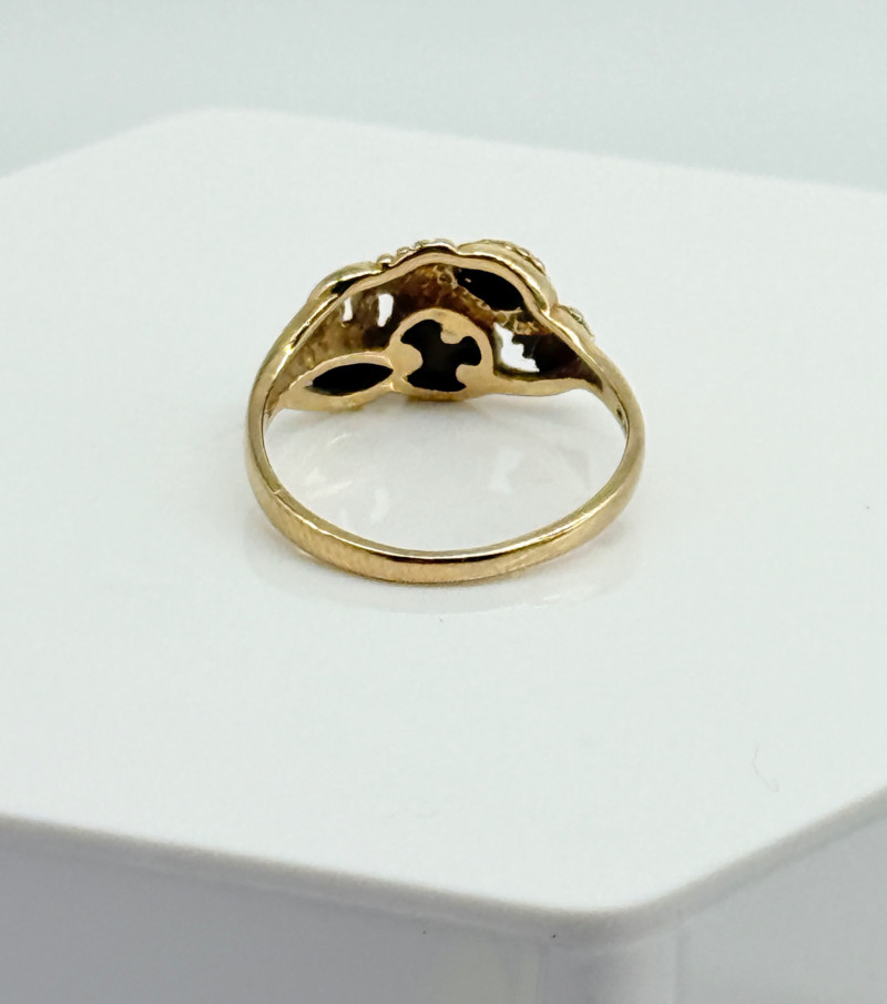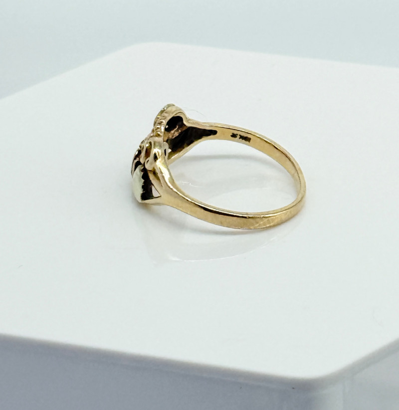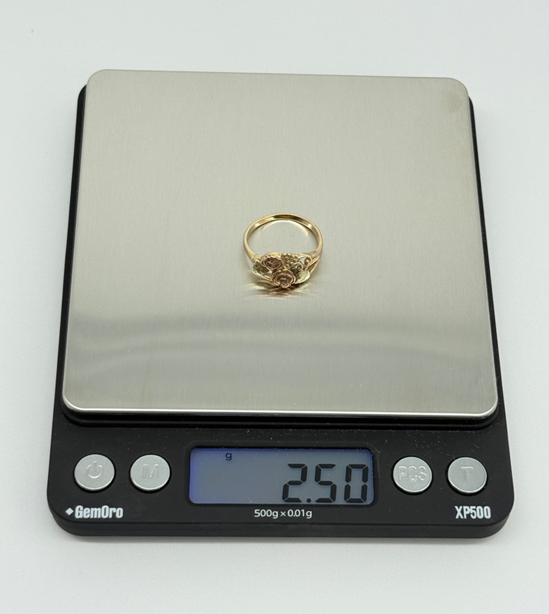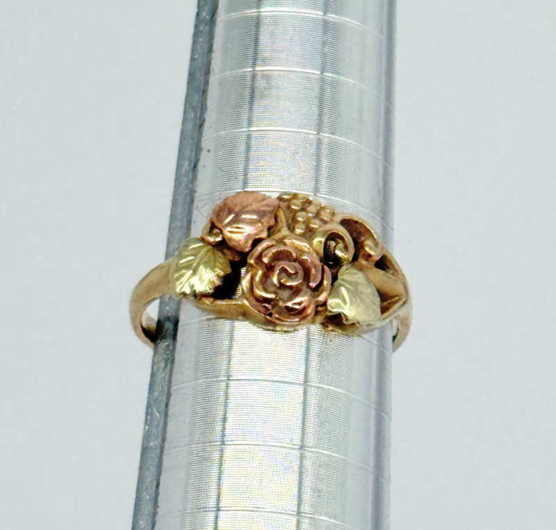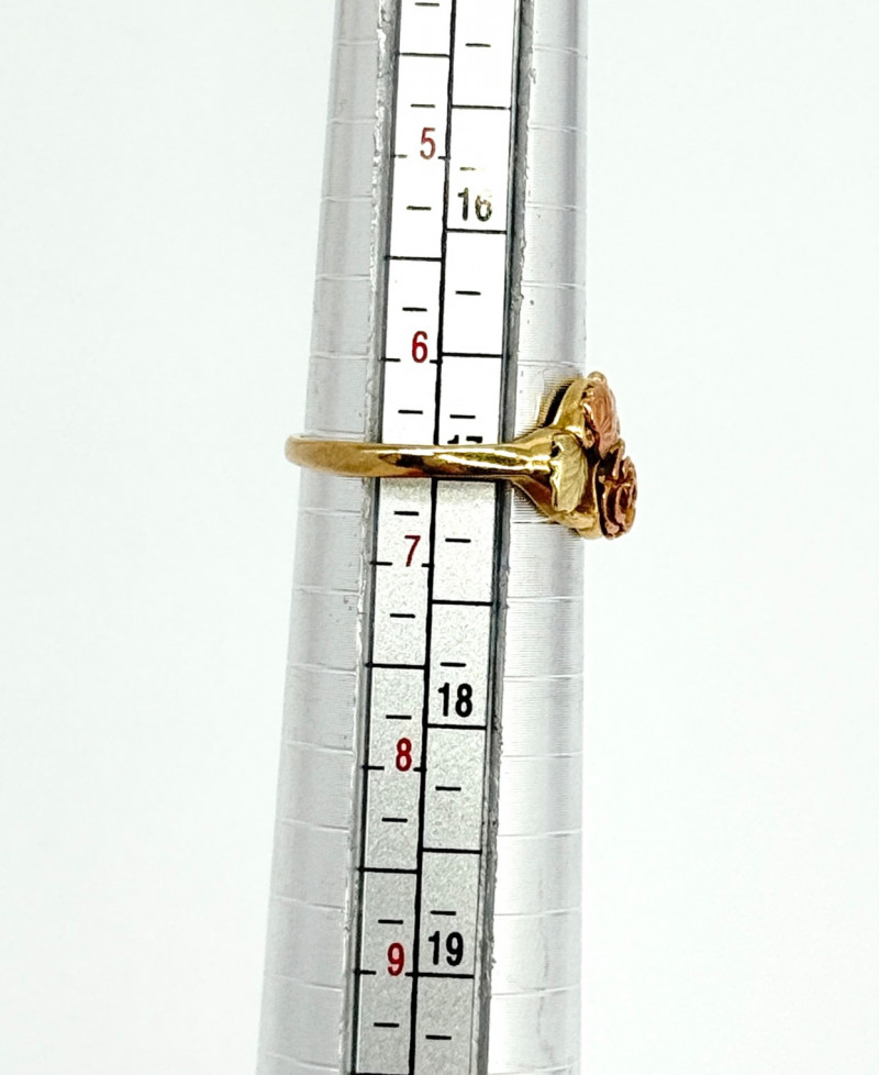 10K Black Hills Gold, Rose & Green Ring, 2.5g Disclaimer: The jewelry in this auction lot has not been tested. By placing a bid, you agree to purchase the item as is, with no guarantees regarding metal quality, content, or purity. Refunds will not be issued on these factors.
