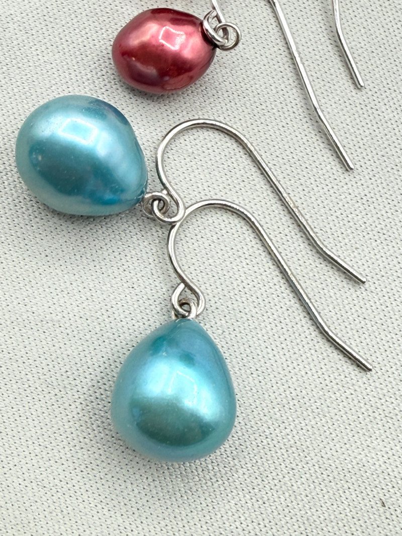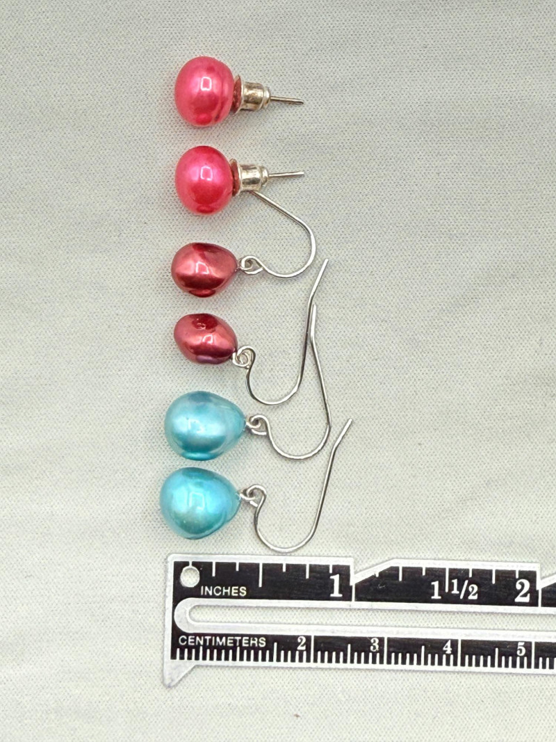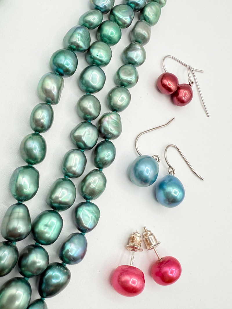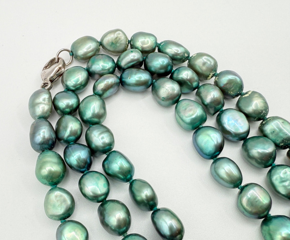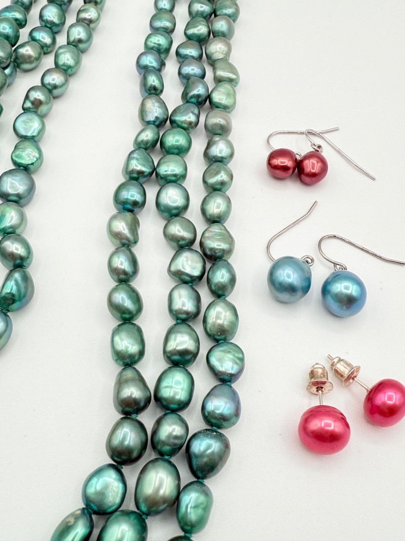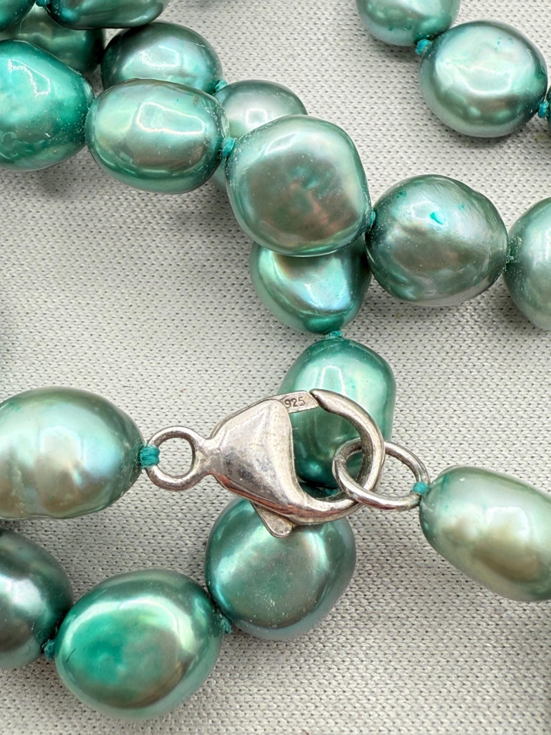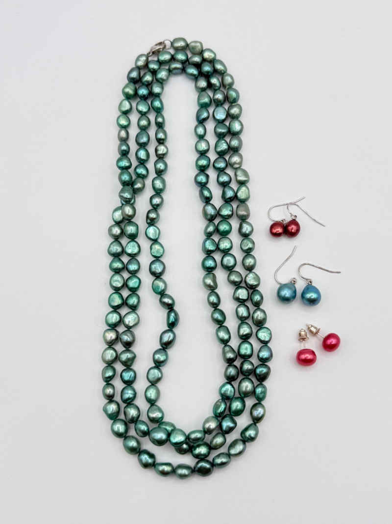 Sterling Teal Green Freshwater Cultured Pearl Necklace + Earrings Disclaimer: The jewelry in this auction lot has not been tested. By placing a bid, you agree to purchase the item as is, with no guarantees regarding metal quality, content, or purity. Refunds will not be issued on these factors.