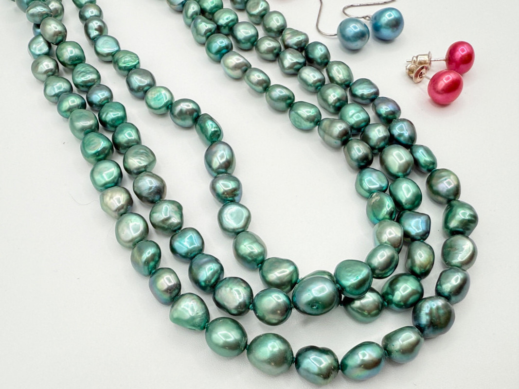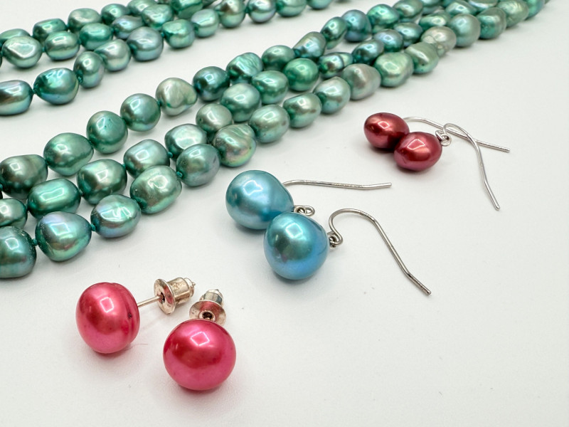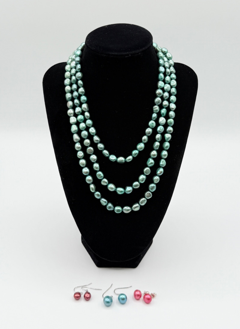 Lot # 62 - Sterling Teal Green Freshwater Cultured Pearl Necklace + Earrings