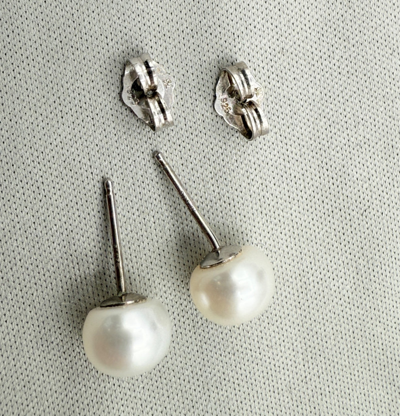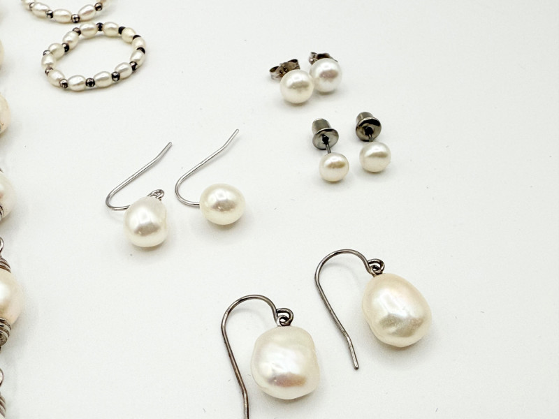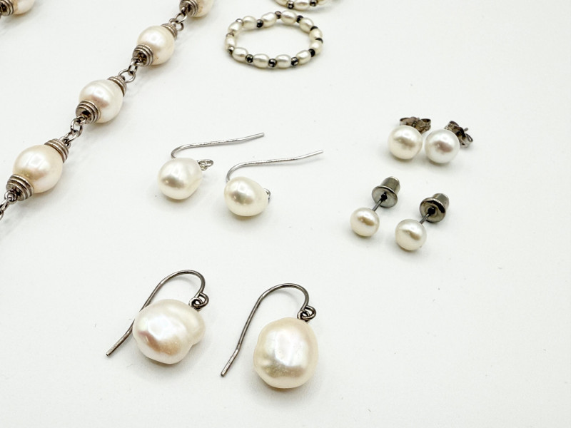 Lot # 135 - Sterling White Cultured Pearl Necklace, Rings & Earrings