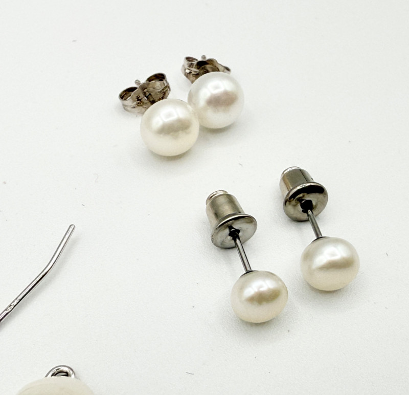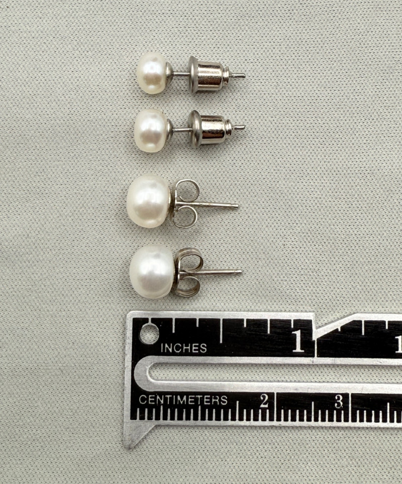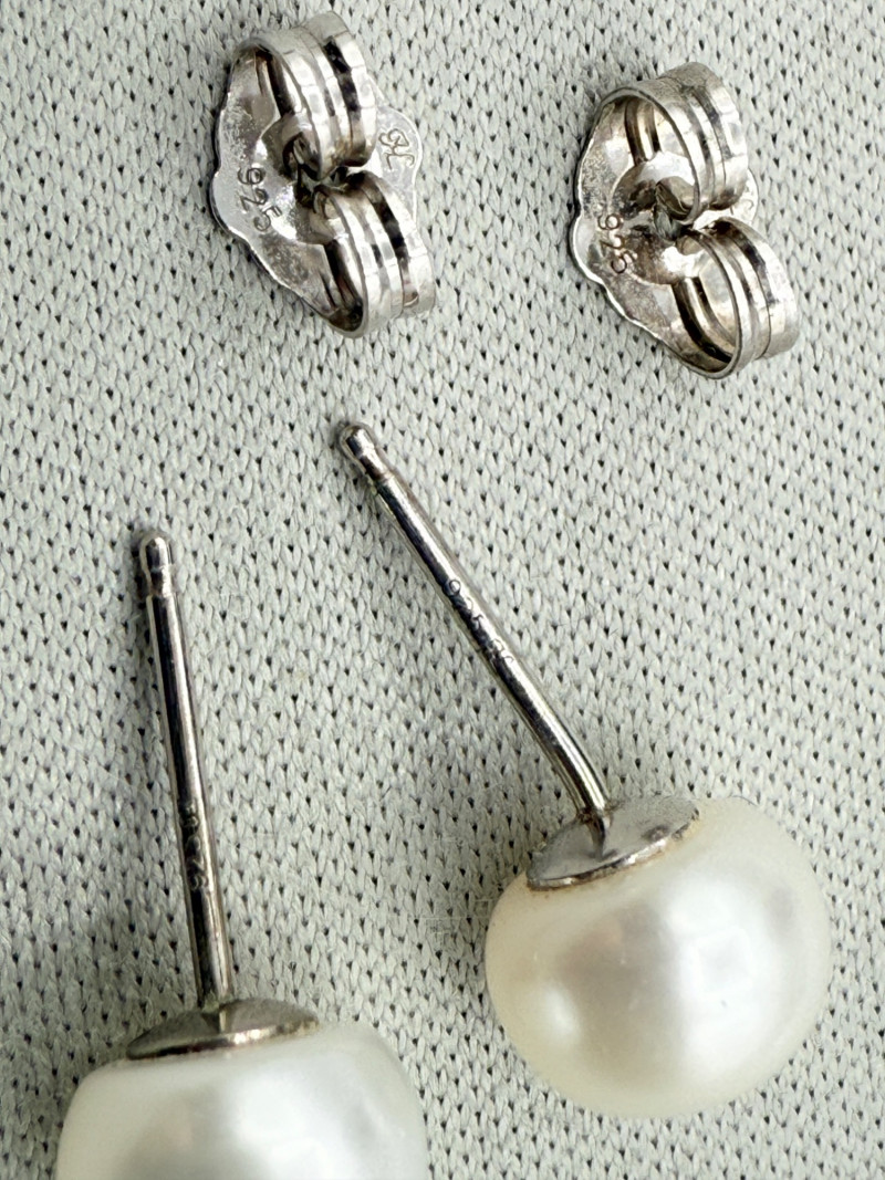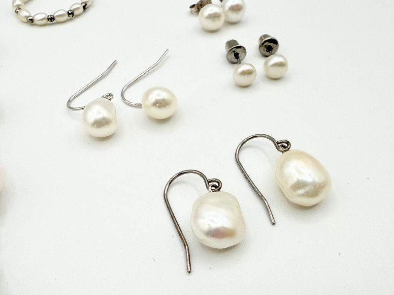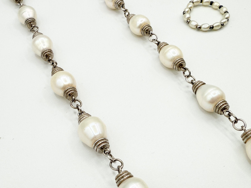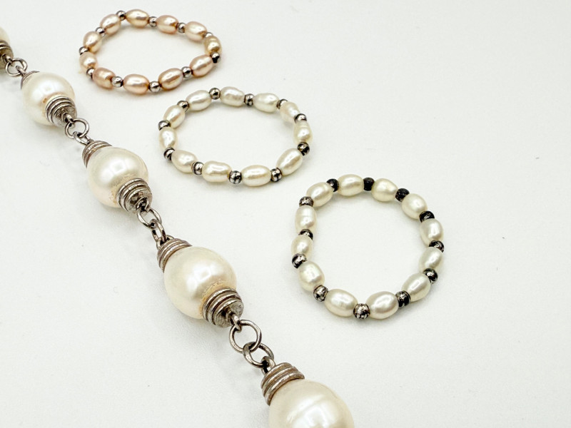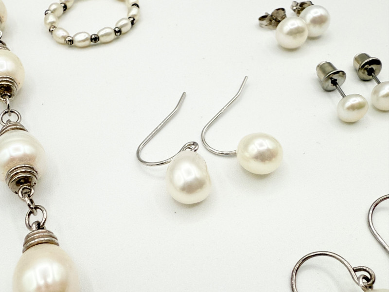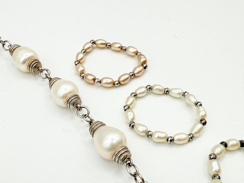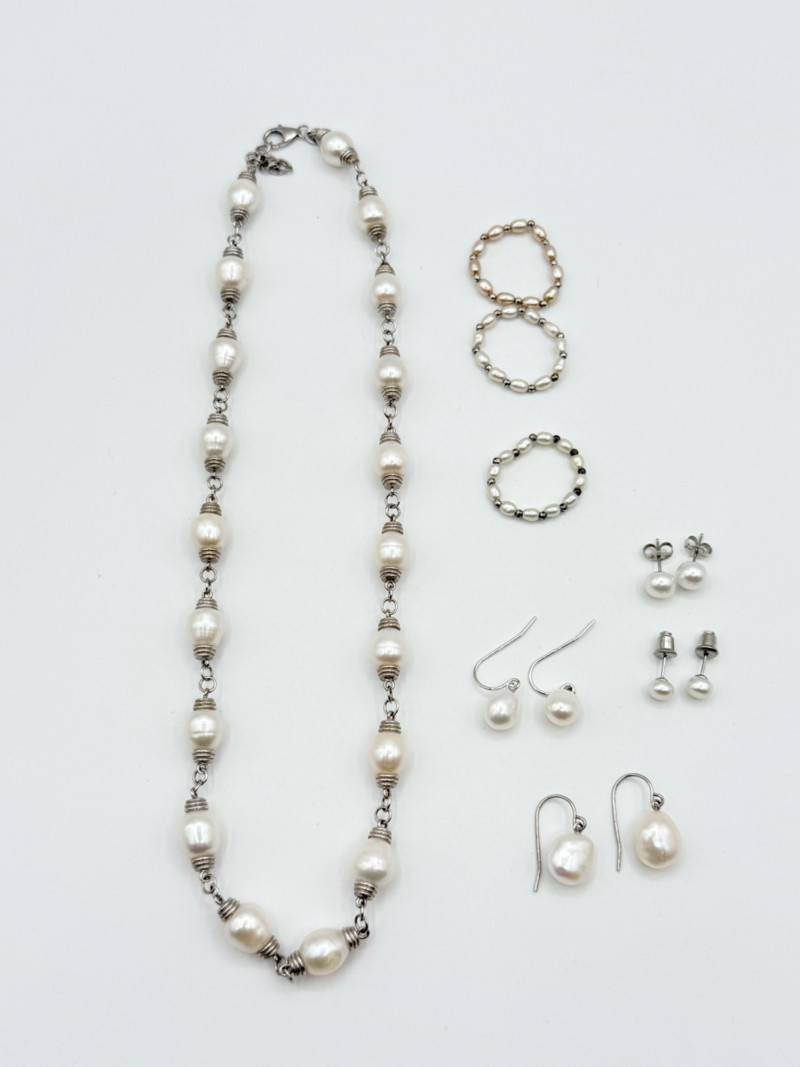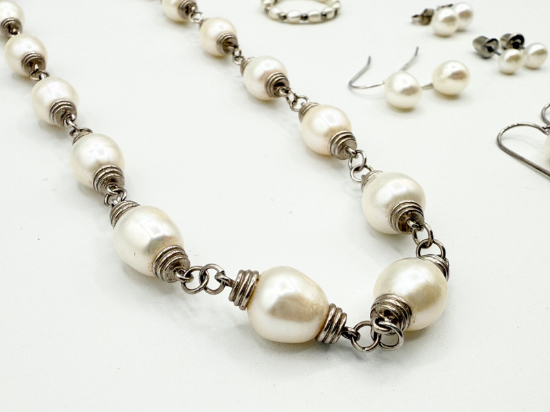 Sterling White Cultured Pearl Necklace, Rings & Earrings Disclaimer: The jewelry in this auction lot has not been tested. By placing a bid, you agree to purchase the item as is, with no guarantees regarding metal quality, content, or purity. Refunds will not be issued on these factors.