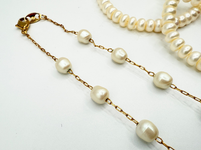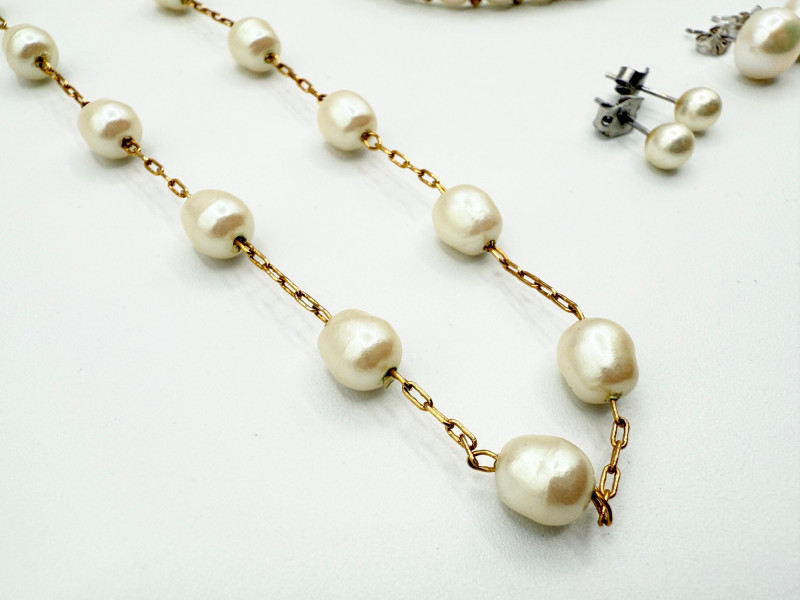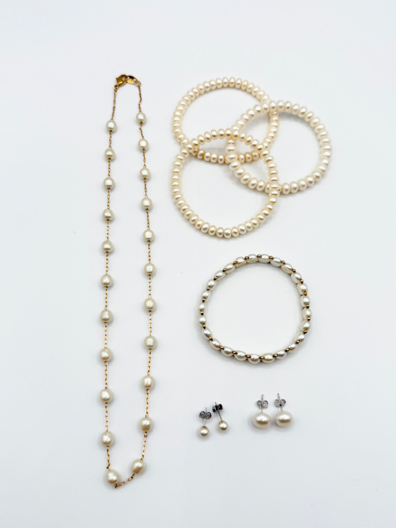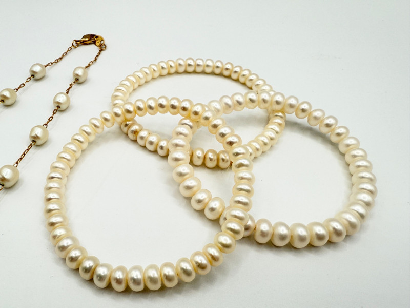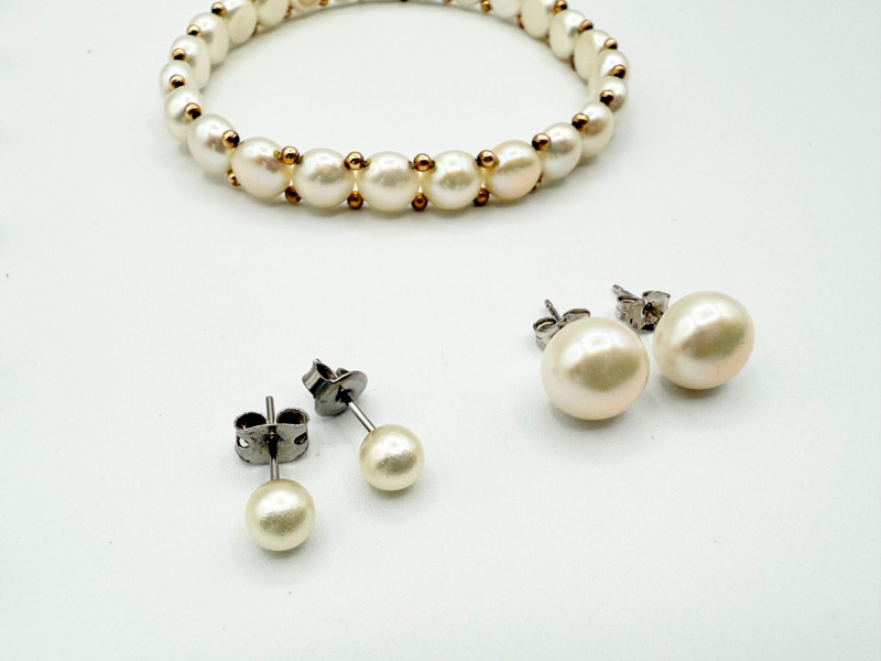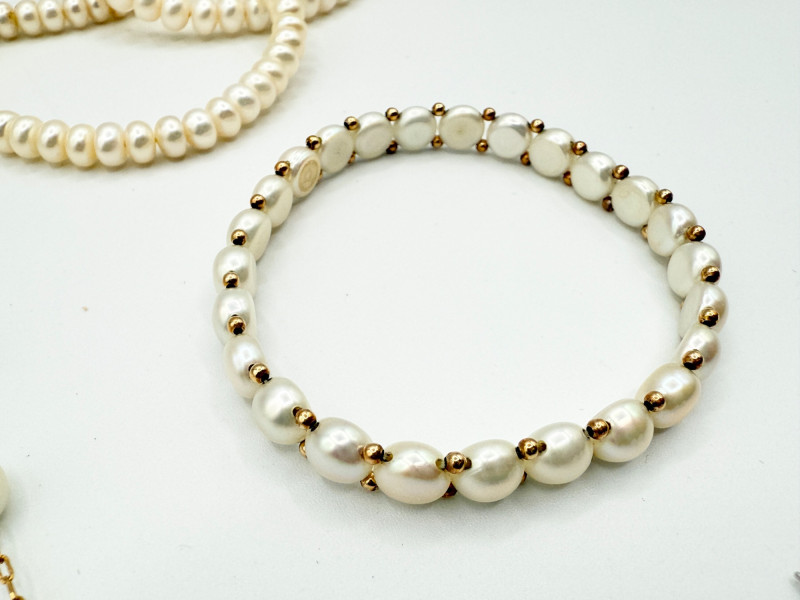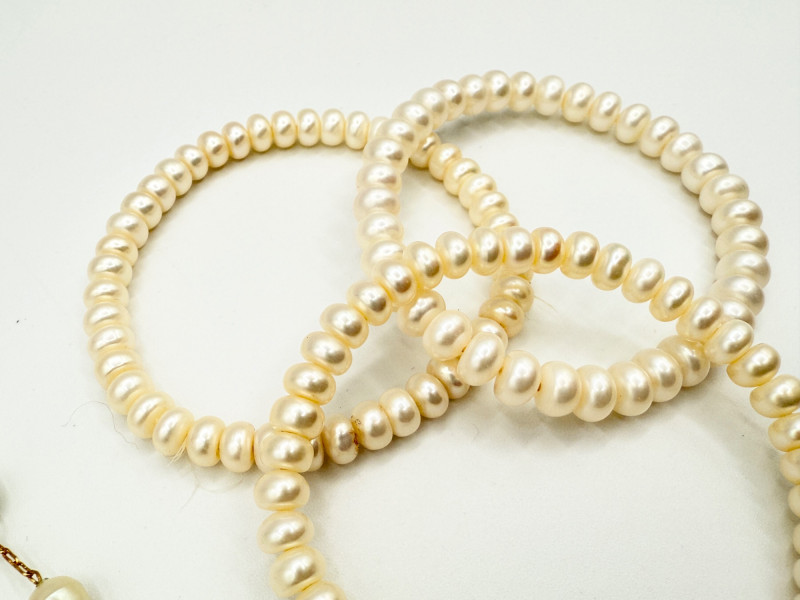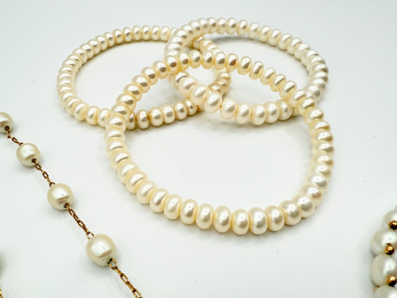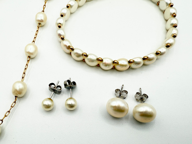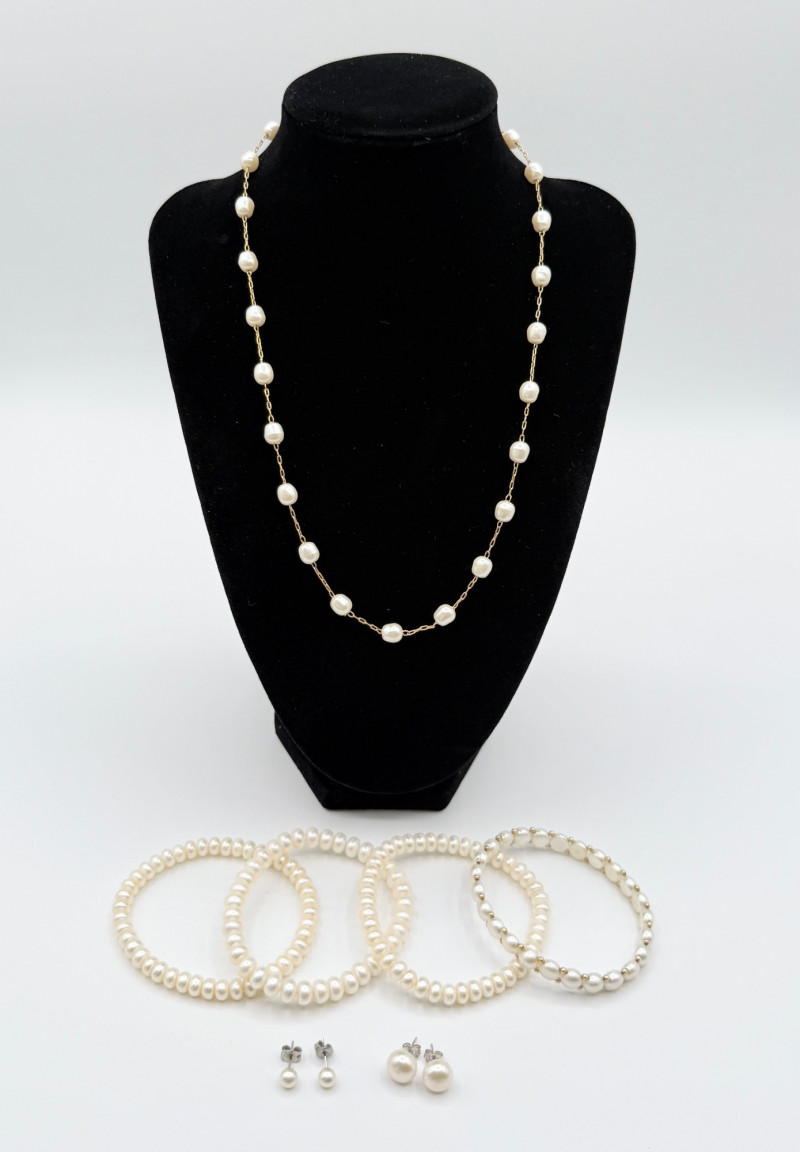 Costume Jewelry: Pearl Necklace, Bracelets & Earrings Disclaimer: The jewelry in this auction lot has not been tested. By placing a bid, you agree to purchase the item as is, with no guarantees regarding metal quality, content, or purity. Refunds will not be issued on these factors.