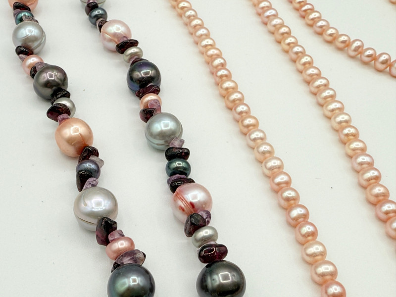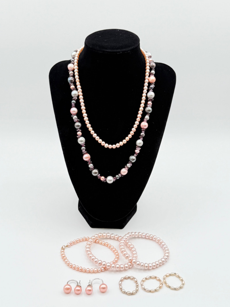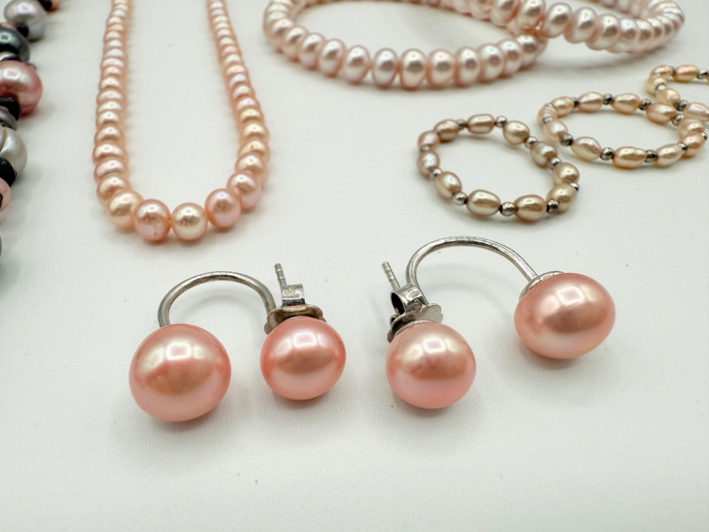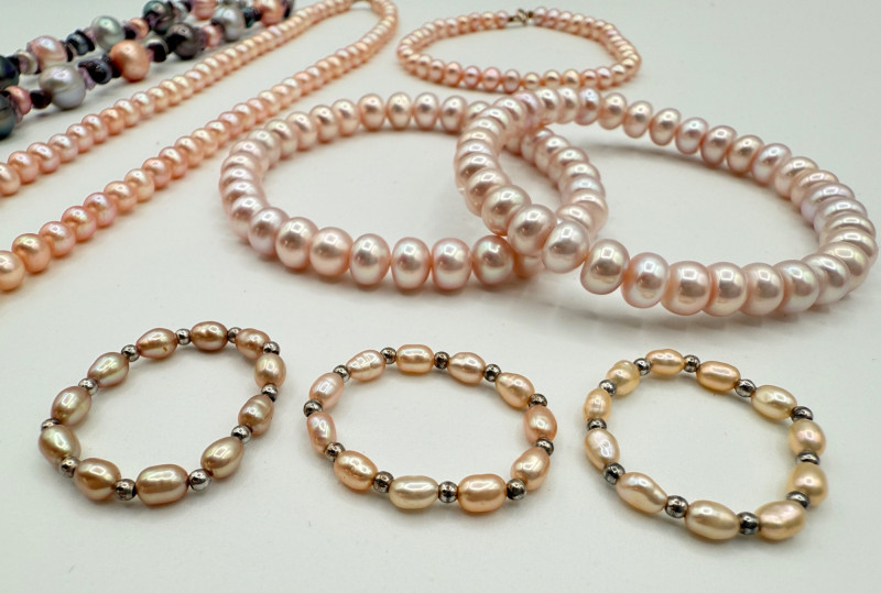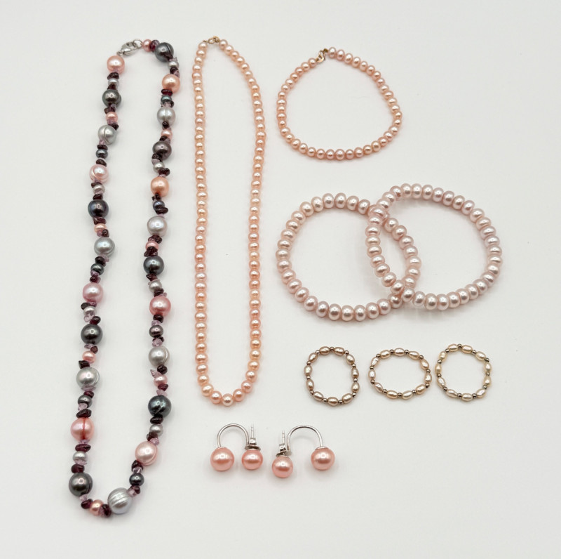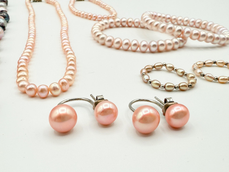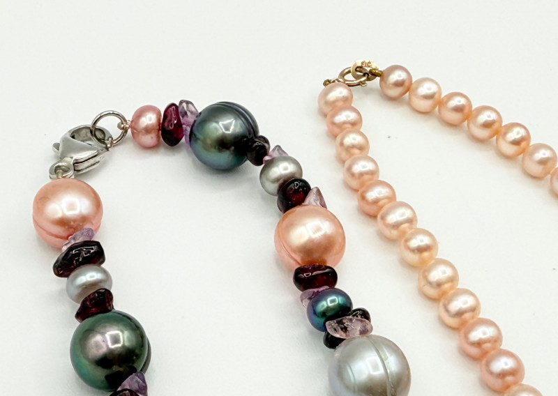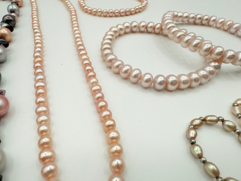 10K Clasp Pink Pearl + Multi Colored Pearl Gemstone Necklace & More Disclaimer: The jewelry in this auction lot has not been tested. By placing a bid, you agree to purchase the item as is, with no guarantees regarding metal quality, content, or purity. Refunds will not be issued on these factors.