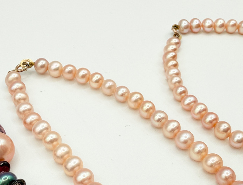 Lot # 24 - 10K Clasp Pink Pearl + Multi Colored Pearl Gemstone Necklace & More