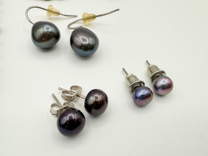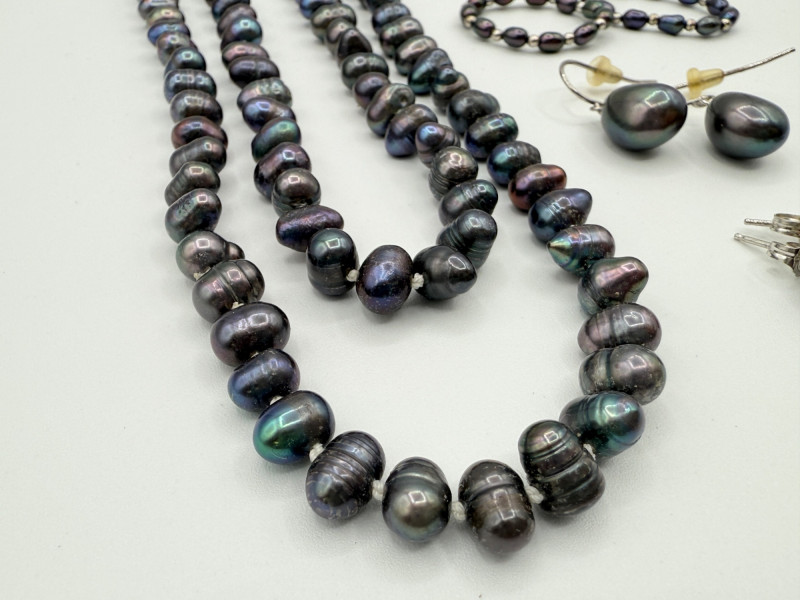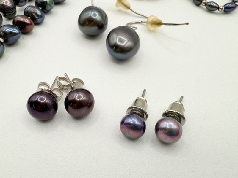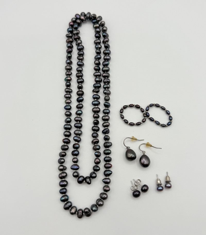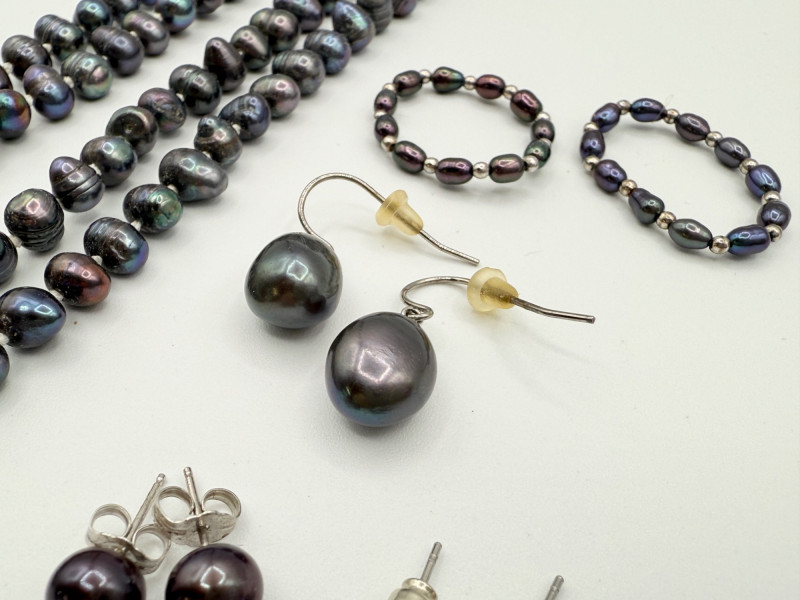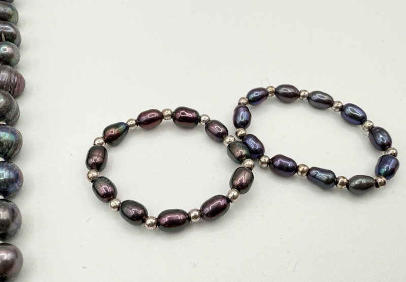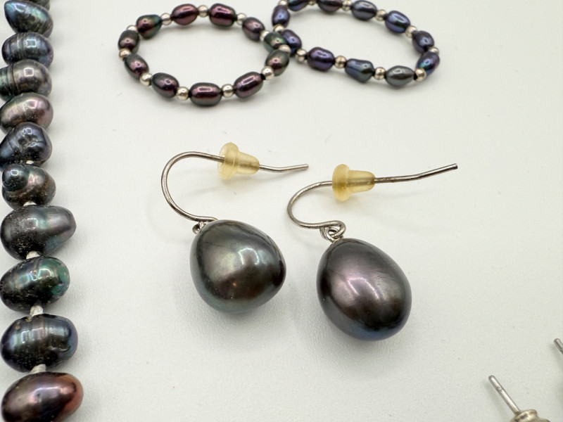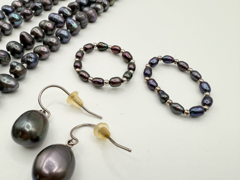 Cultured Tahitian Pearl Necklace, Rings & Sterling Earrings Disclaimer: The jewelry in this auction lot has not been tested. By placing a bid, you agree to purchase the item as is, with no guarantees regarding metal quality, content, or purity. Refunds will not be issued on these factors.
