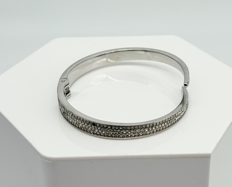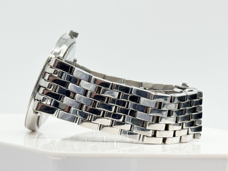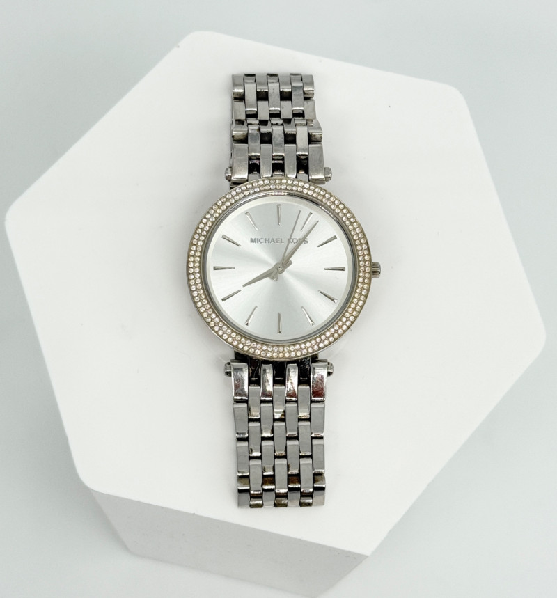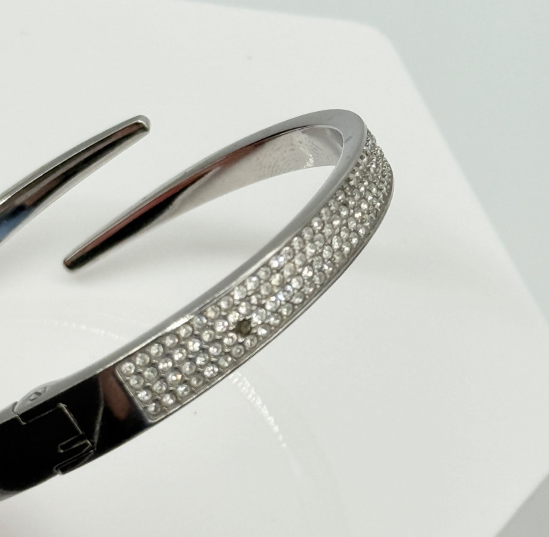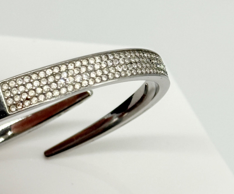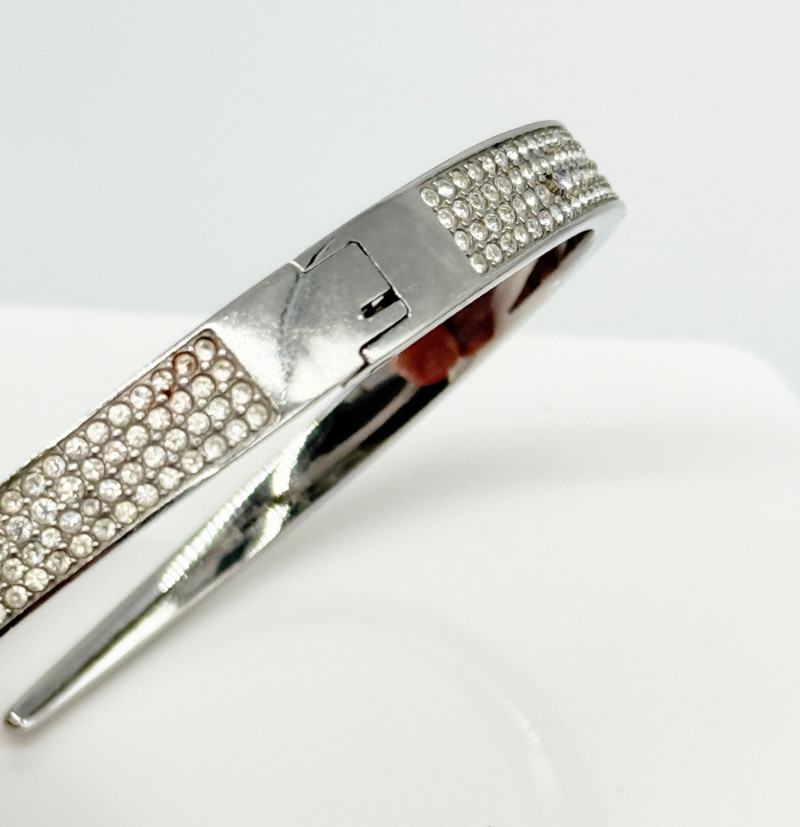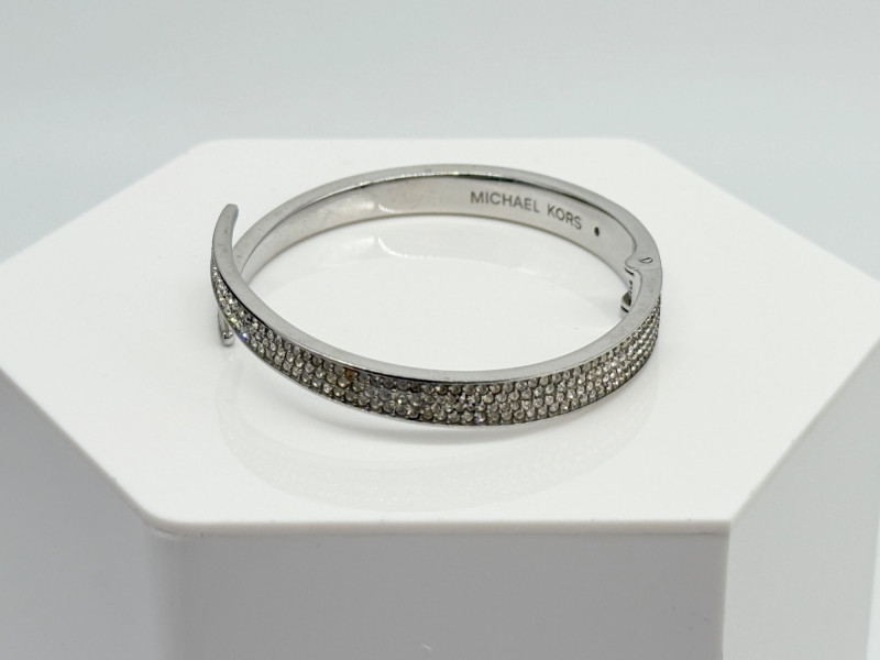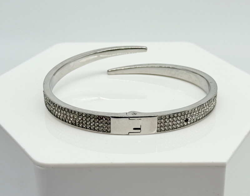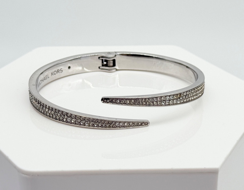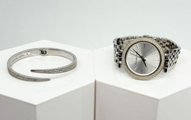 Michael Kros Stainless Steel Watch + Matchstick Pave Silver-Tone Cuff Disclaimer: The jewelry in this auction lot has not been tested. By placing a bid, you agree to purchase the item as is, with no guarantees regarding metal quality, content, or purity. Refunds will not be issued on these factors.
