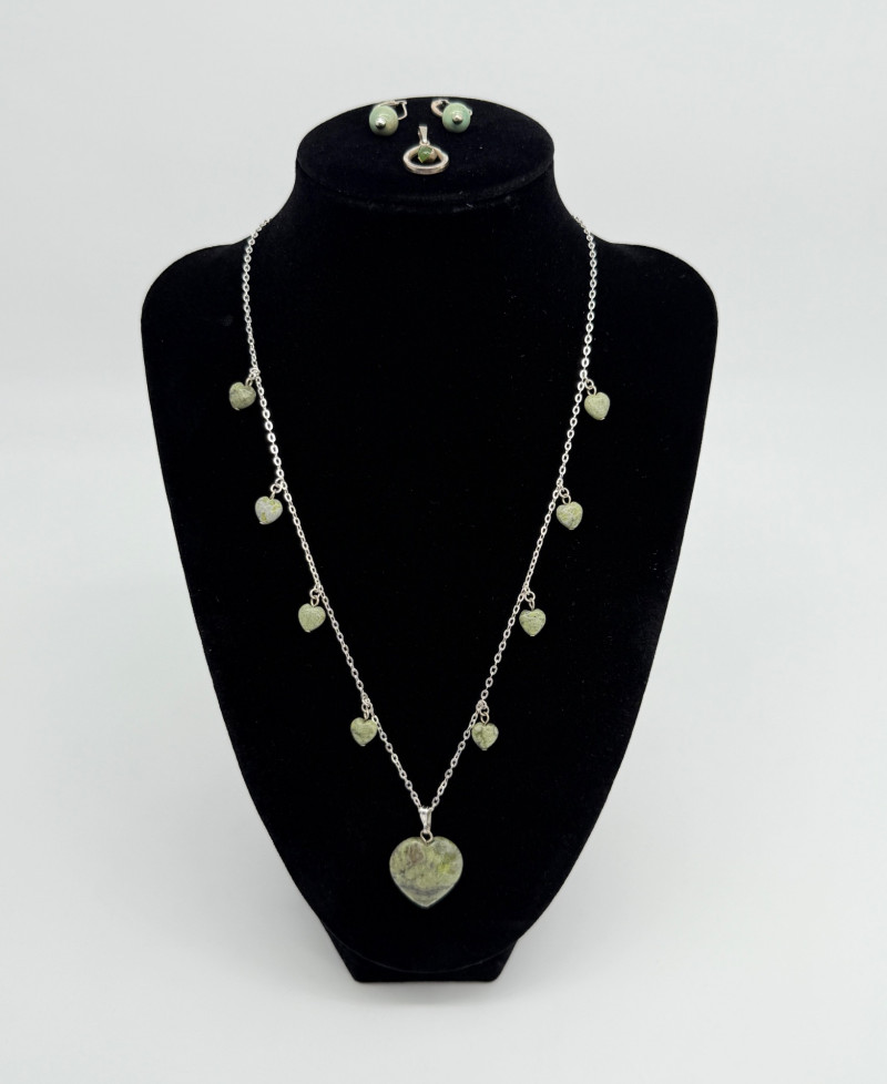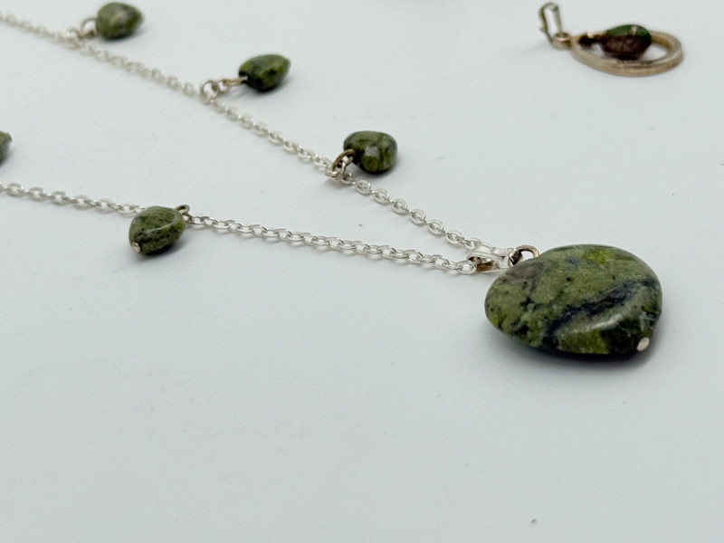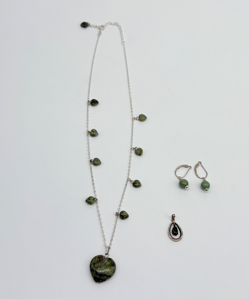 Sterling Connemata Marble Necklace, Turquoise Earrings + Jade Pendant Disclaimer: The jewelry in this auction lot has not been tested. By placing a bid, you agree to purchase the item as is, with no guarantees regarding metal quality, content, or purity. Refunds will not be issued on these factors.