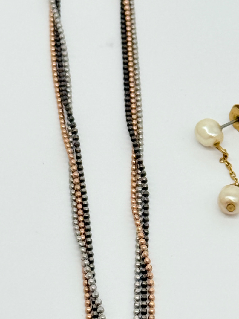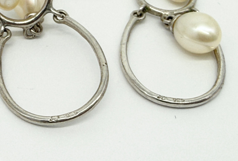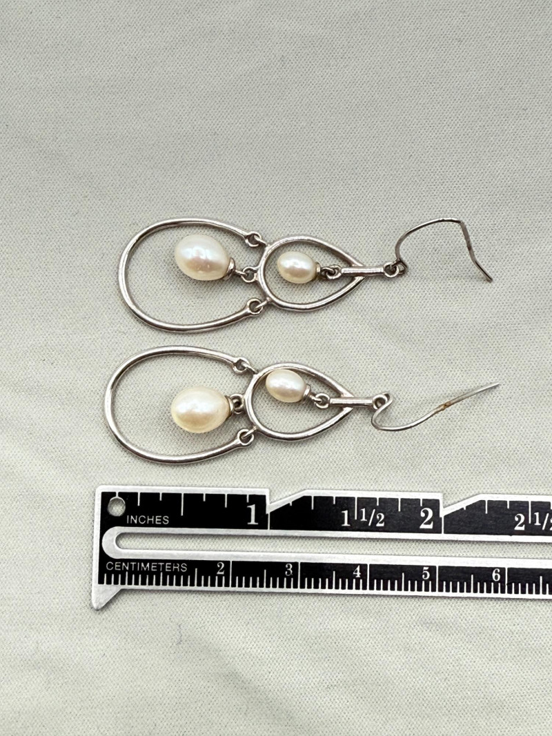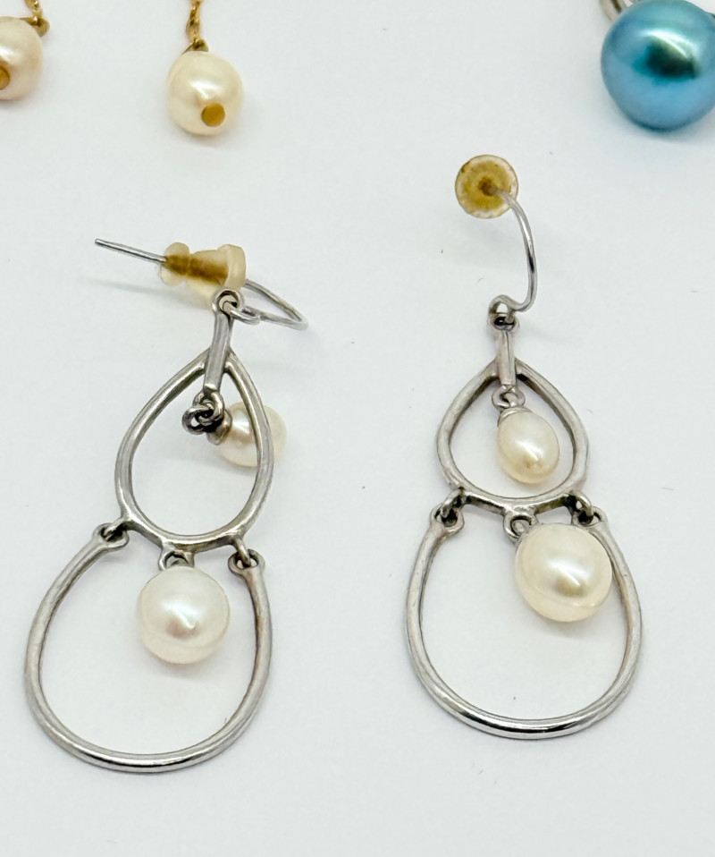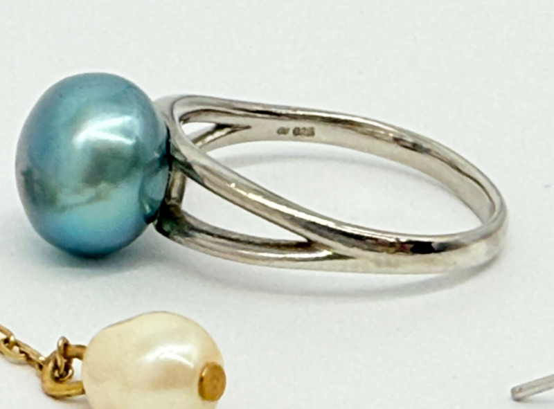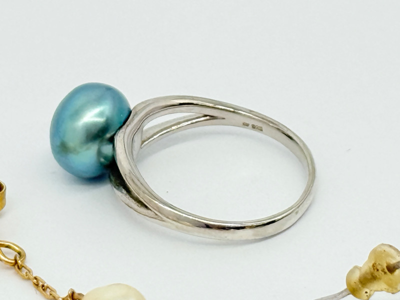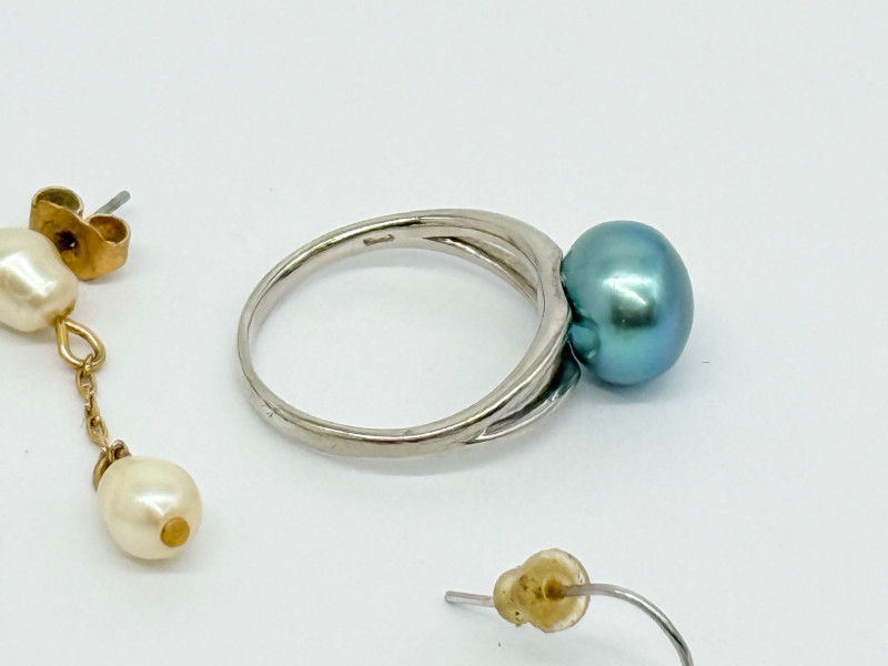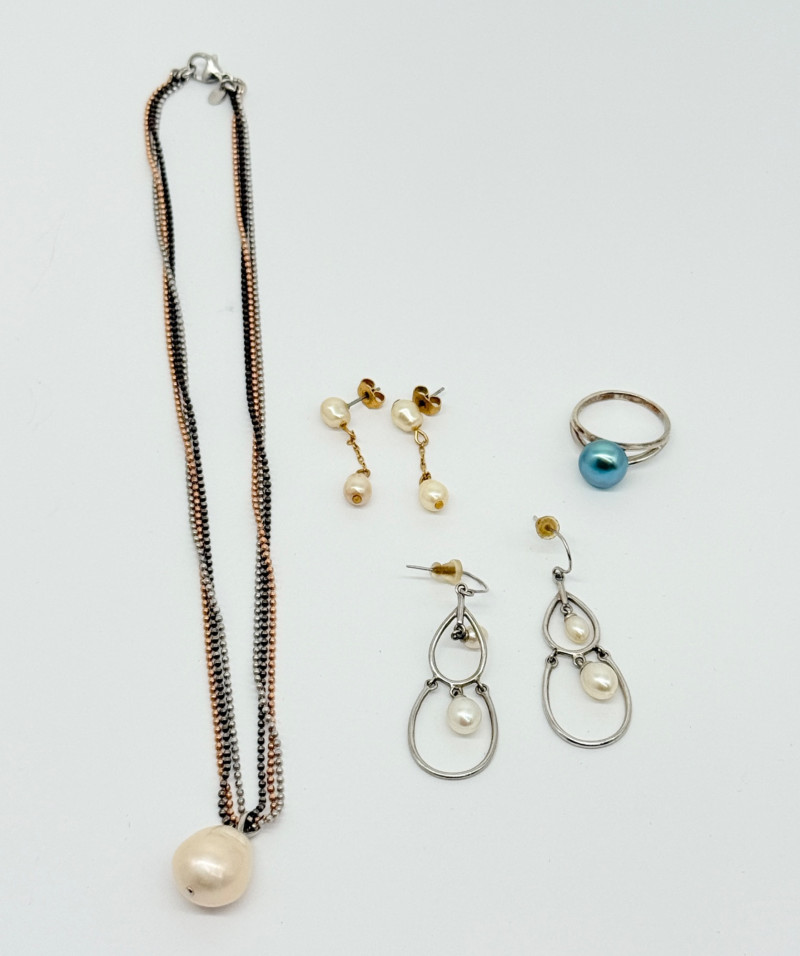 Sterling Pearl Necklace, Ring + Earrings Disclaimer: The jewelry in this auction lot has not been tested. By placing a bid, you agree to purchase the item as is, with no guarantees regarding metal quality, content, or purity. Refunds will not be issued on these factors.