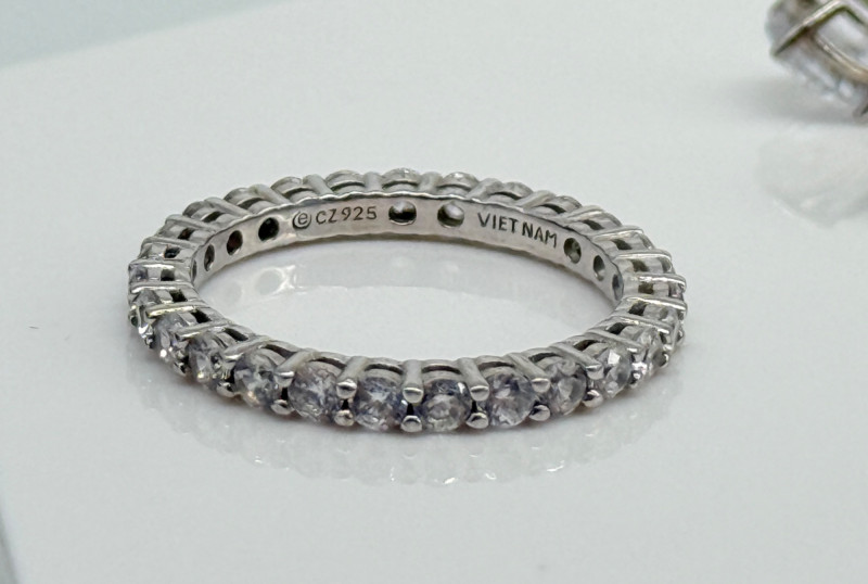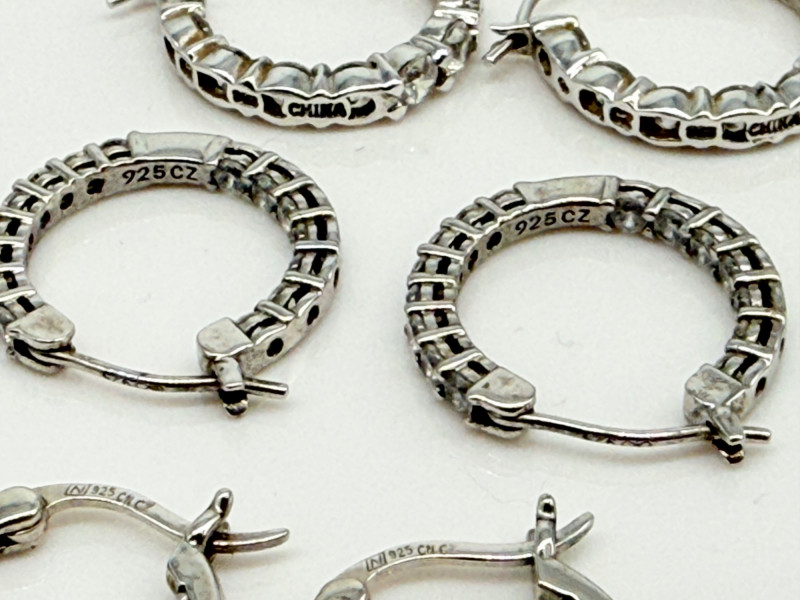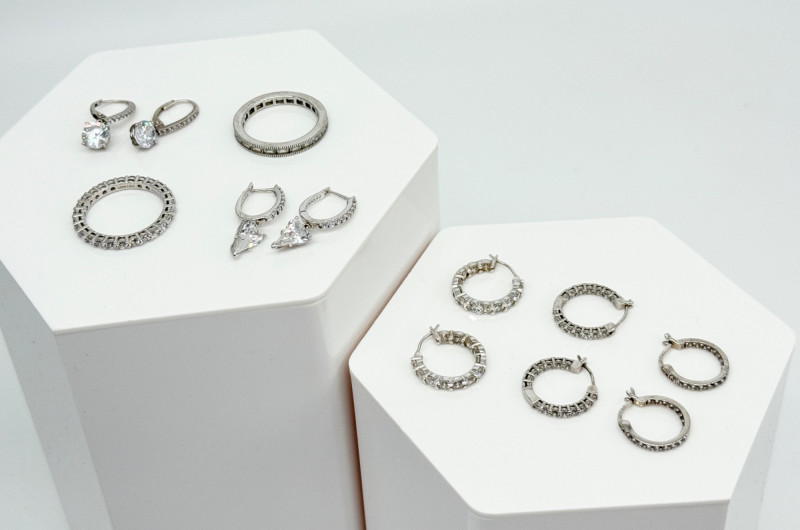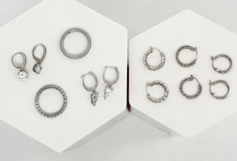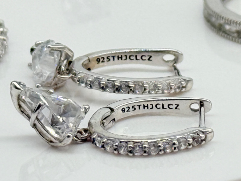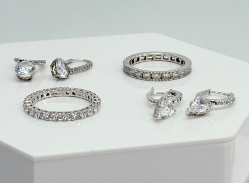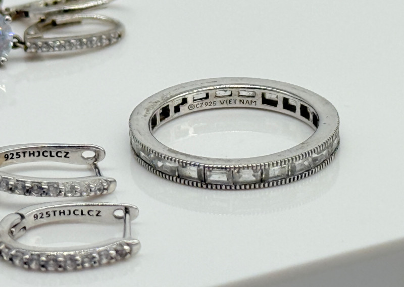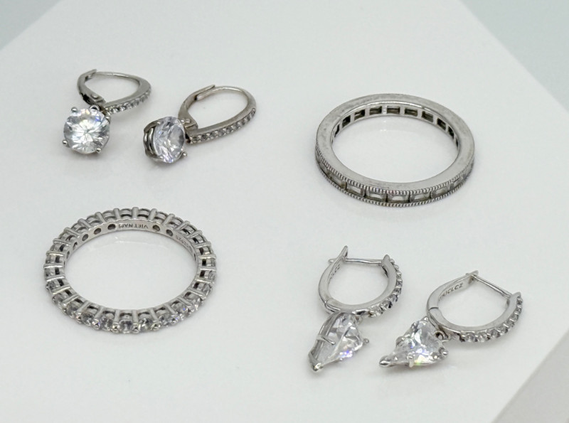 CZ Diamond Sterling Rings & Earrings Disclaimer: The jewelry in this auction lot has not been tested. By placing a bid, you agree to purchase the item as is, with no guarantees regarding metal quality, content, or purity. Refunds will not be issued on these factors.