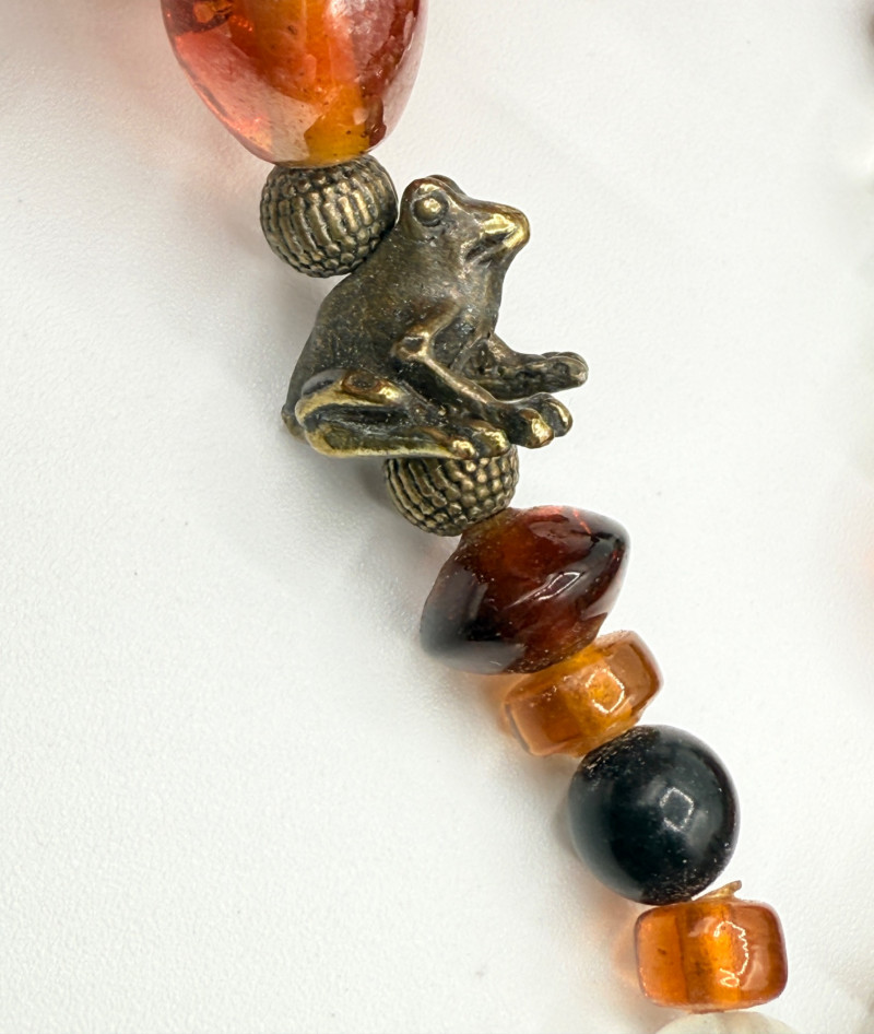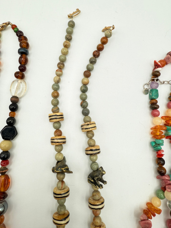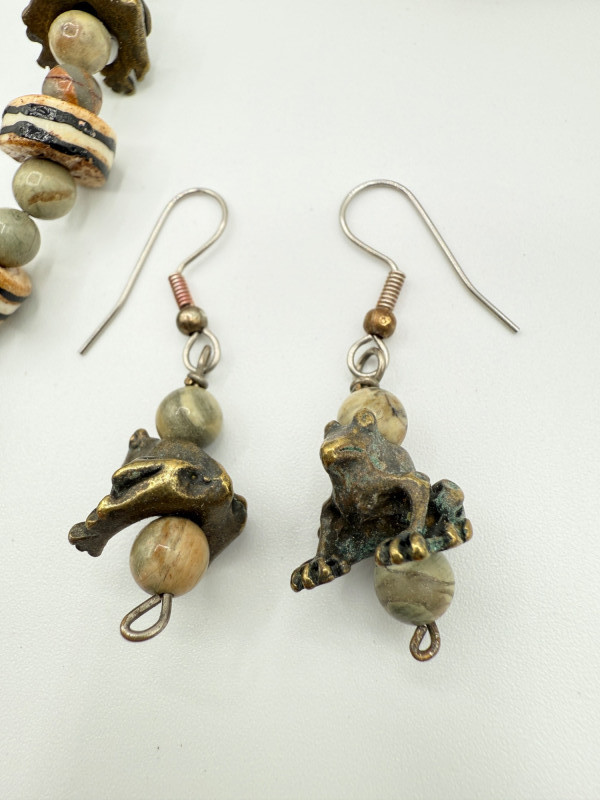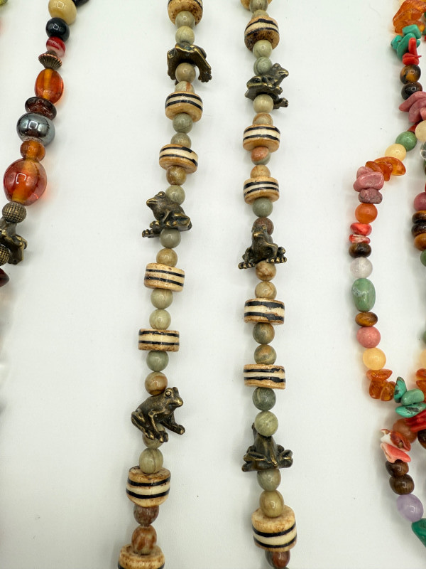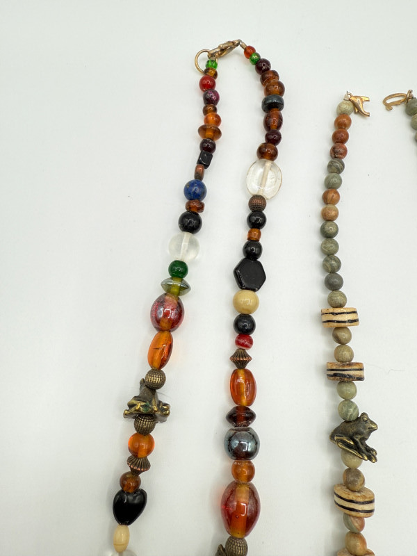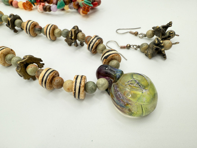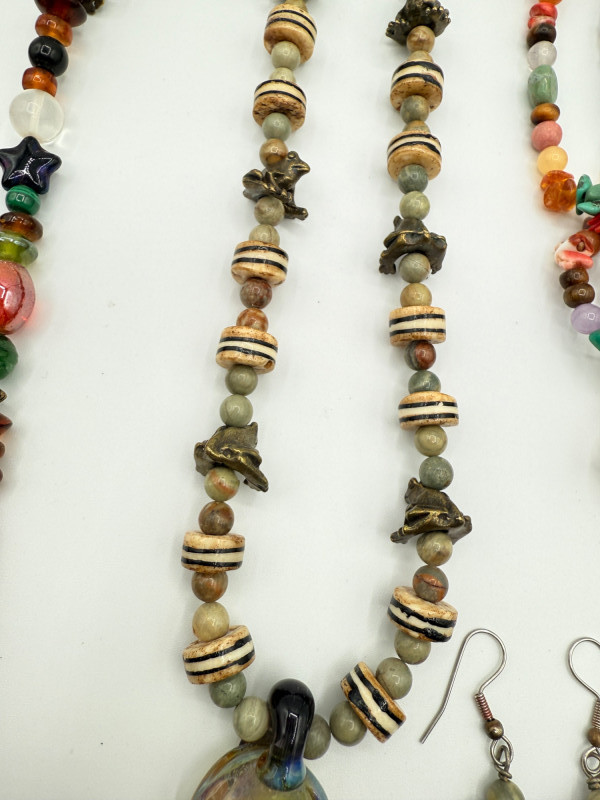 Mixed Beaded Necklaces w/ Frog Charms, Glass Pendant + Earrings Disclaimer: The jewelry in this auction lot has not been tested. By placing a bid, you agree to purchase the item as is, with no guarantees regarding metal quality, content, or purity. Refunds will not be issued on these factors.