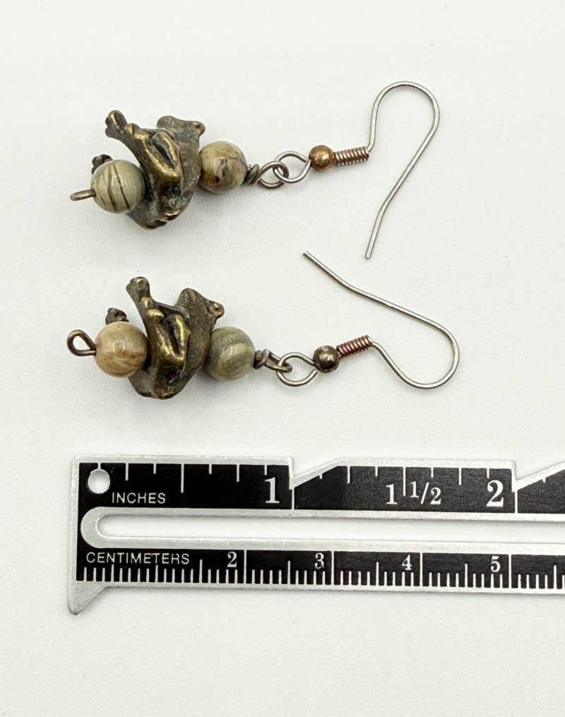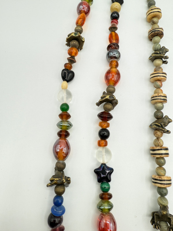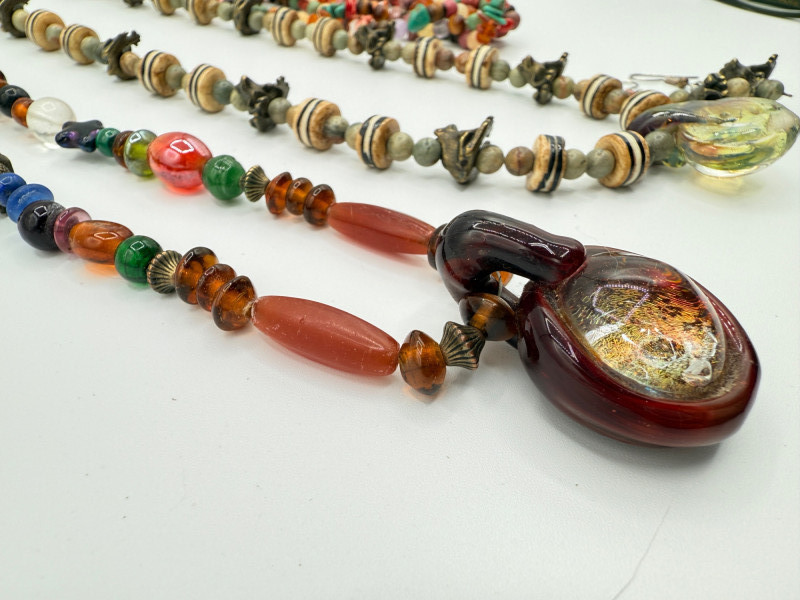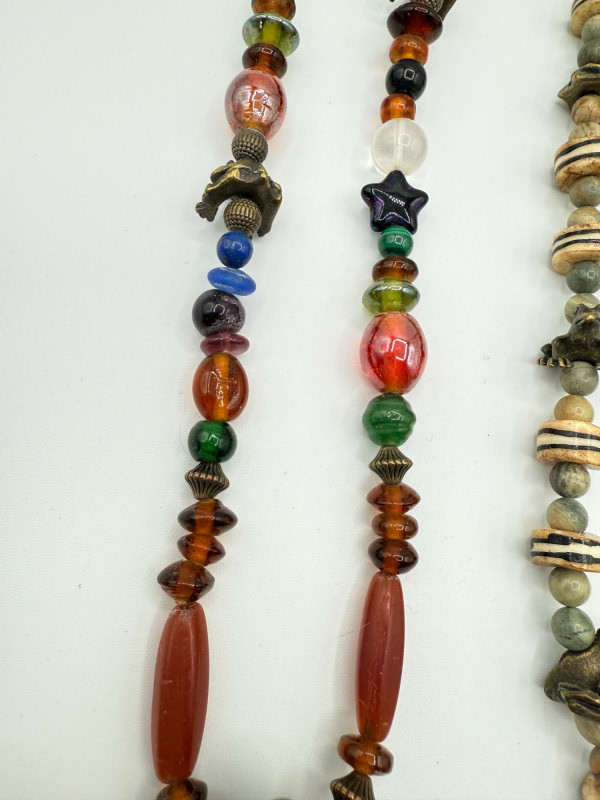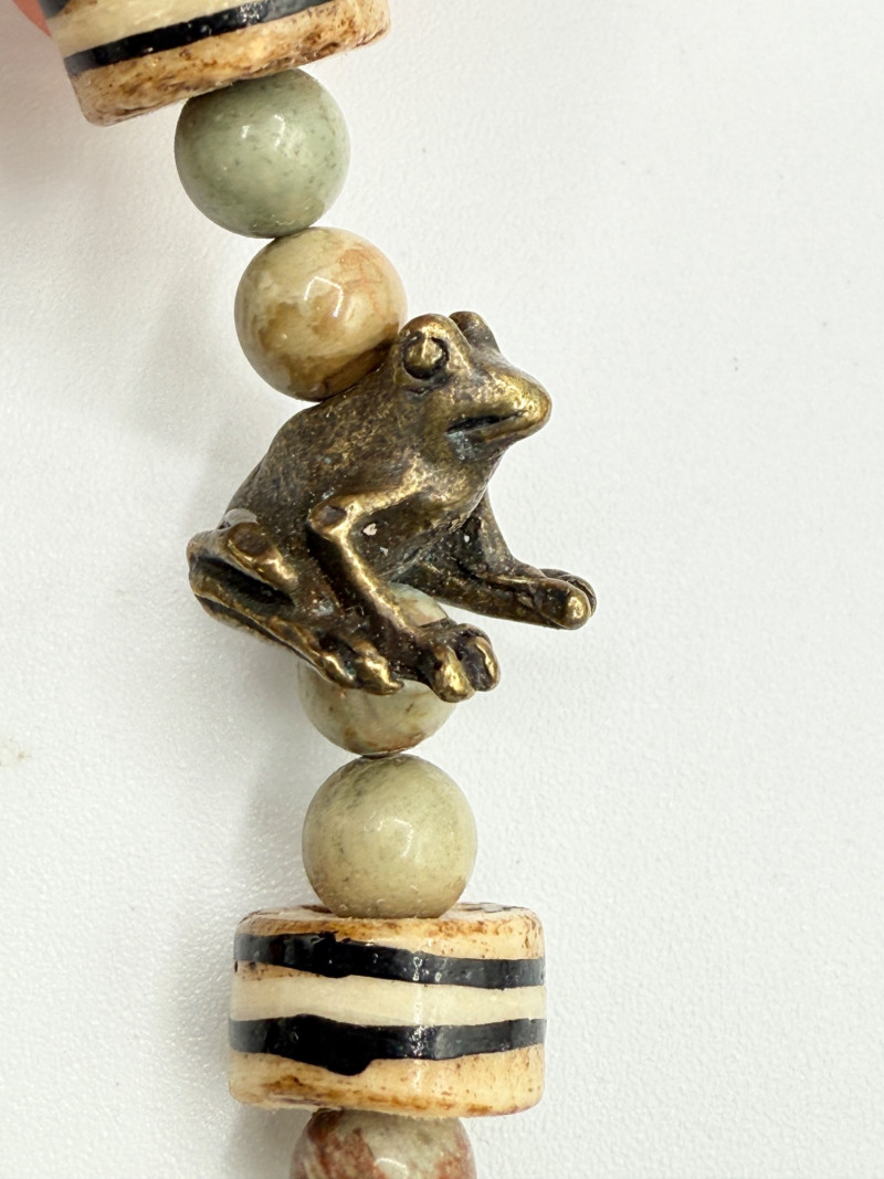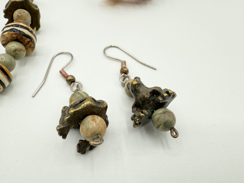 Mixed Beaded Necklaces w/ Frog Charms, Glass Pendant + Earrings Disclaimer: The jewelry in this auction lot has not been tested. By placing a bid, you agree to purchase the item as is, with no guarantees regarding metal quality, content, or purity. Refunds will not be issued on these factors.