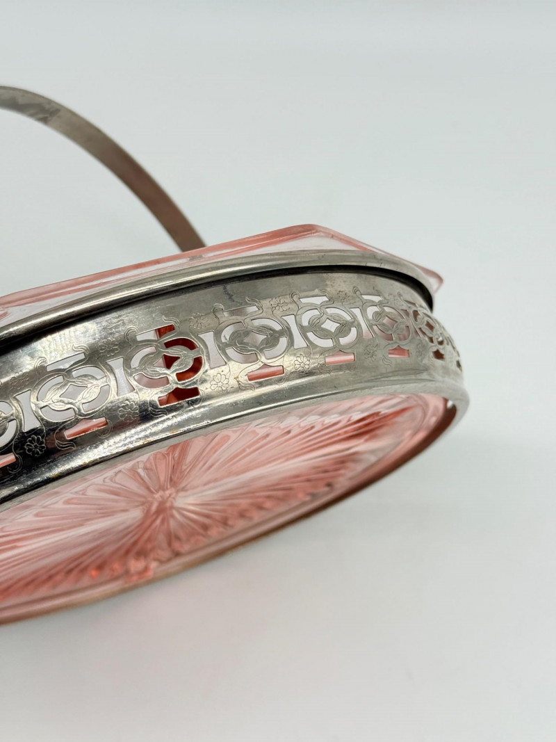 Lot # 103 - Vintage Pink Depression Glass Divided Serving Tray w/ Metal Basket