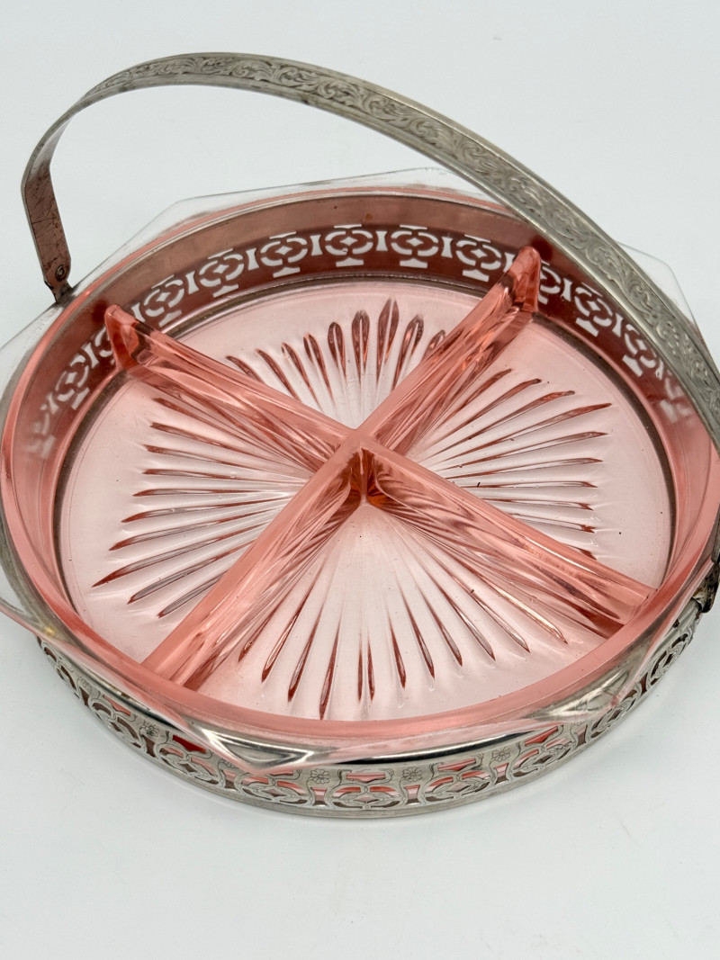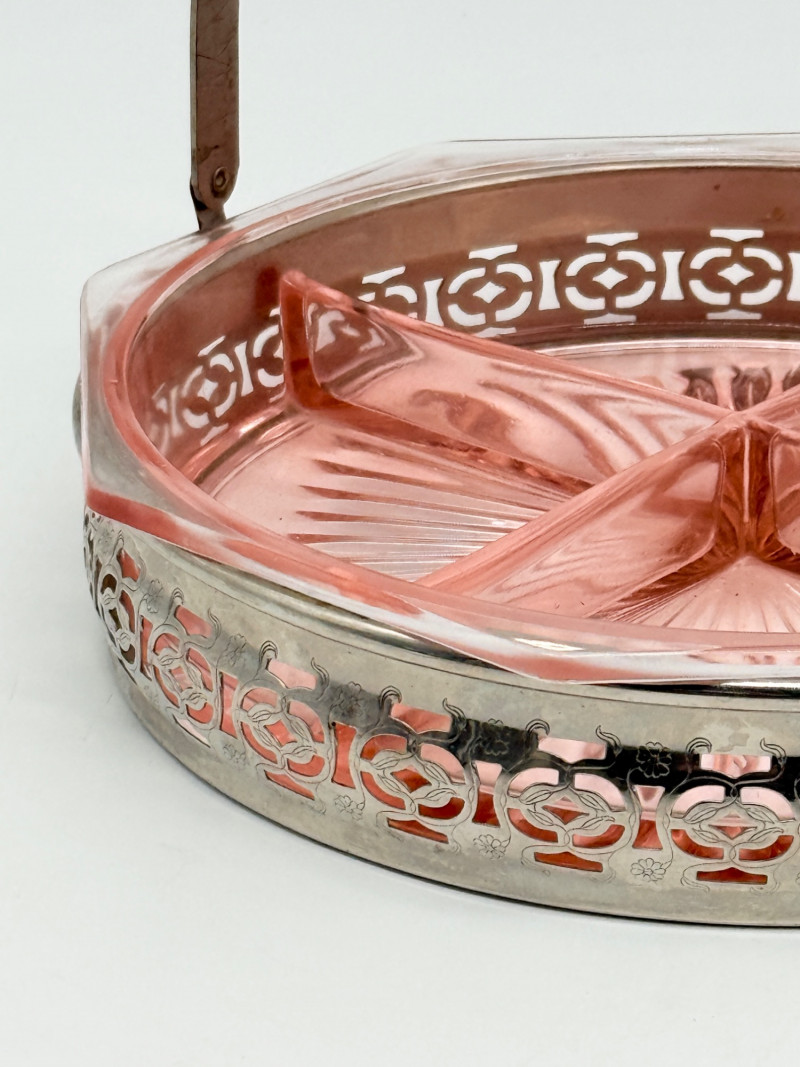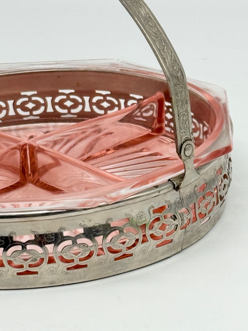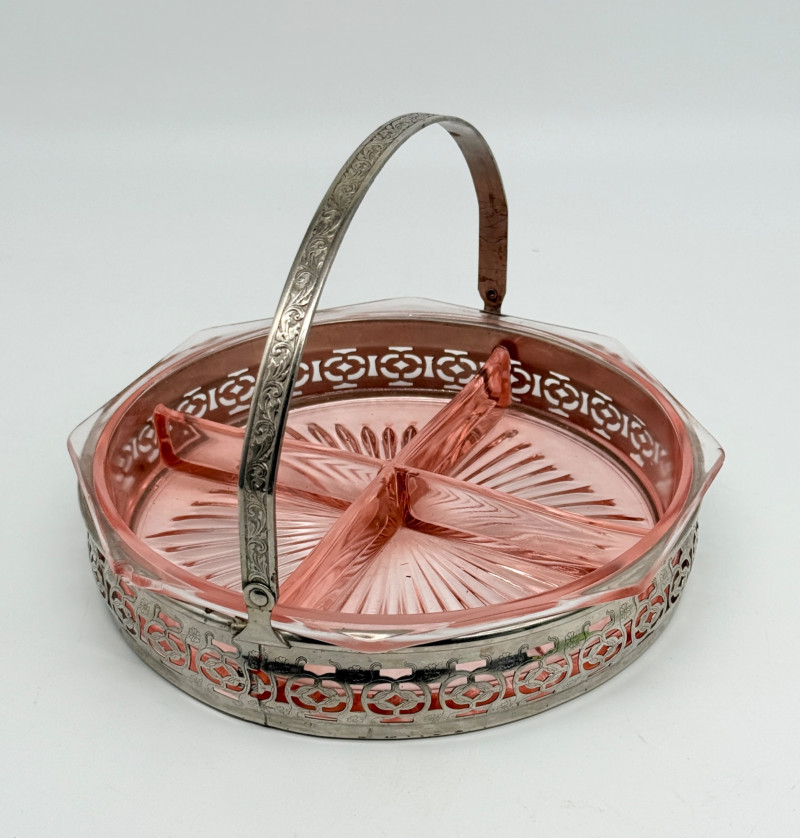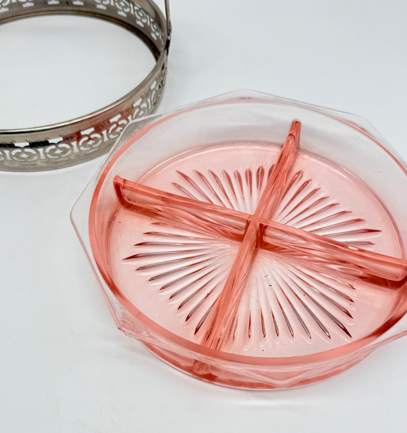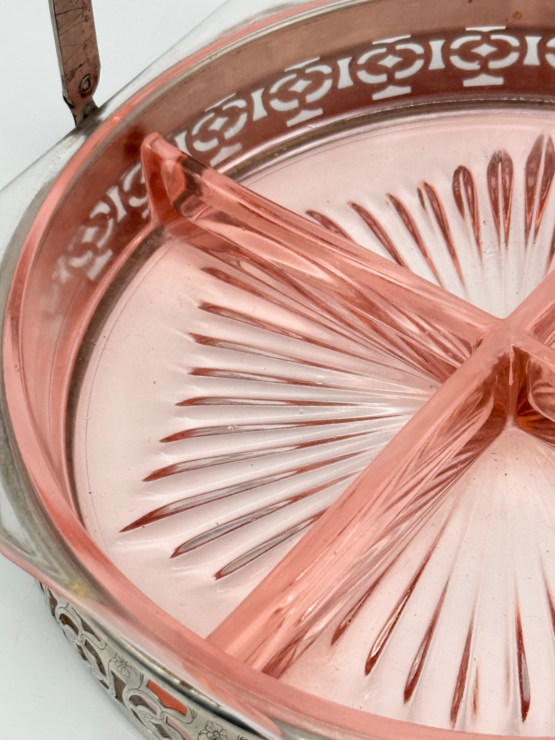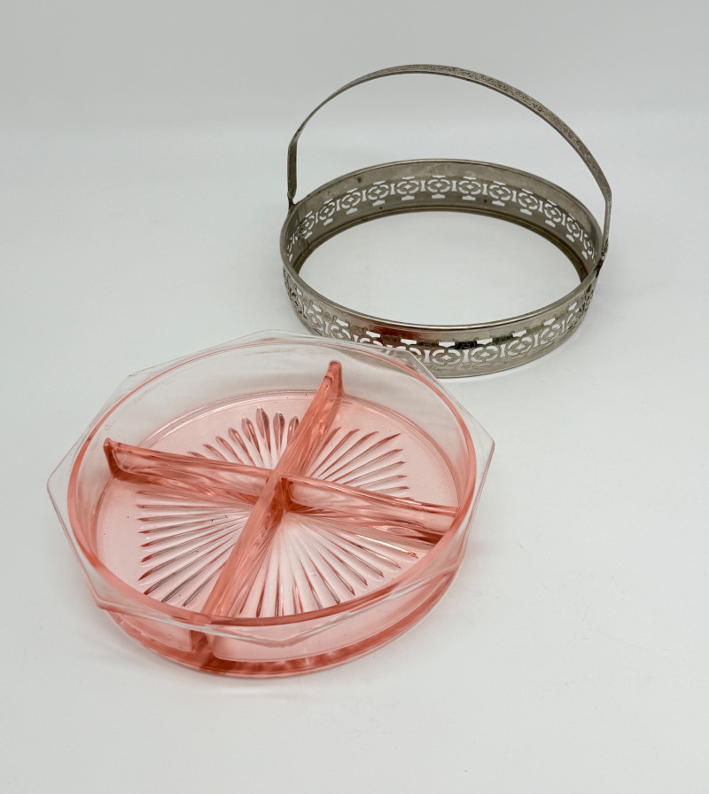 Vintage Pink Depression Glass Divided Serving Tray w/ Metal Basket