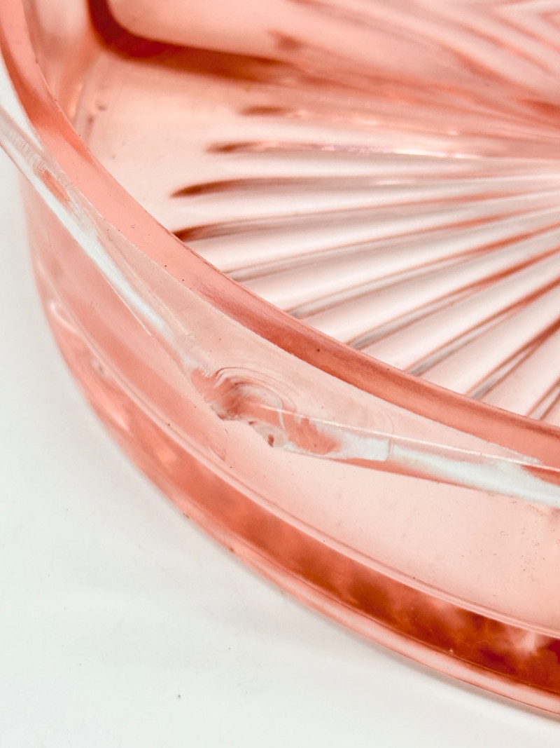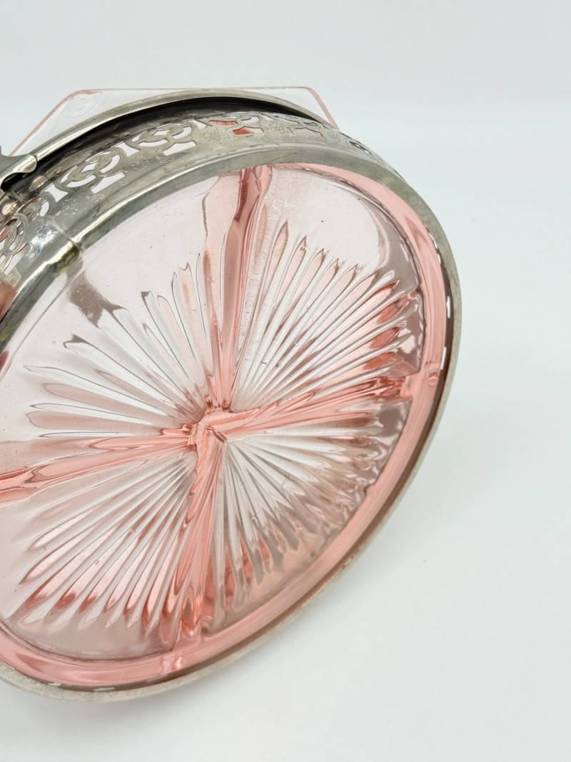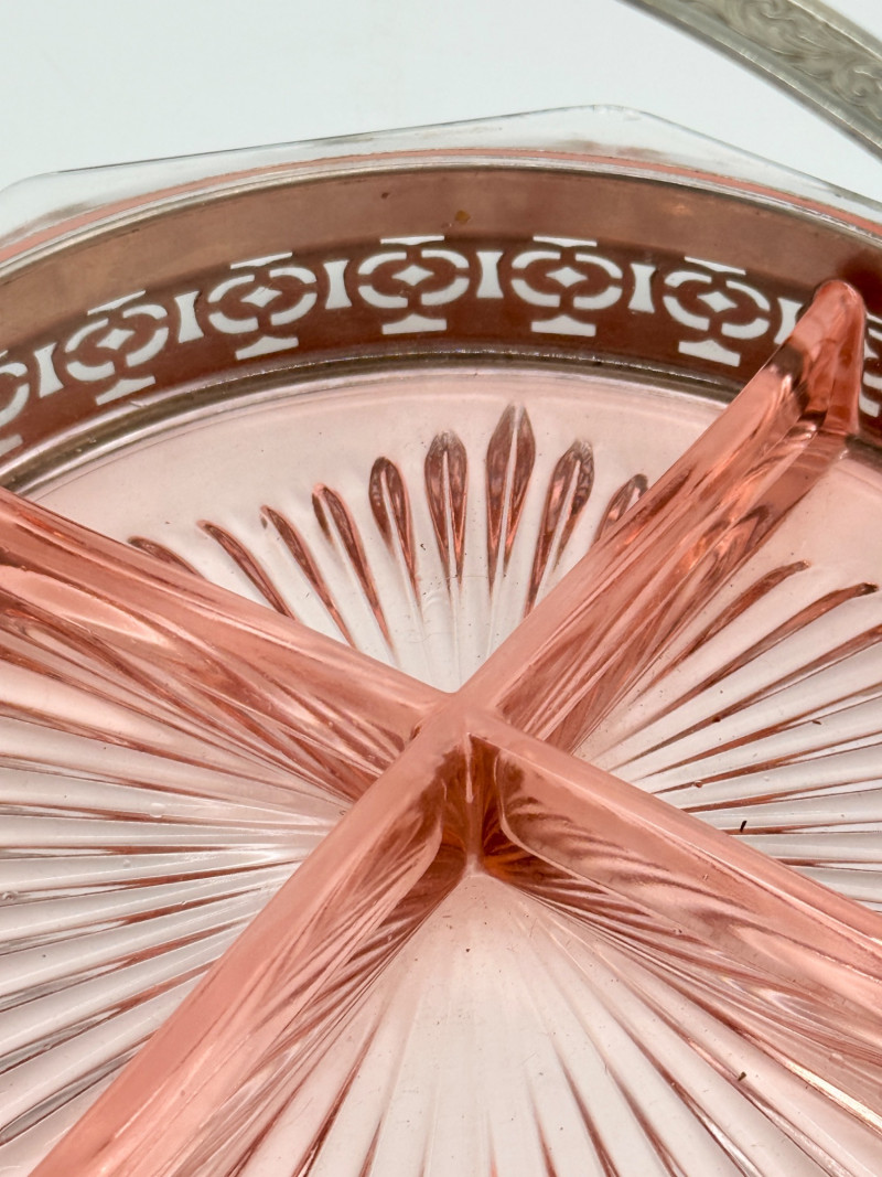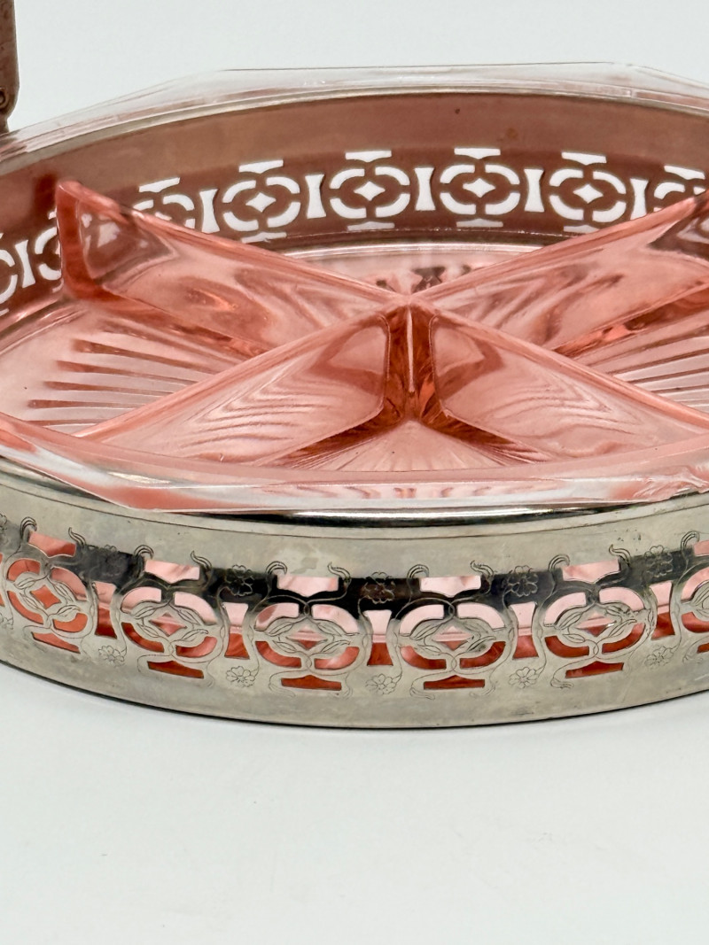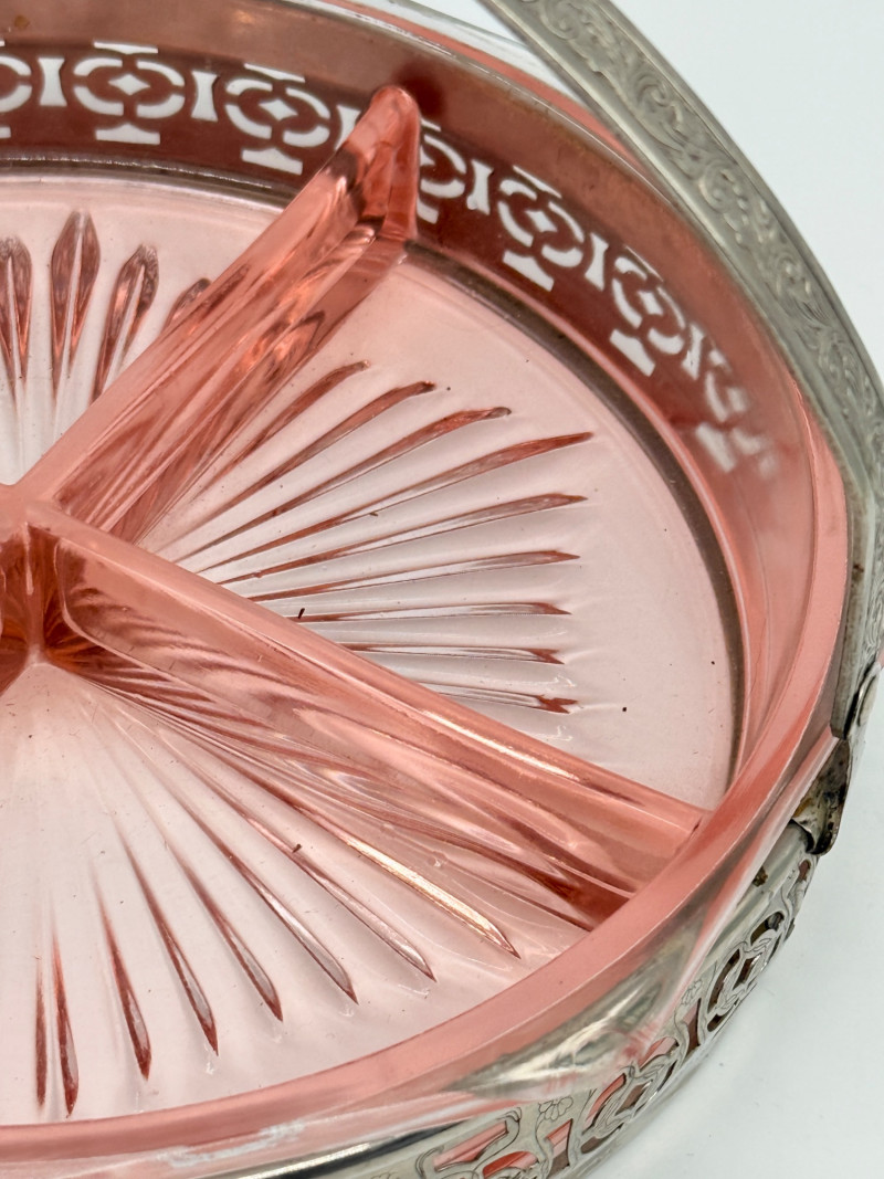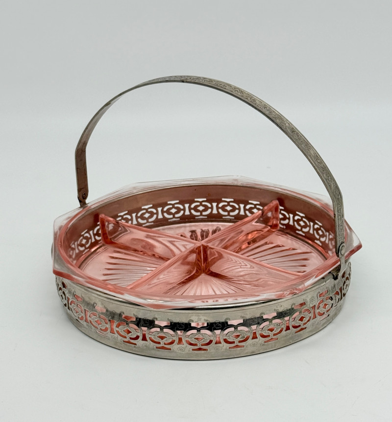 Vintage Pink Depression Glass Divided Serving Tray w/ Metal Basket