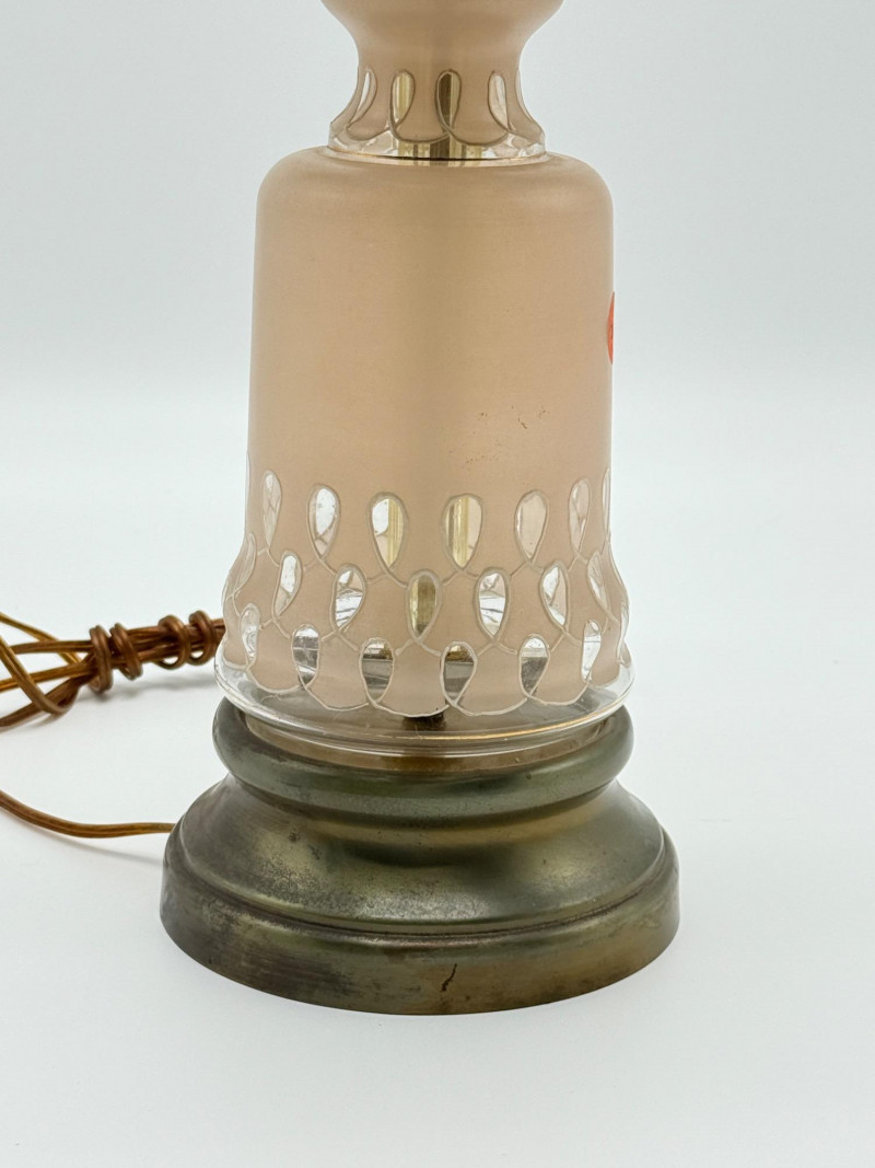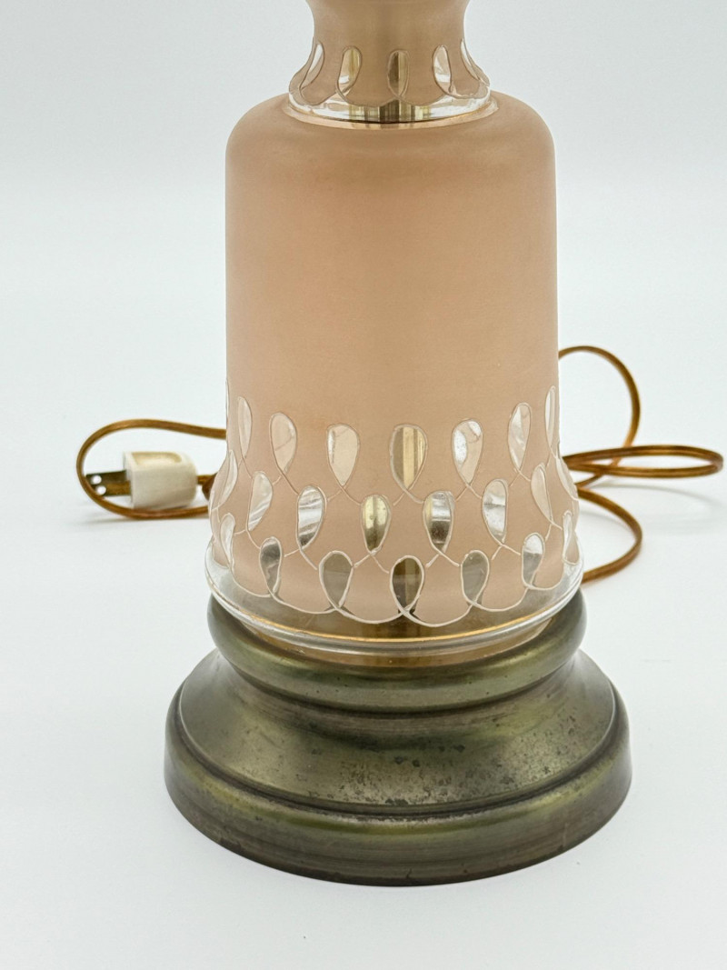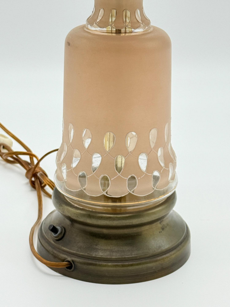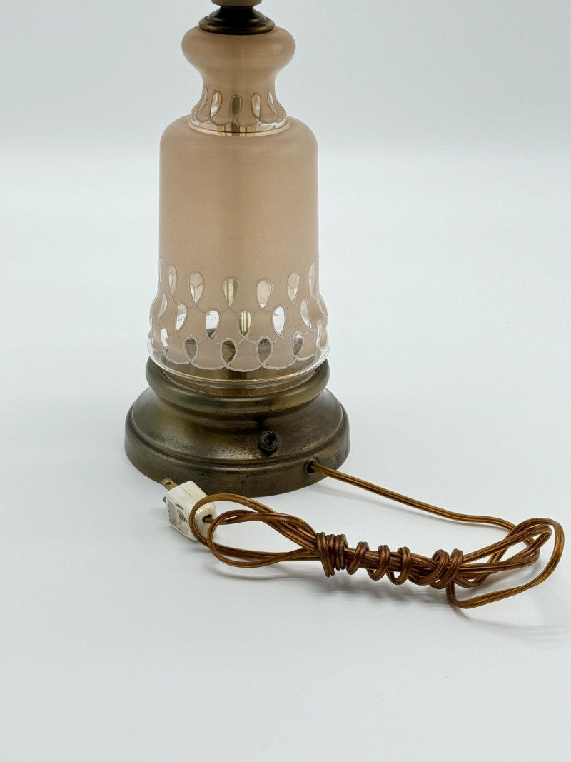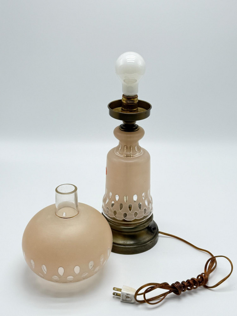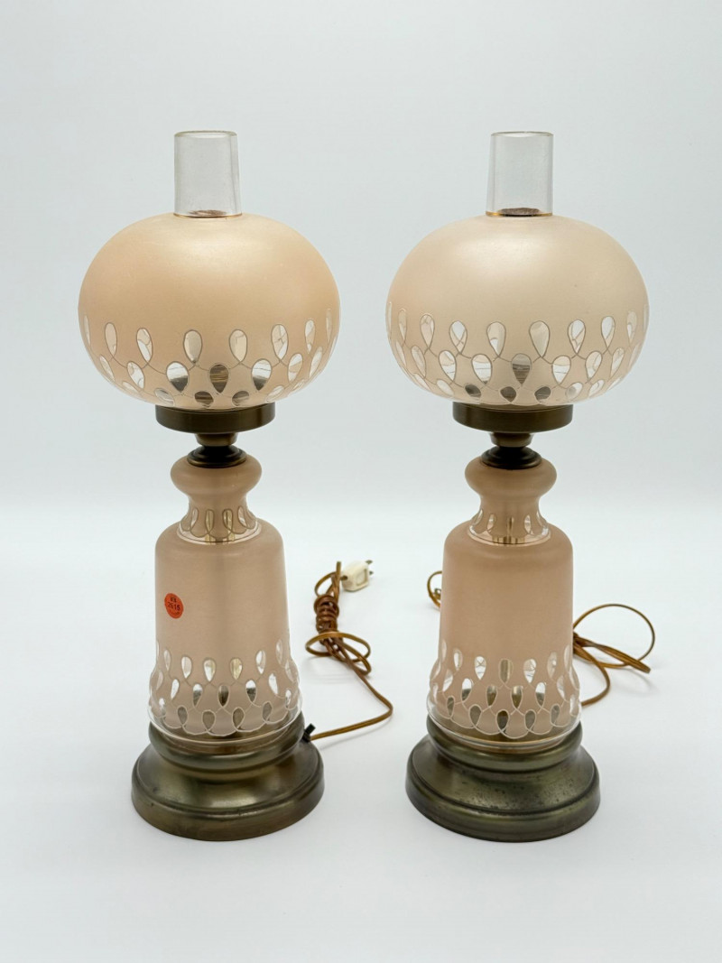 Vintage Pink Glass & Brass Base Hurricane Style Lamp Set