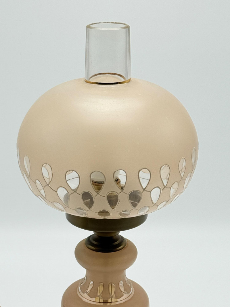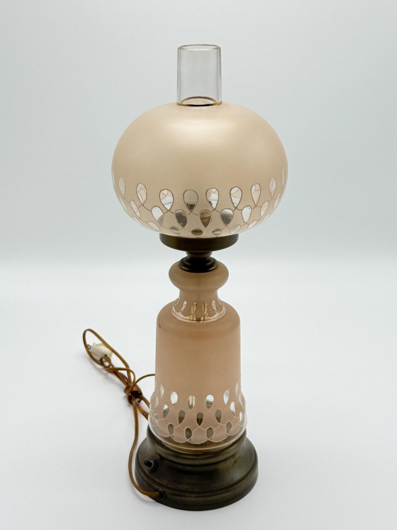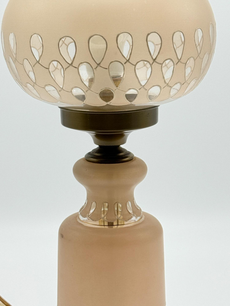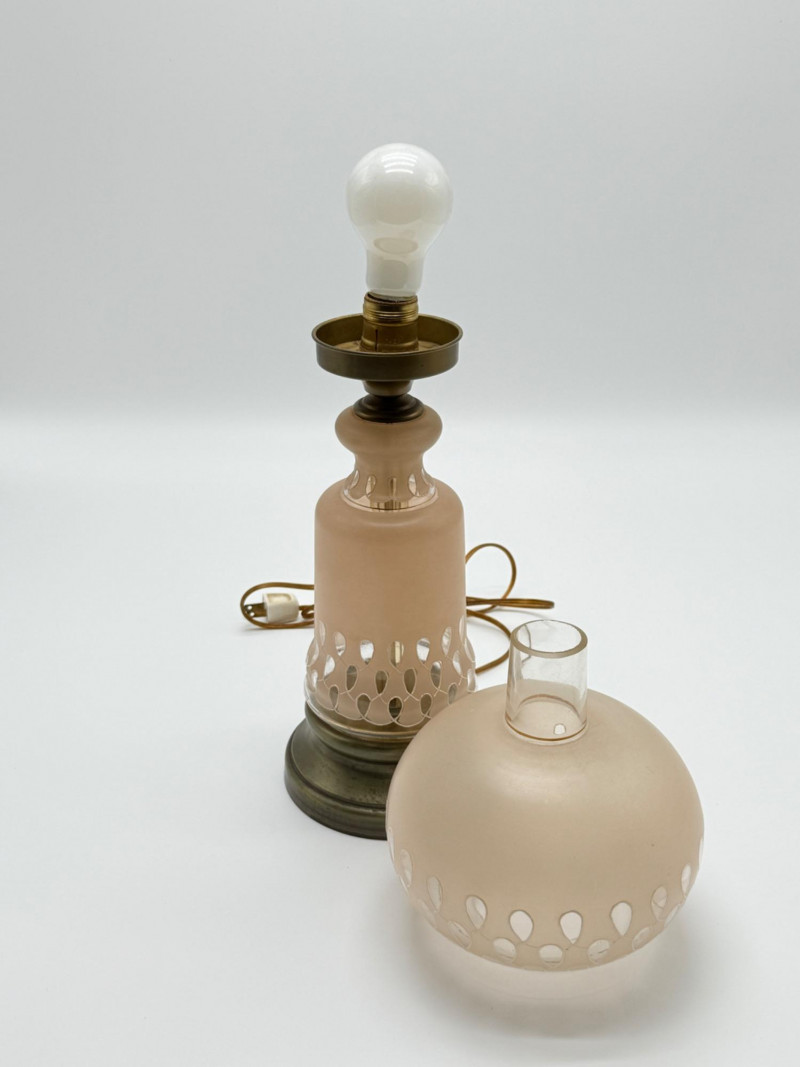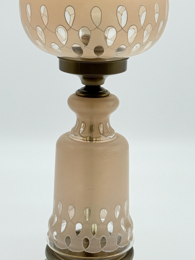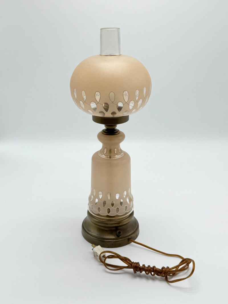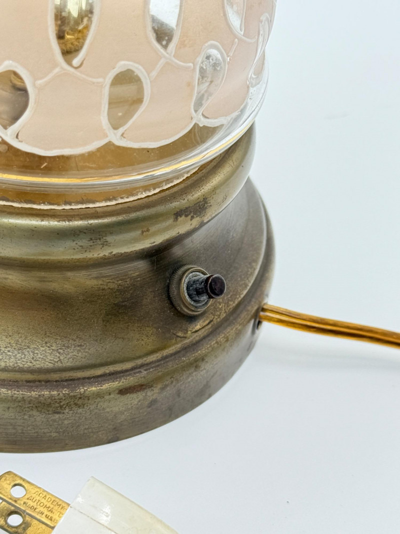 Vintage Pink Glass & Brass Base Hurricane Style Lamp Set