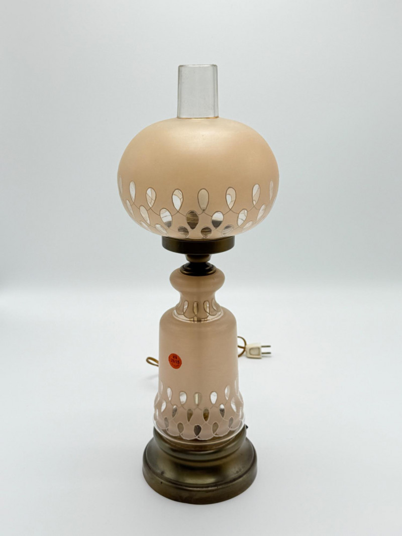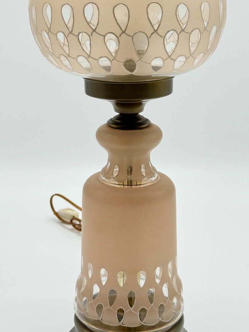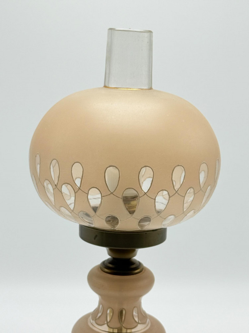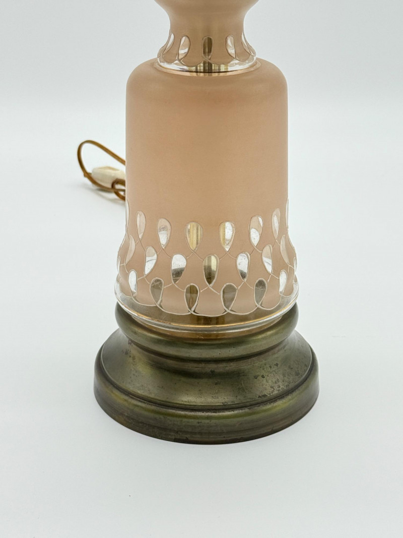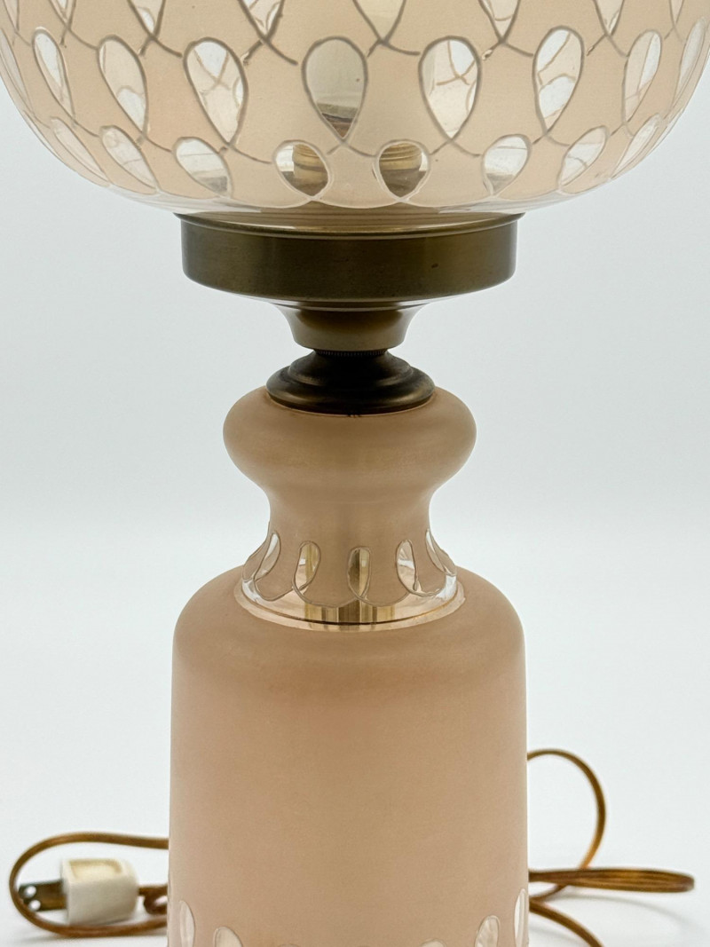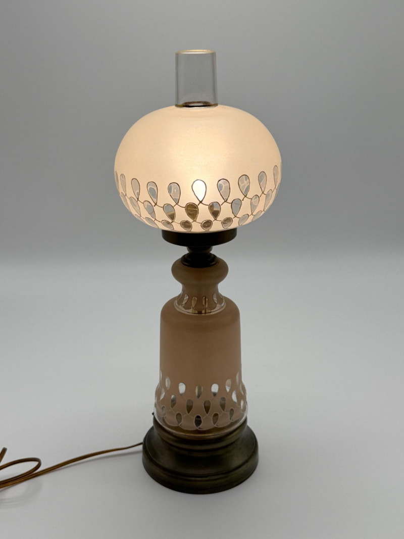 Vintage Pink Glass & Brass Base Hurricane Style Lamp Set