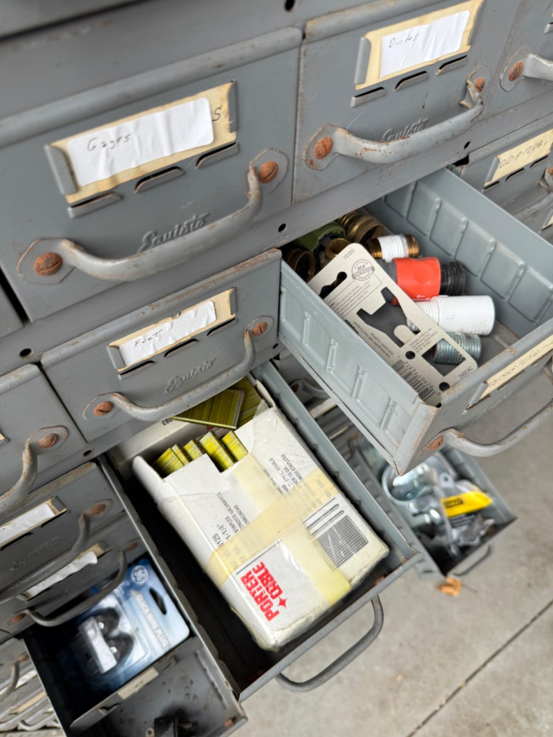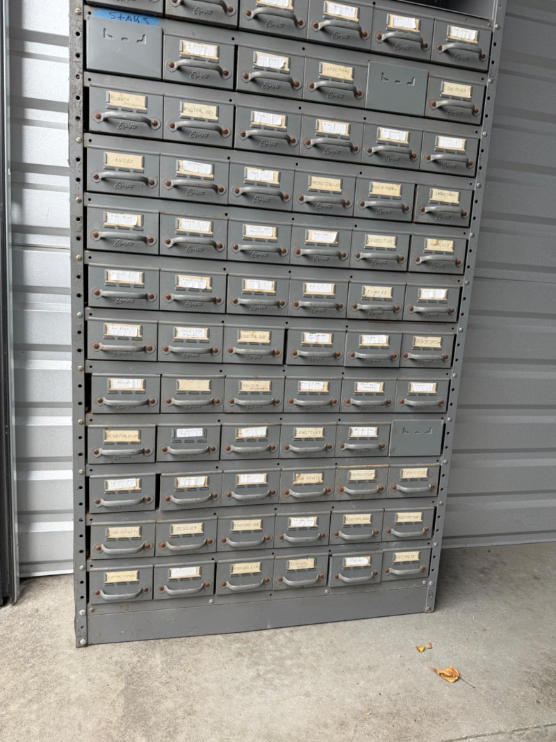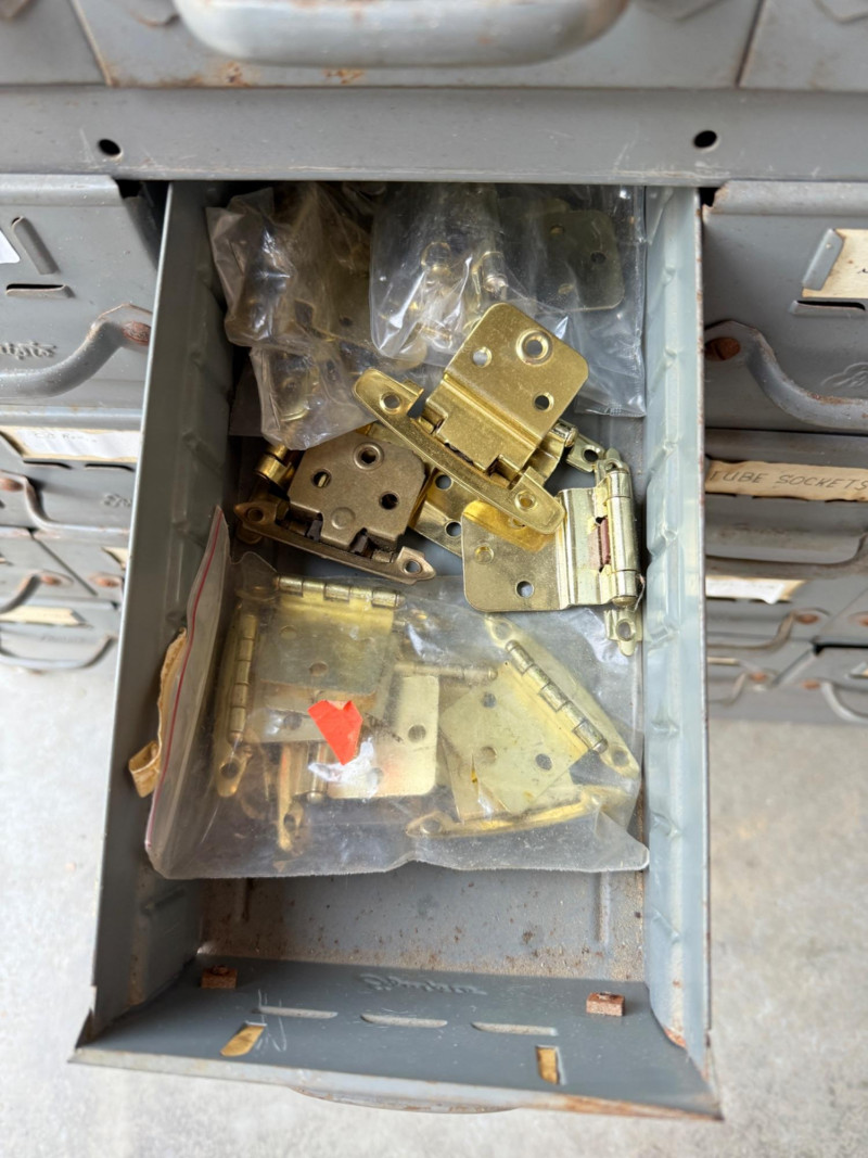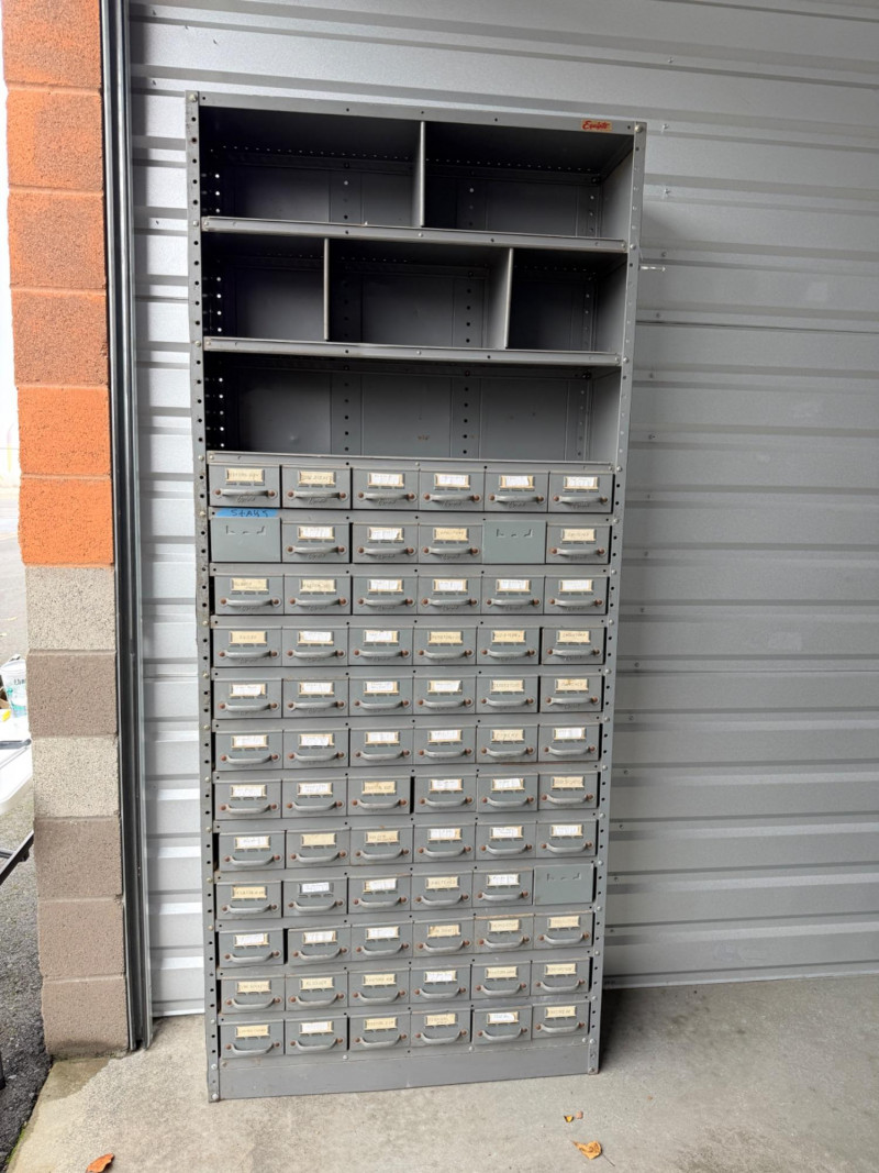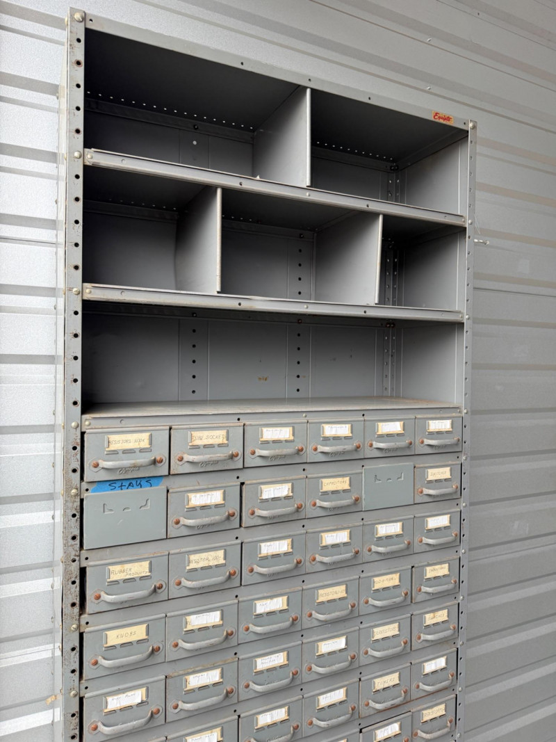 Metal Cabinet w/ Drawers Filled Misc. Items Large heavy-duty commercial cabinet with many different drawers all filled with various tools & hardware. Comes with several extra metal dividers.