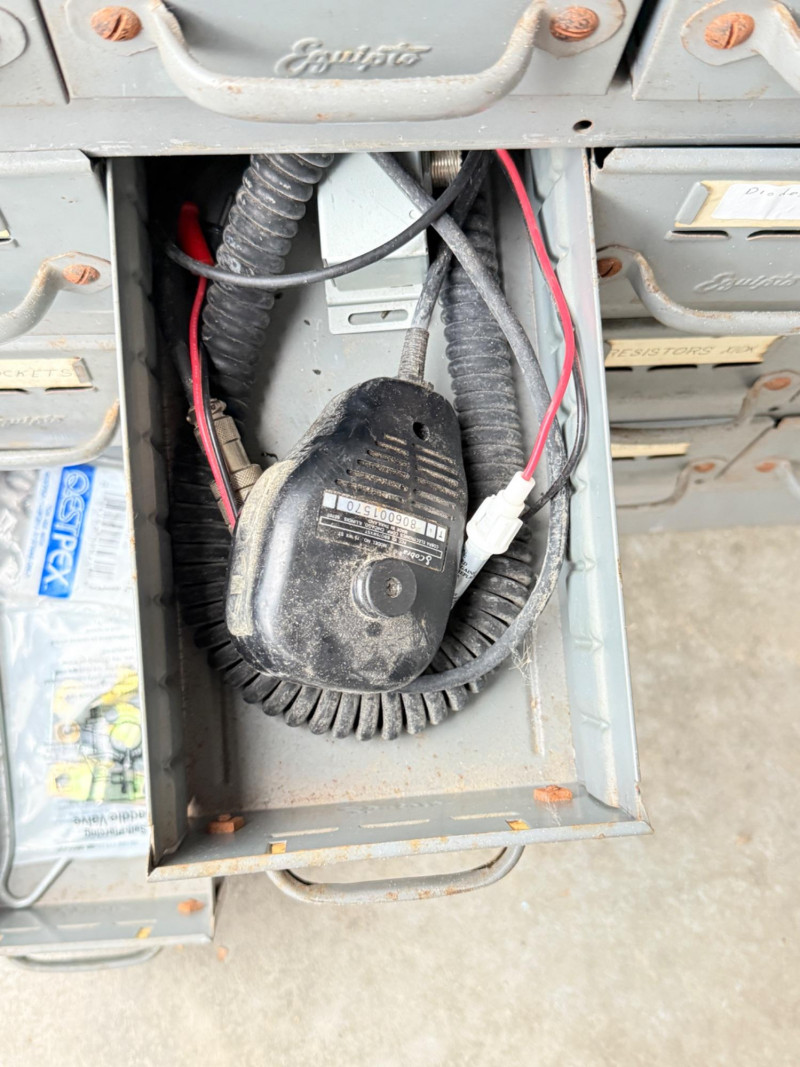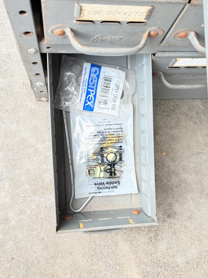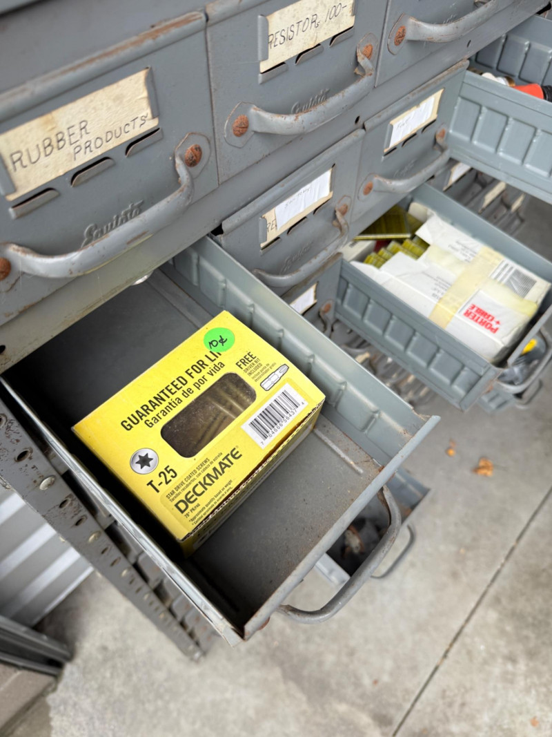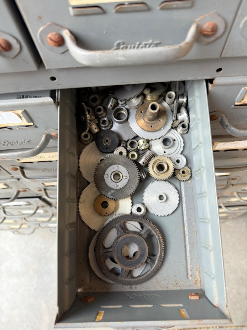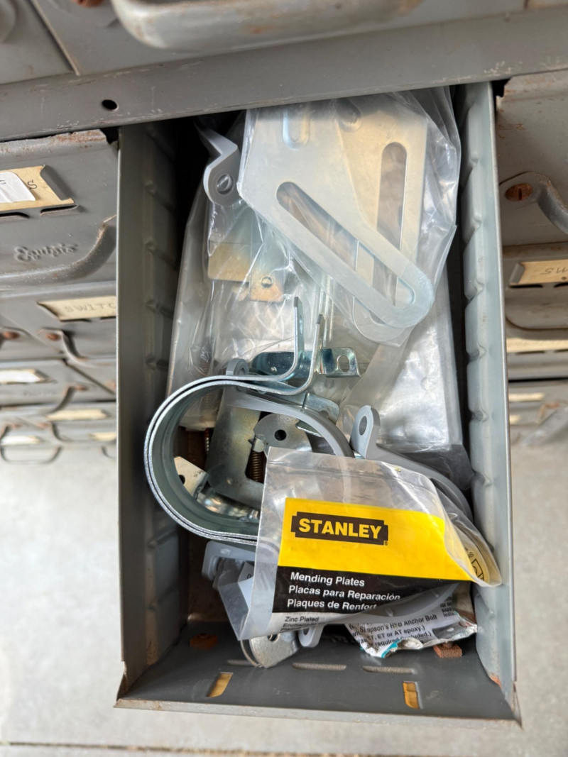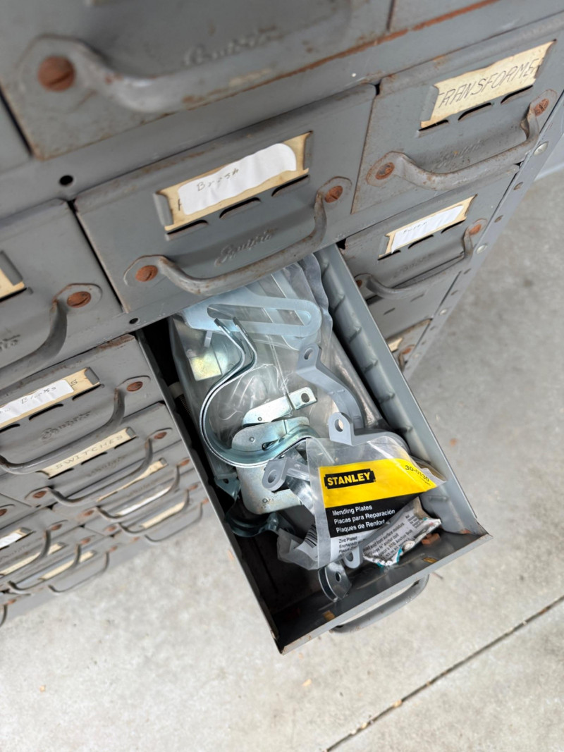 Metal Cabinet w/ Drawers Filled Misc. Items Large heavy-duty commercial cabinet with many different drawers all filled with various tools & hardware. Comes with several extra metal dividers.