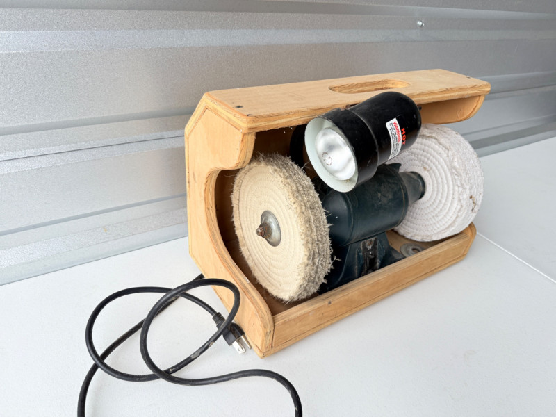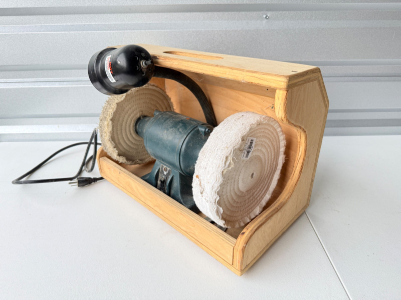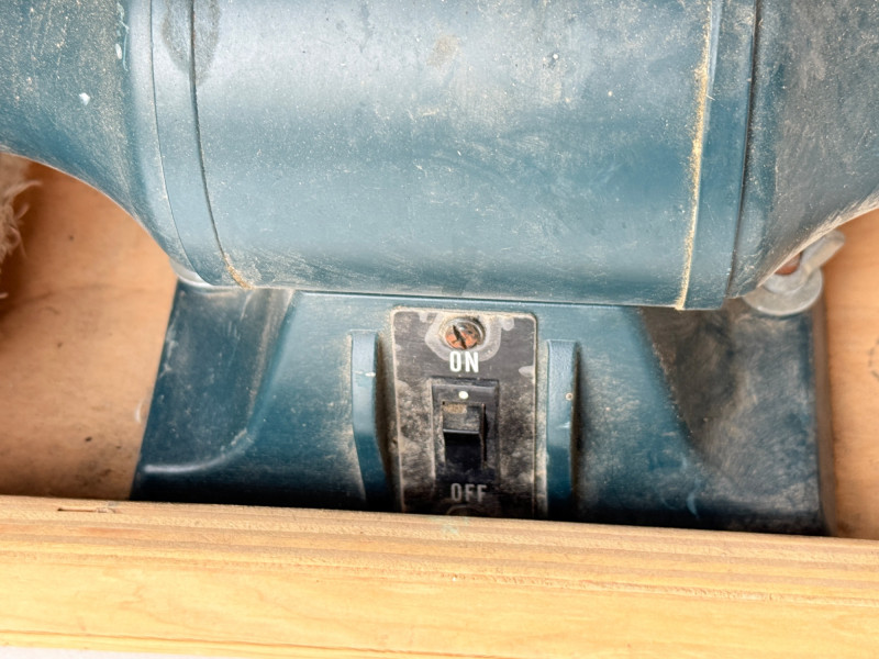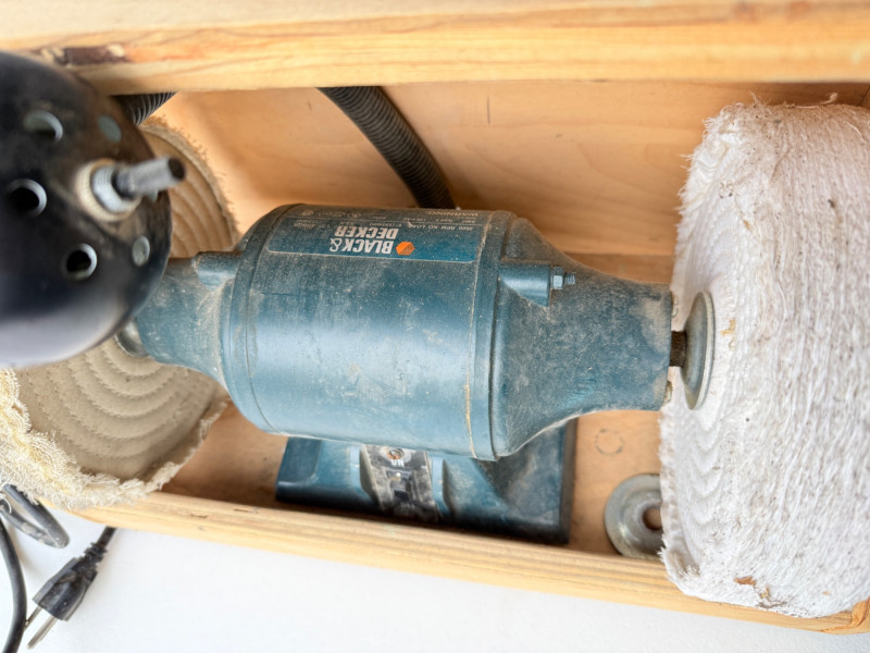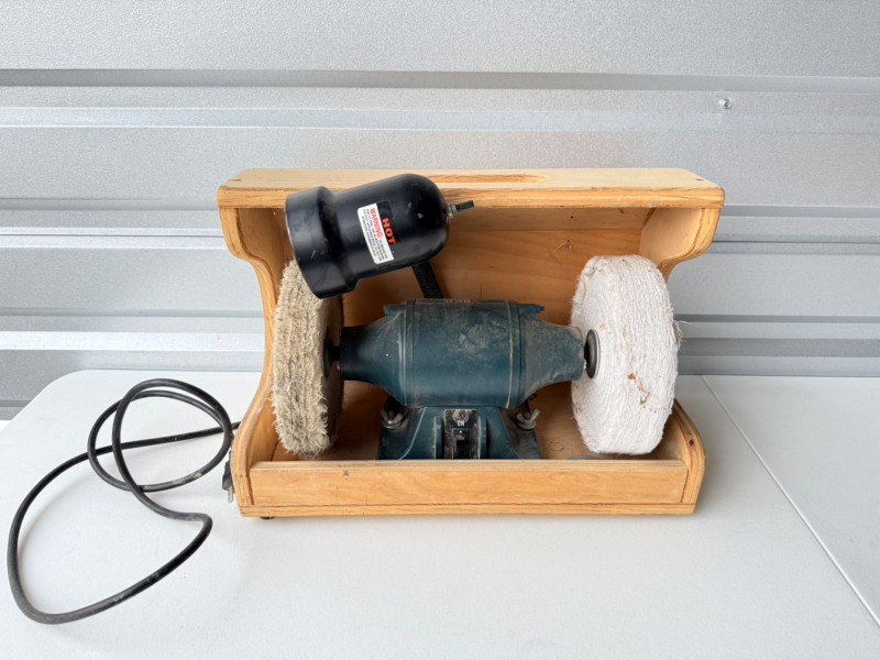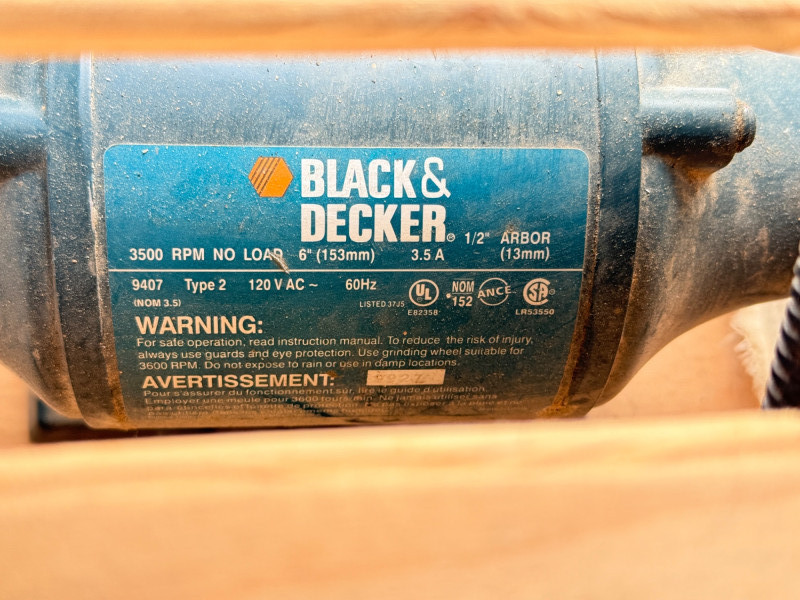 Black & Decker Bench Grinder 6" bench grinder with custom storage box. Comes with polishing pads. Plugged in works great.