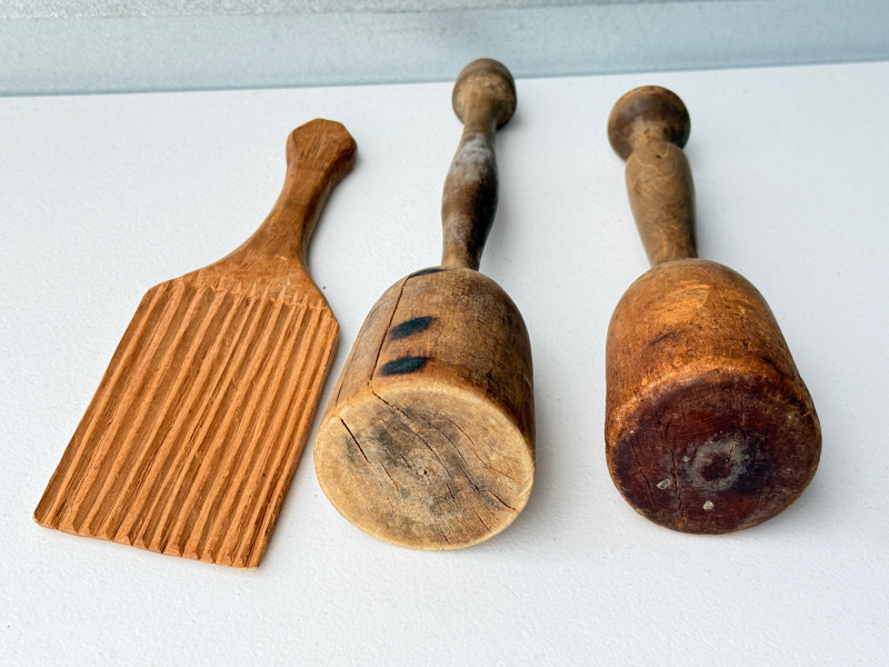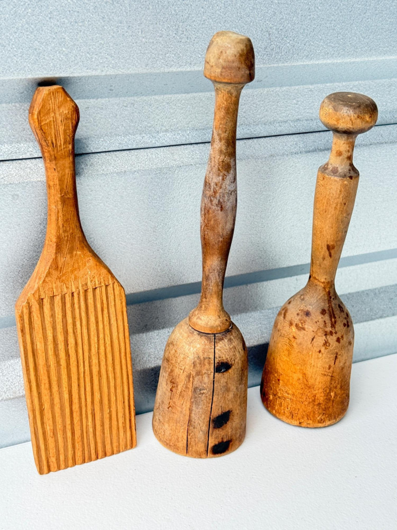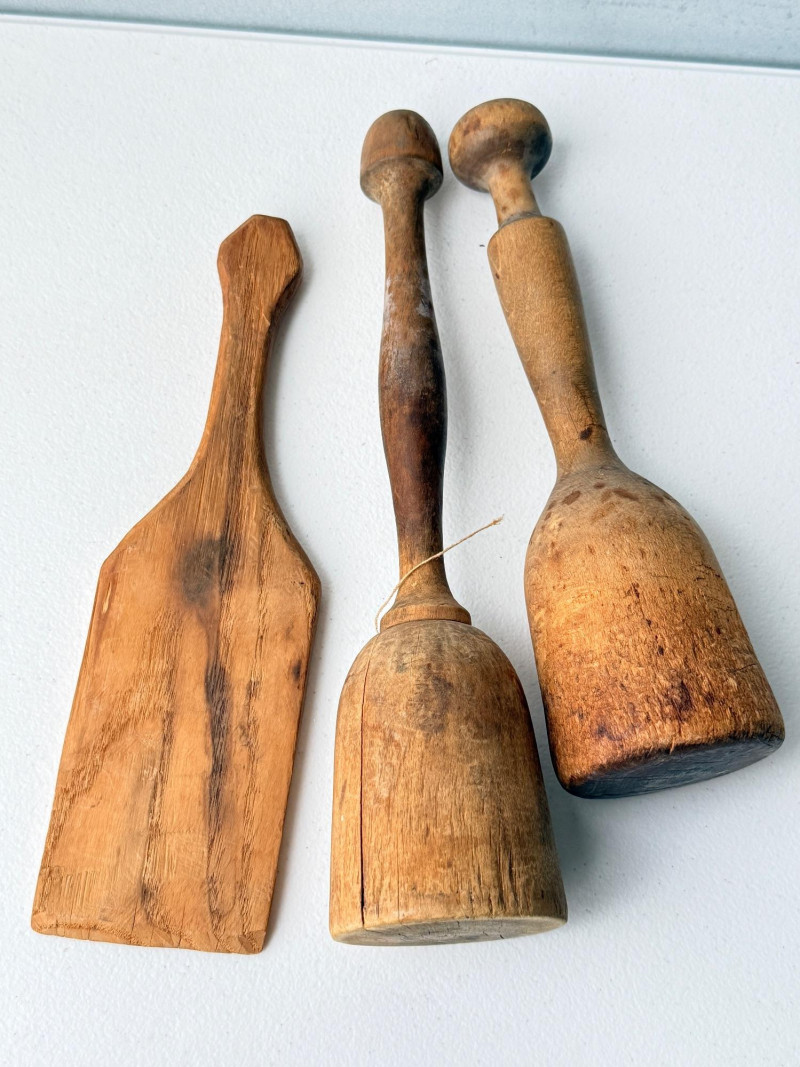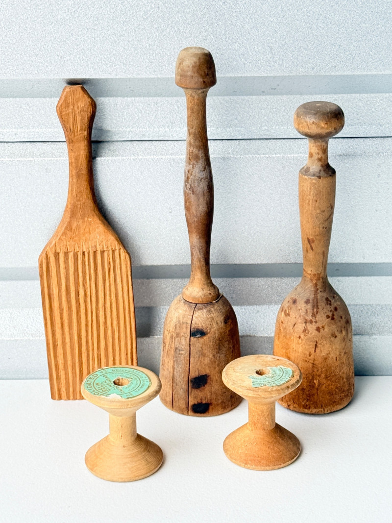 Lot # 112 - Vintage Wooden Spatula, Masher & Spools