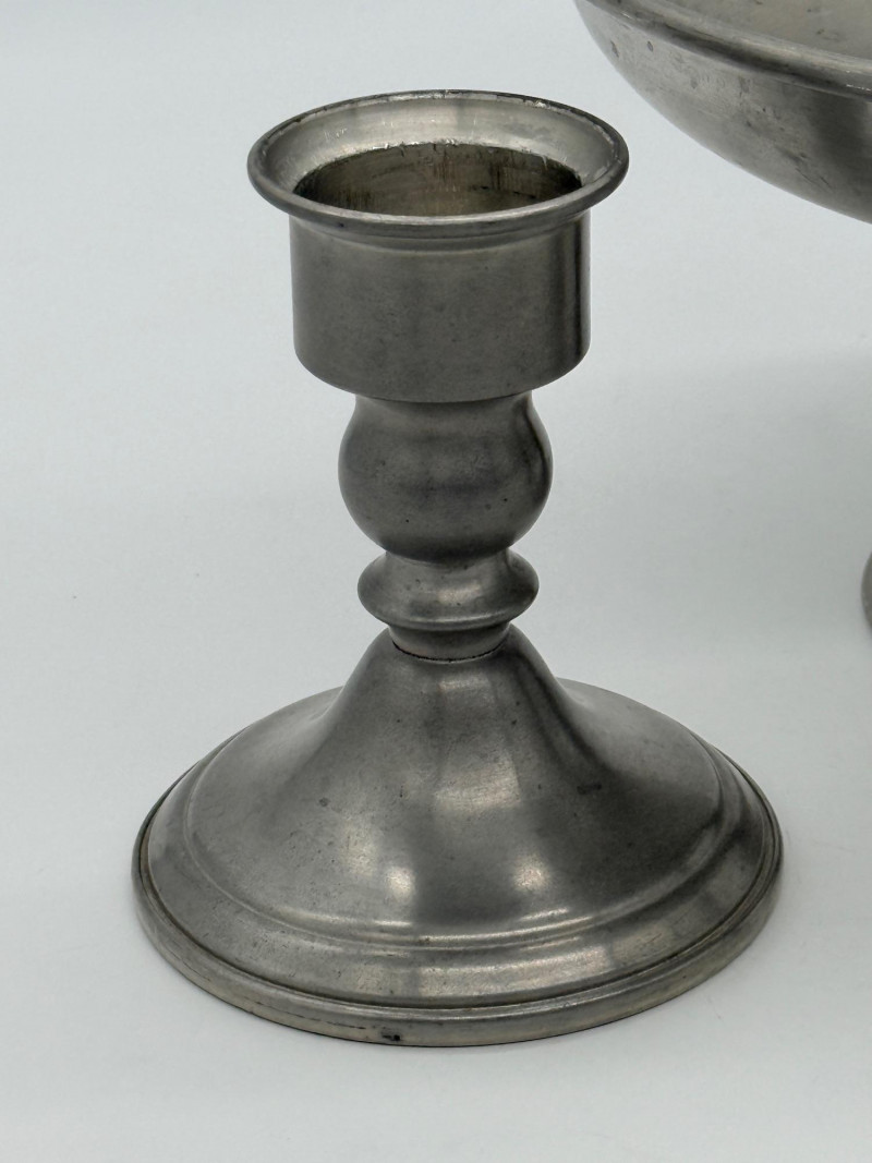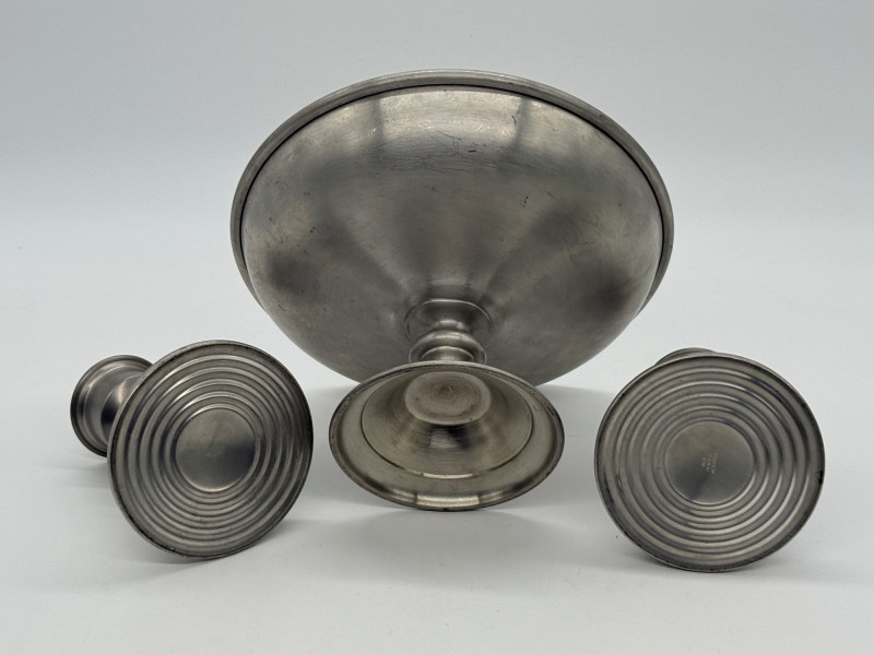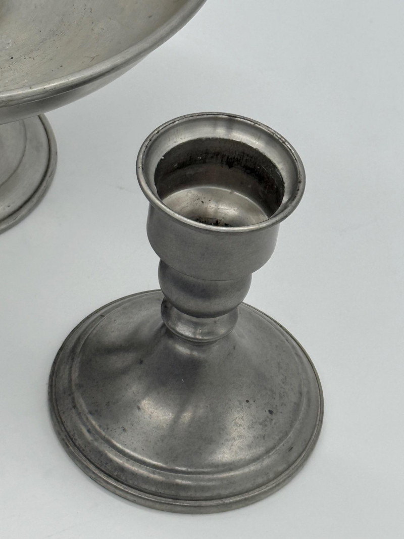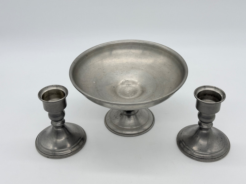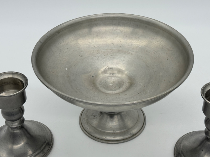 Lot # 95 - Pfaltzgraff Pewter Chalice-Style Bowl & Pewter Candlestick Holders