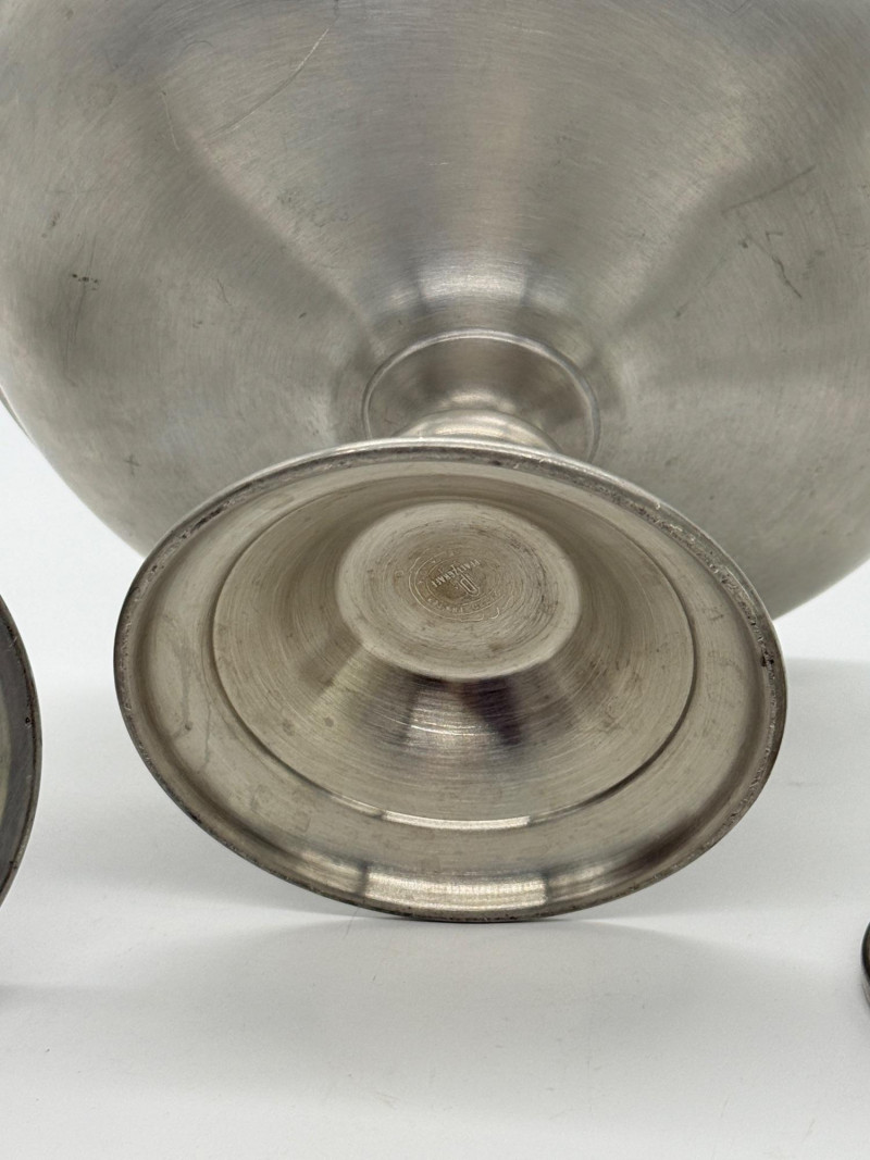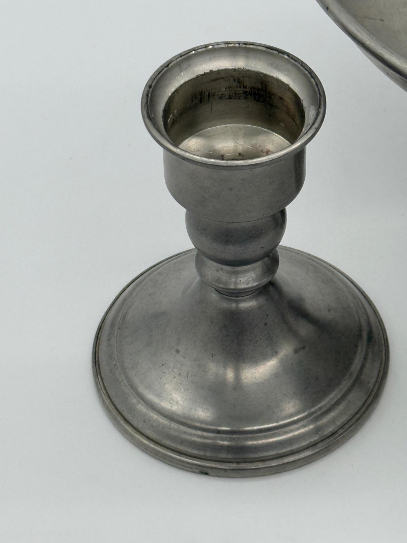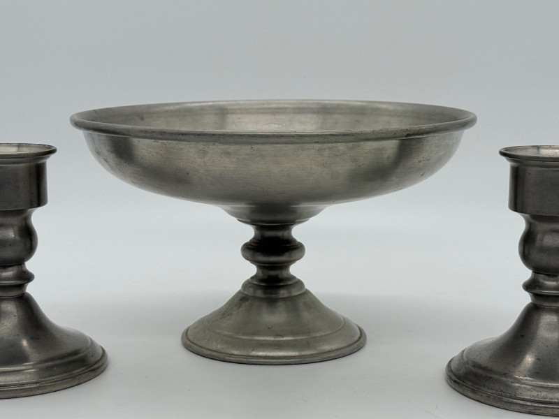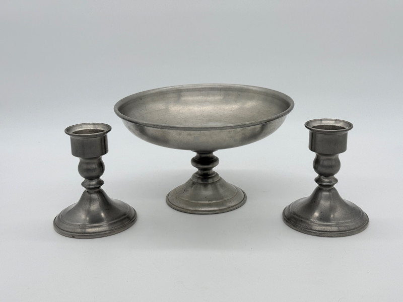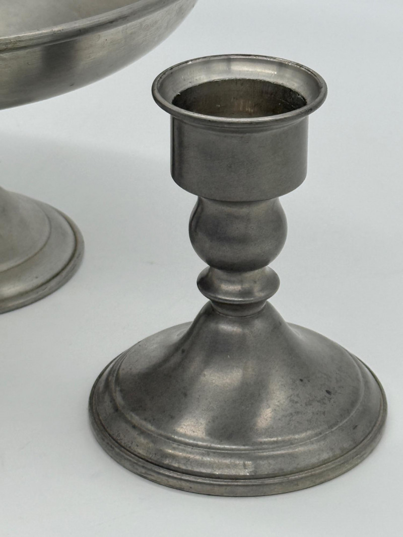 Lot # 95 - Pfaltzgraff Pewter Chalice-Style Bowl & Pewter Candlestick Holders