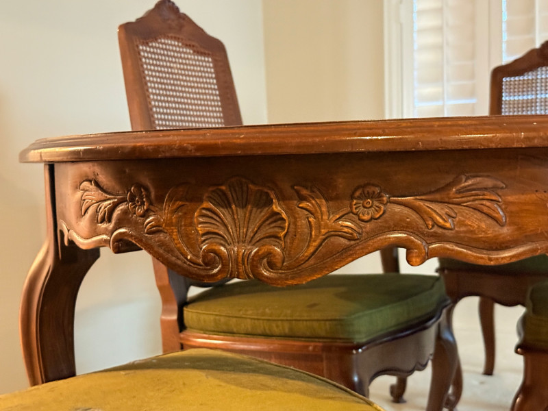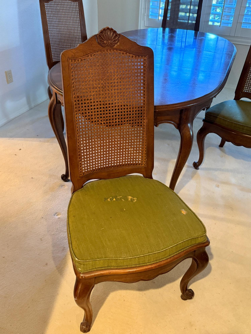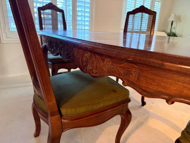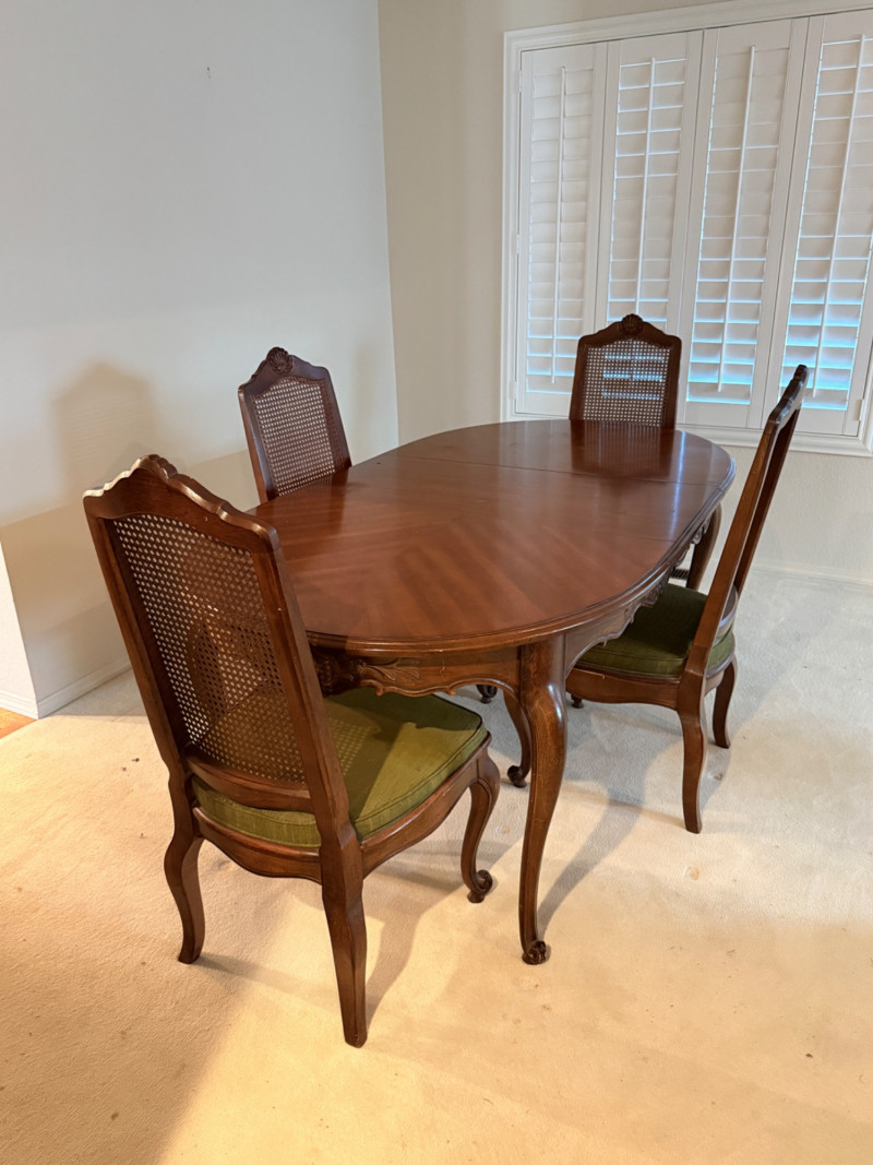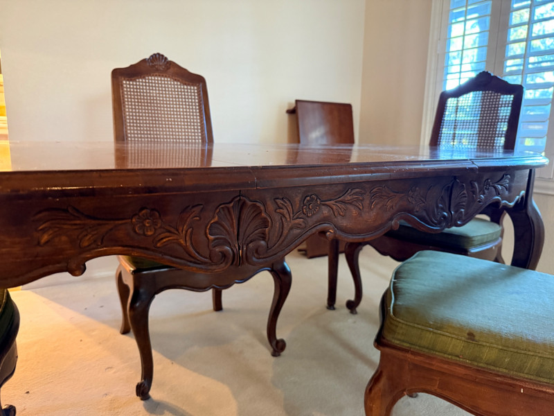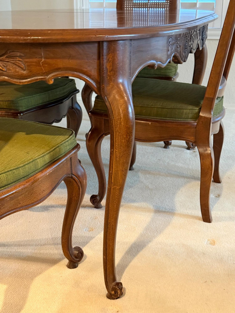 Vintage Rustique - French in the Country Manner Table & Chairs w/Two Leaf Inserts - By Drexel Table Size: Extra Table Insert: Chairs: *Note - Normal wear & tear, see photos * Located on the first floor Bidding on this lot is an agreement that: (1) You will have 2 capable, able bodied persons to lift and load at a minimum. (2) You will bring a hand truck and/or any other tools needed to remove this item. If these steps are not followed your next item will be forfeit and no refund given.