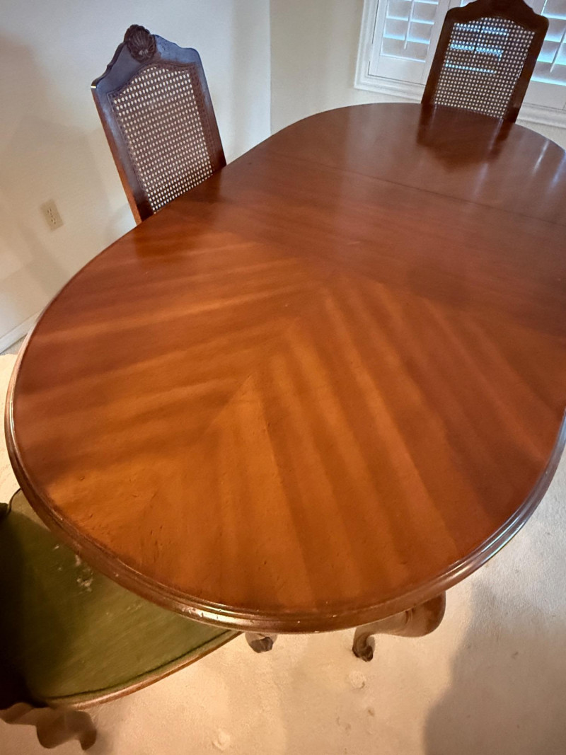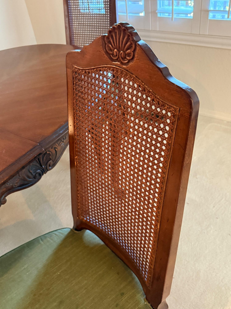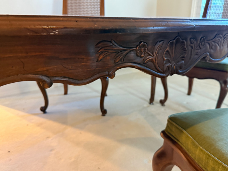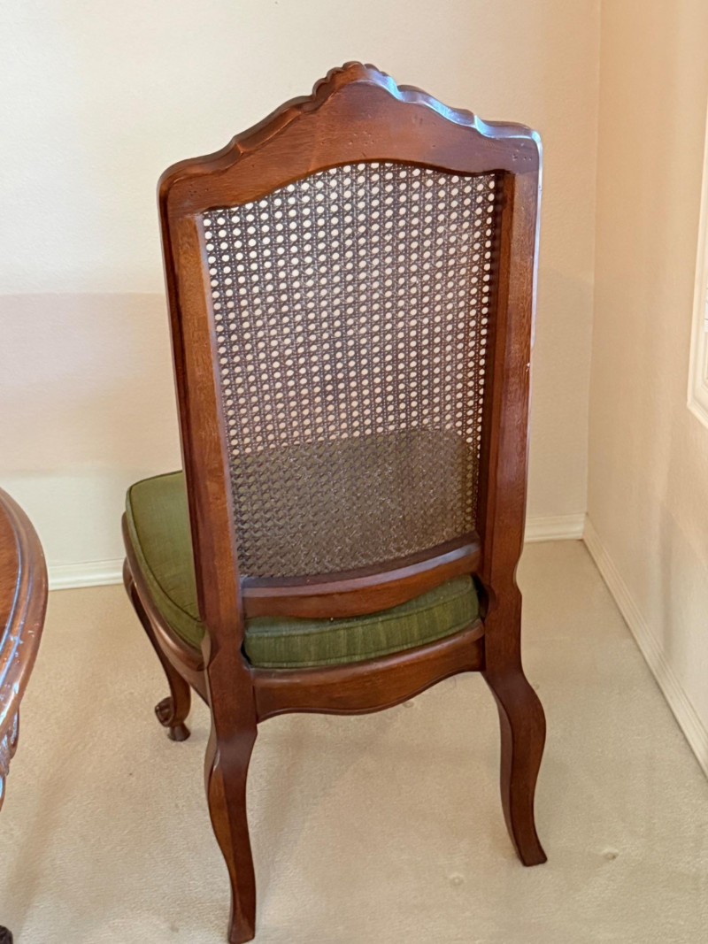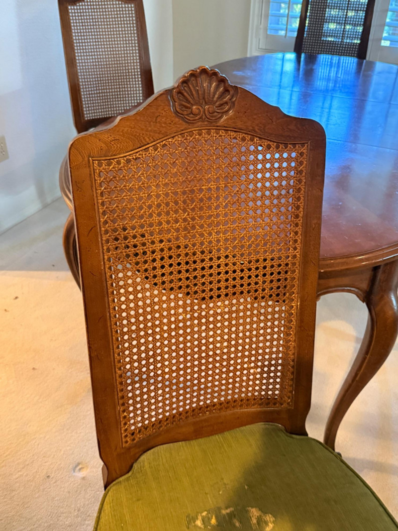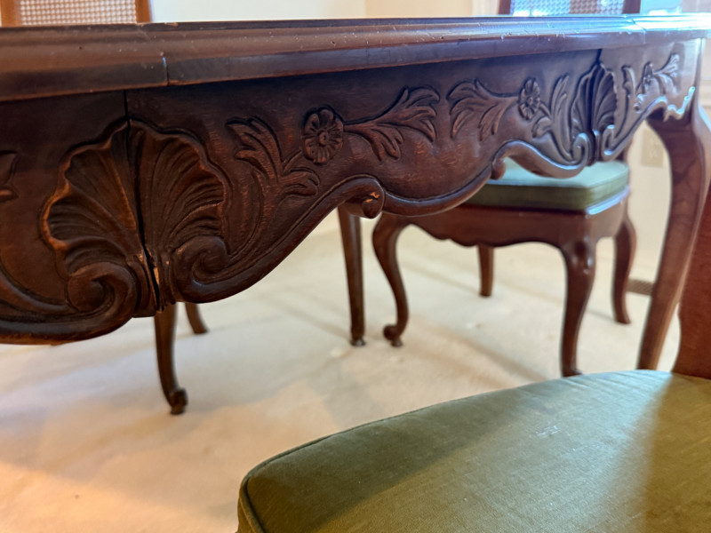 Vintage Rustique - French in the Country Manner Table & Chairs w/Two Leaf Inserts - By Drexel Table Size: Extra Table Insert: Chairs: *Note - Normal wear & tear, see photos * Located on the first floor Bidding on this lot is an agreement that: (1) You will have 2 capable, able bodied persons to lift and load at a minimum. (2) You will bring a hand truck and/or any other tools needed to remove this item. If these steps are not followed your next item will be forfeit and no refund given.