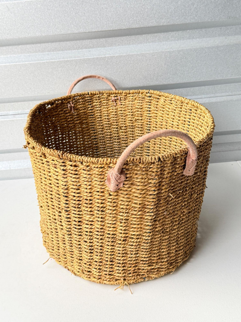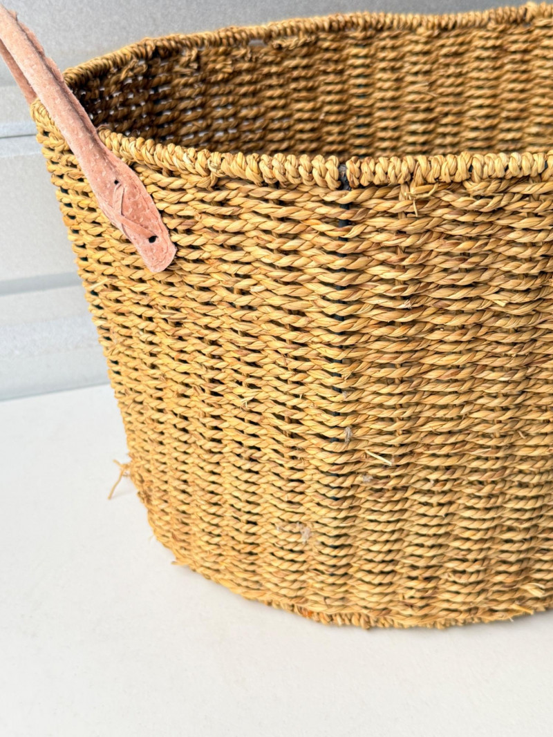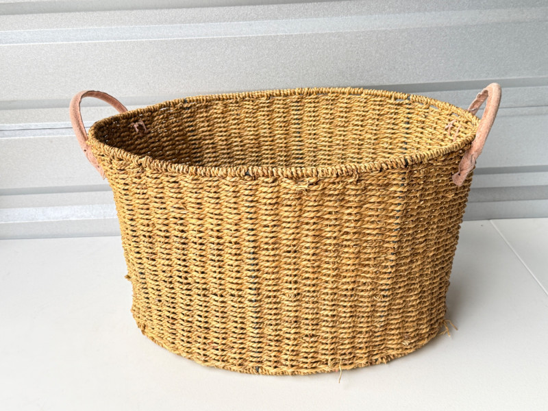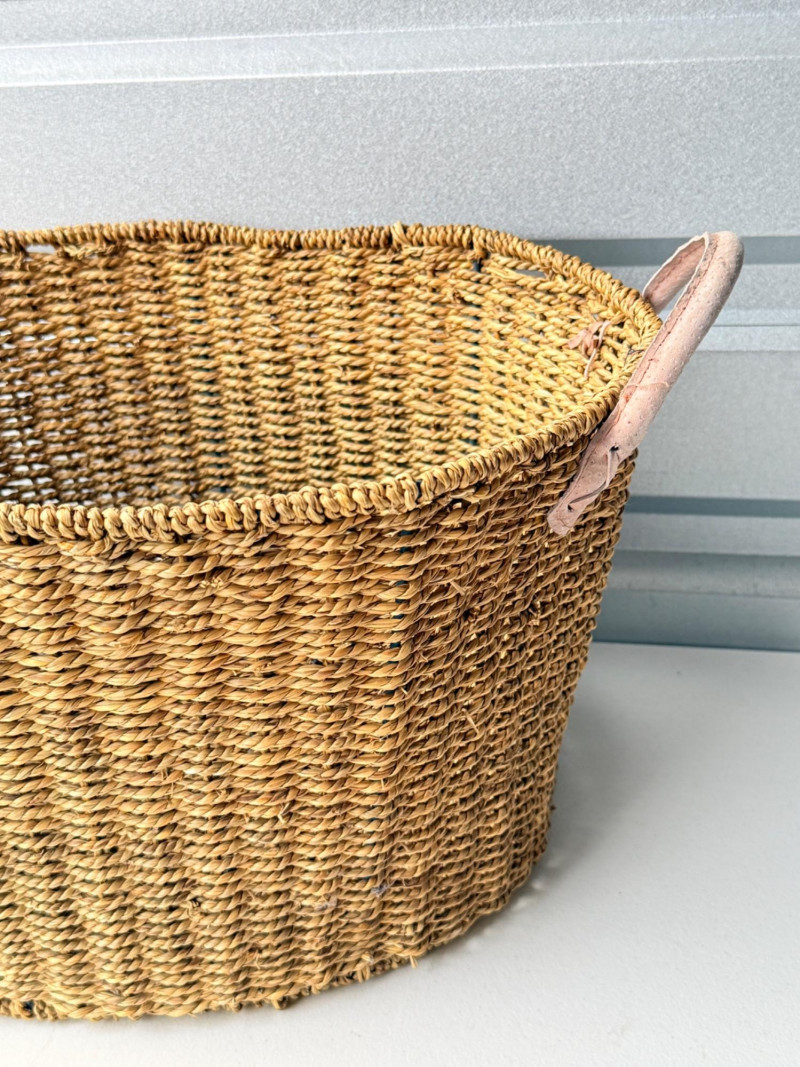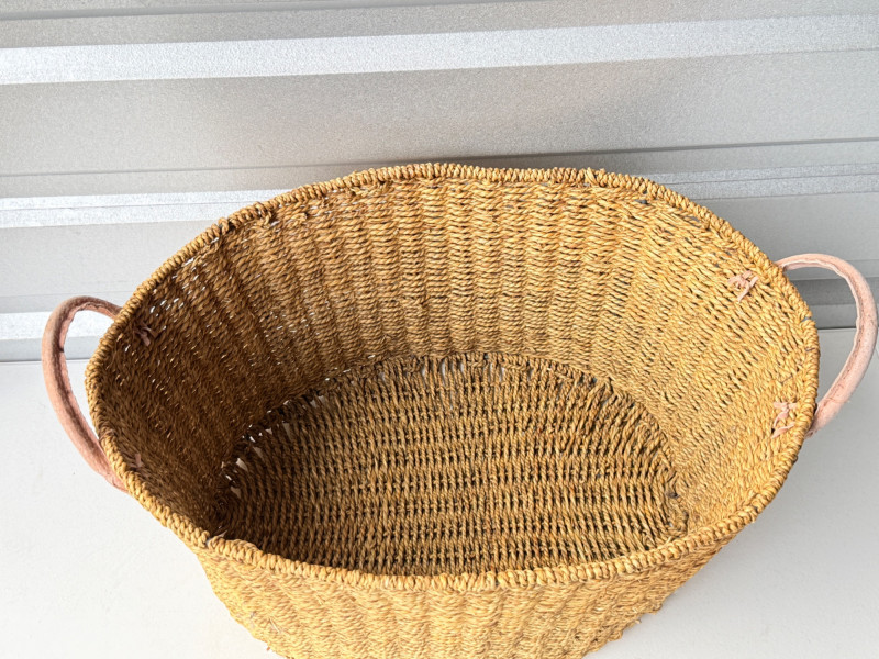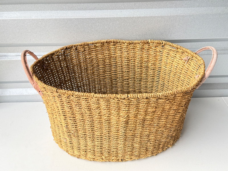 Lot # 132 - Handwoven Basket w/ Leather Handles