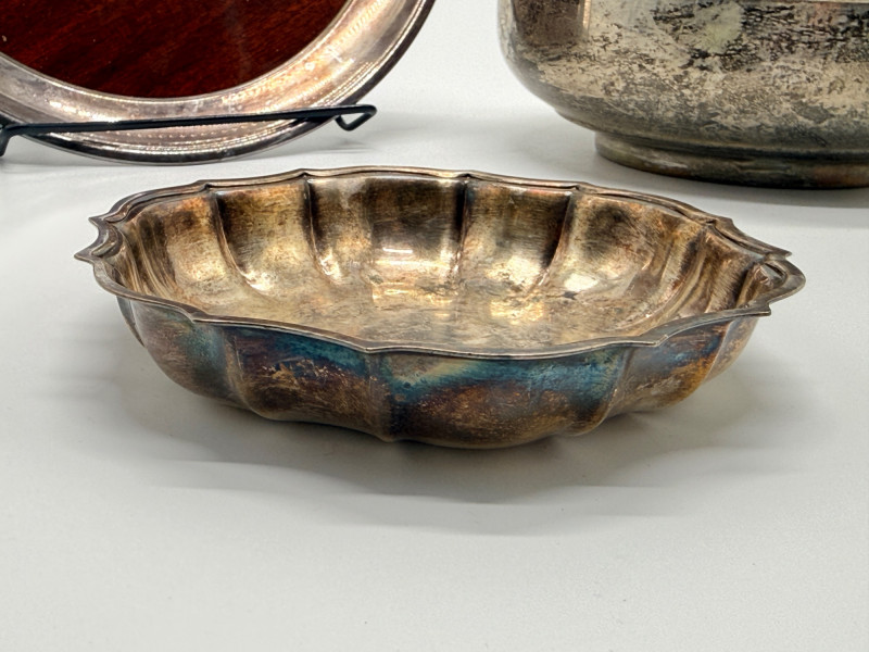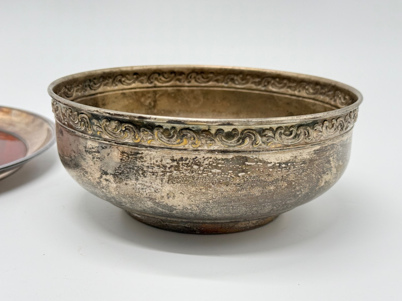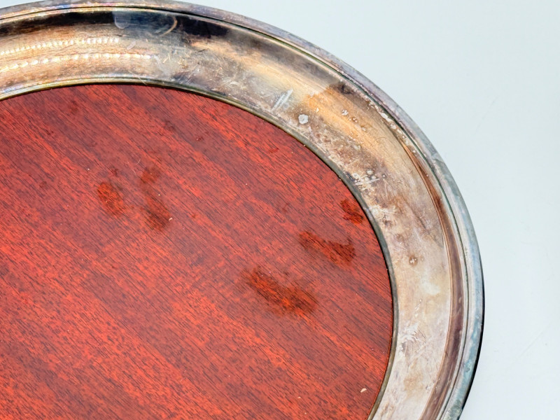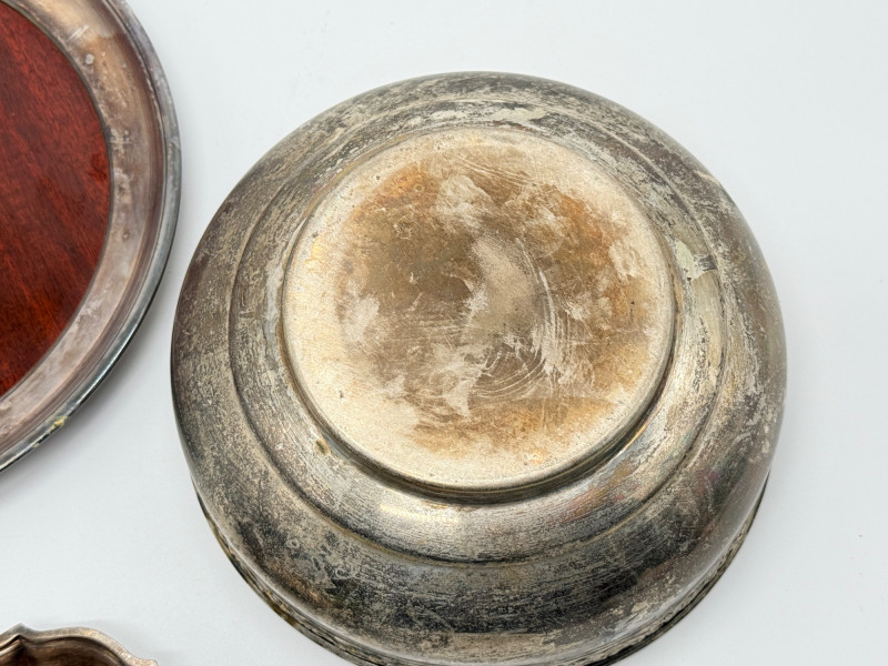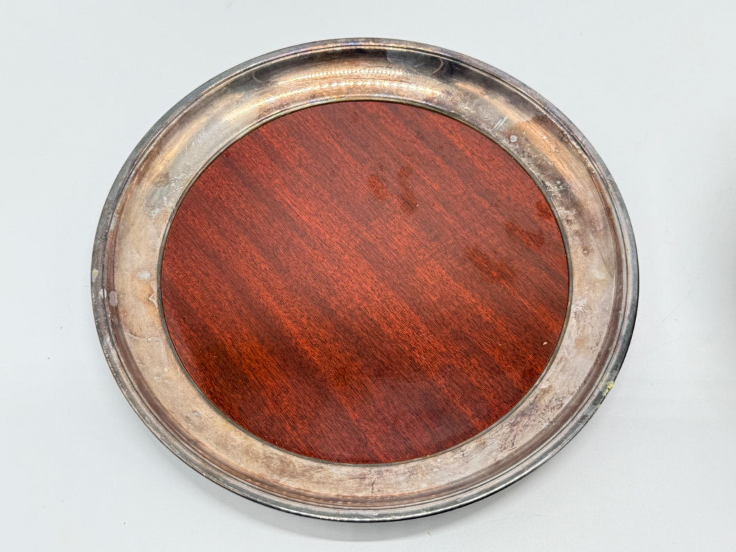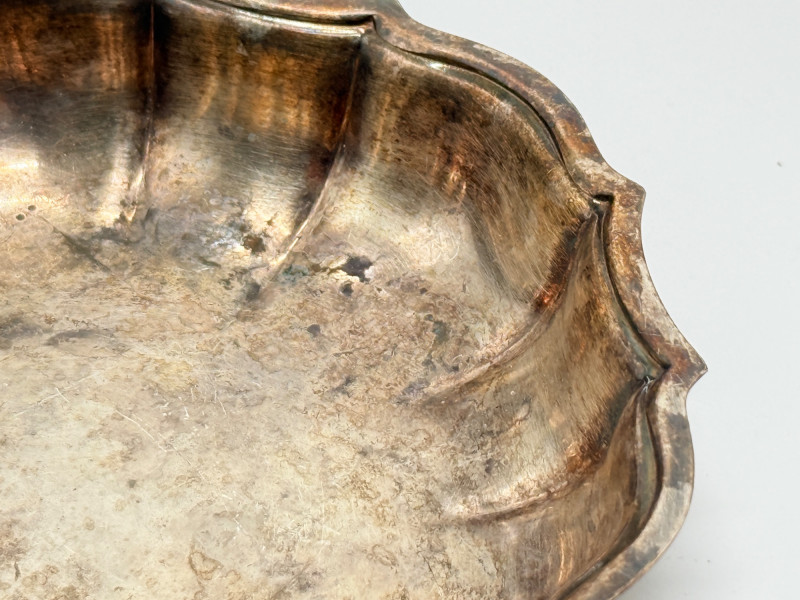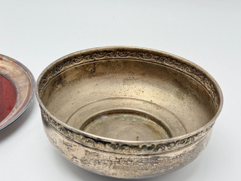 Vintage Silver-Plated Faux Wood Tray, Serving Bowl & Scalloped Bowl Disclaimer: We do not test the metals of the items listed for auction. By placing a bid, you acknowledge and agree that you are purchasing the item "as is" and without any guarantee of metal quality. We do not offer refunds based on metal content or purity.