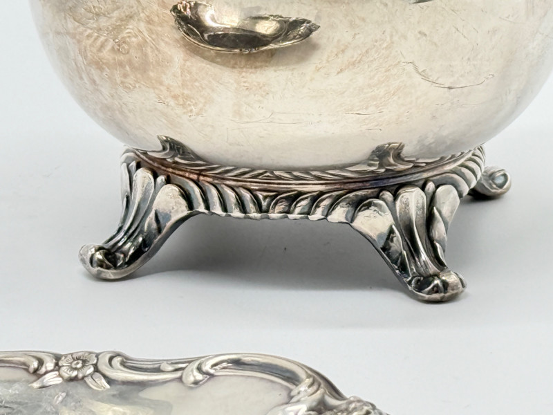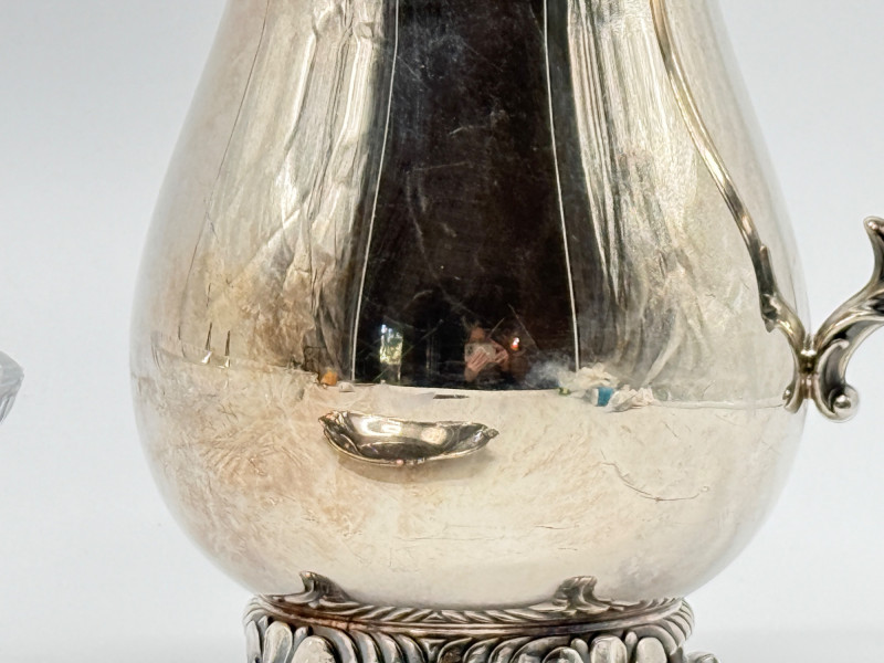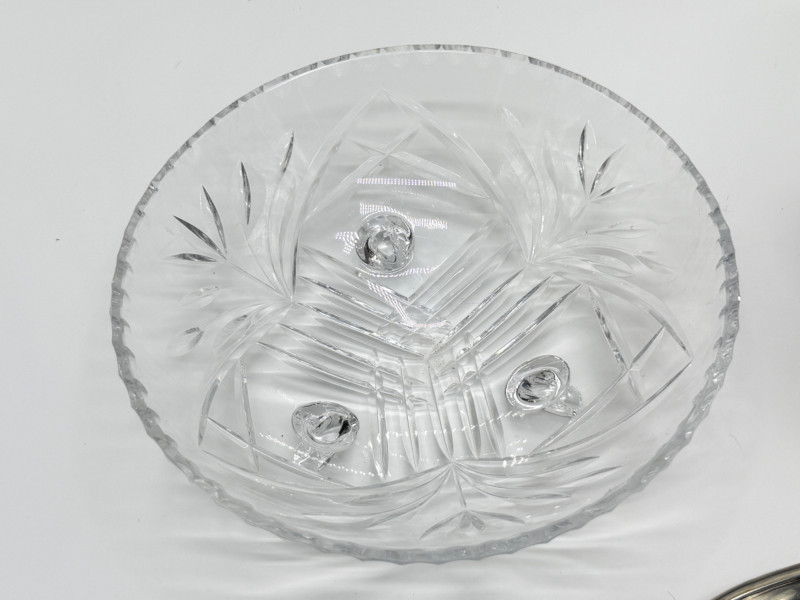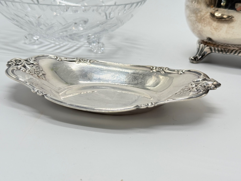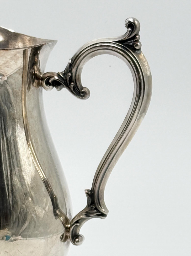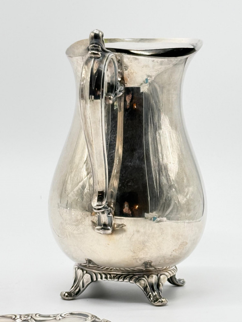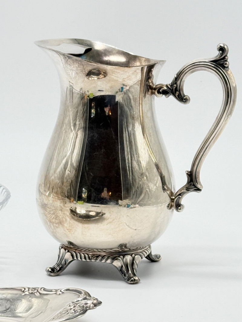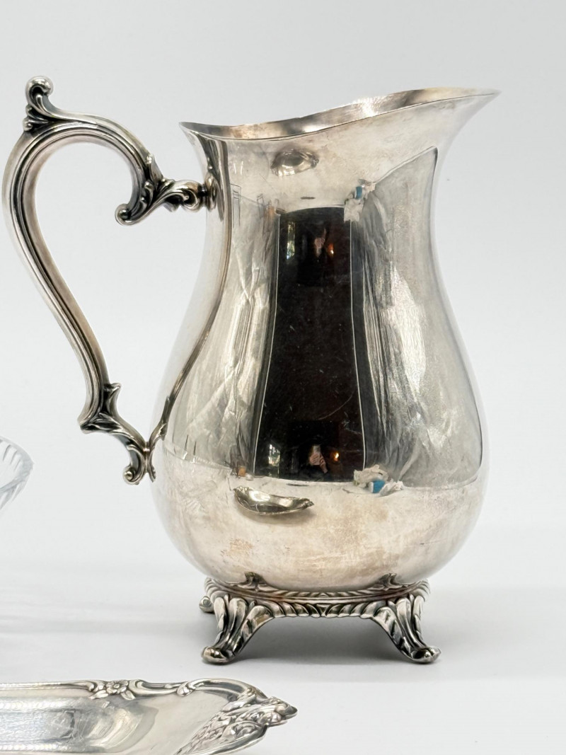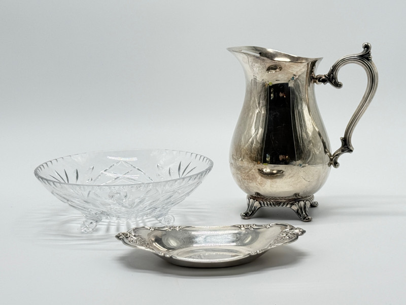 Vintage Silver-Plated Water Pitcher & Candy Dish + Footed Glass Bowl Disclaimer: We do not test the metals of the items listed for auction. By placing a bid, you acknowledge and agree that you are purchasing the item "as is" and without any guarantee of metal quality. We do not offer refunds based on metal content or purity.