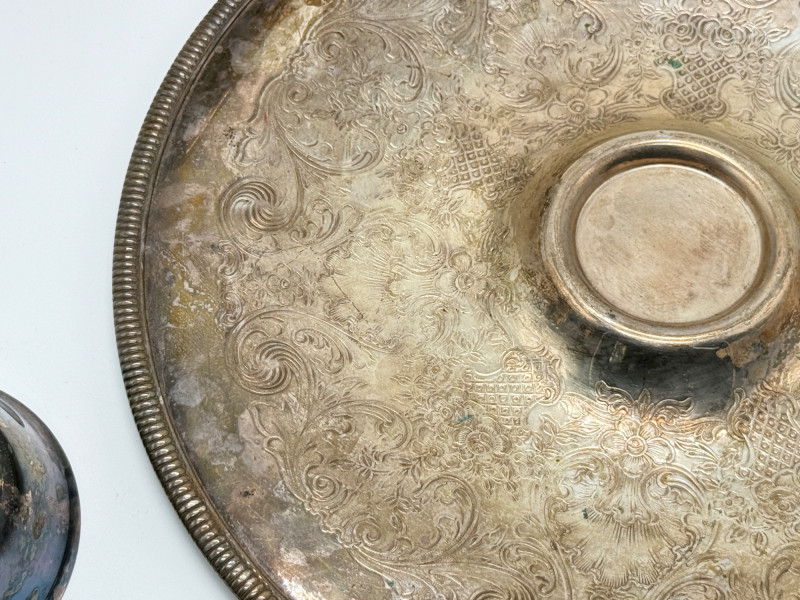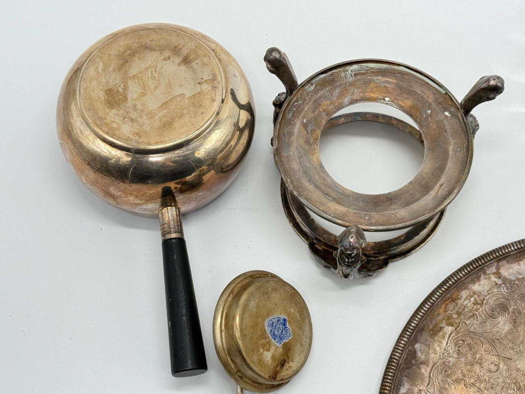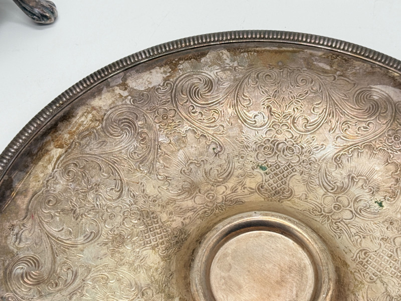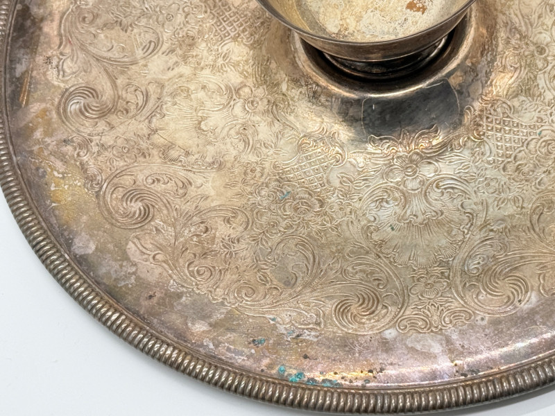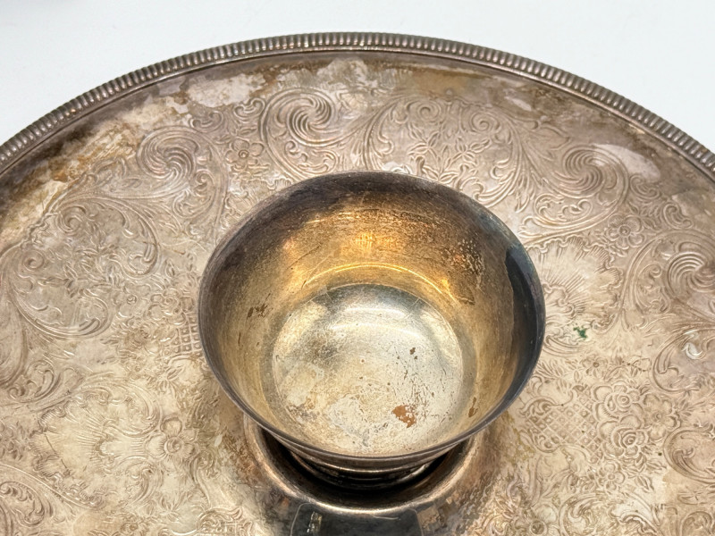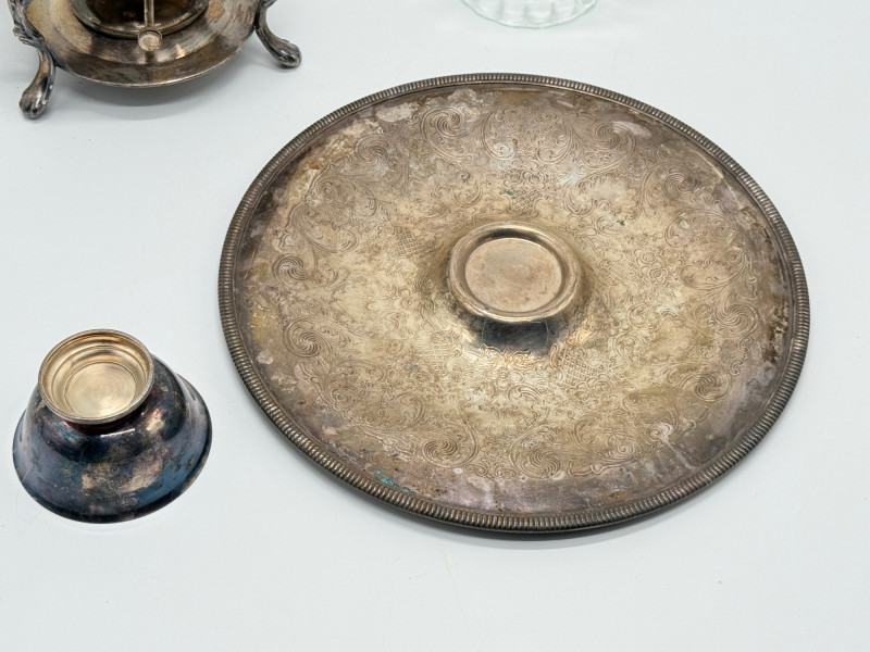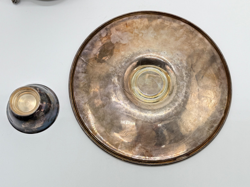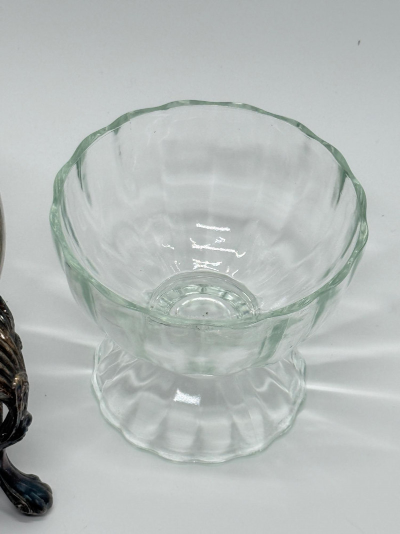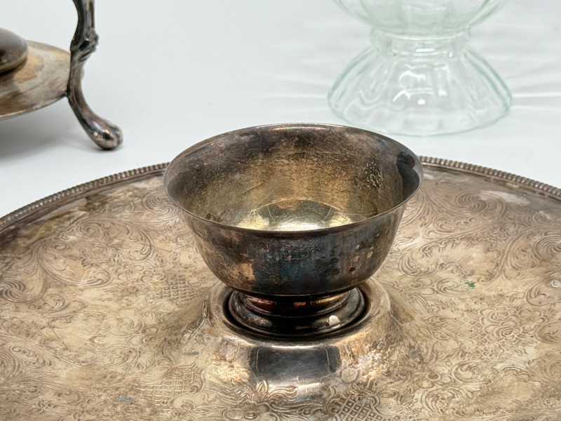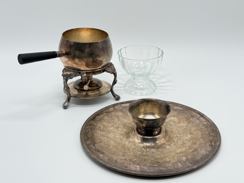 Vintage Silver-Plated Fondue Pot + Chip & Dip Set & Glass Dessert Dish Disclaimer: We do not test the metals of the items listed for auction. By placing a bid, you acknowledge and agree that you are purchasing the item "as is" and without any guarantee of metal quality. We do not offer refunds based on metal content or purity.