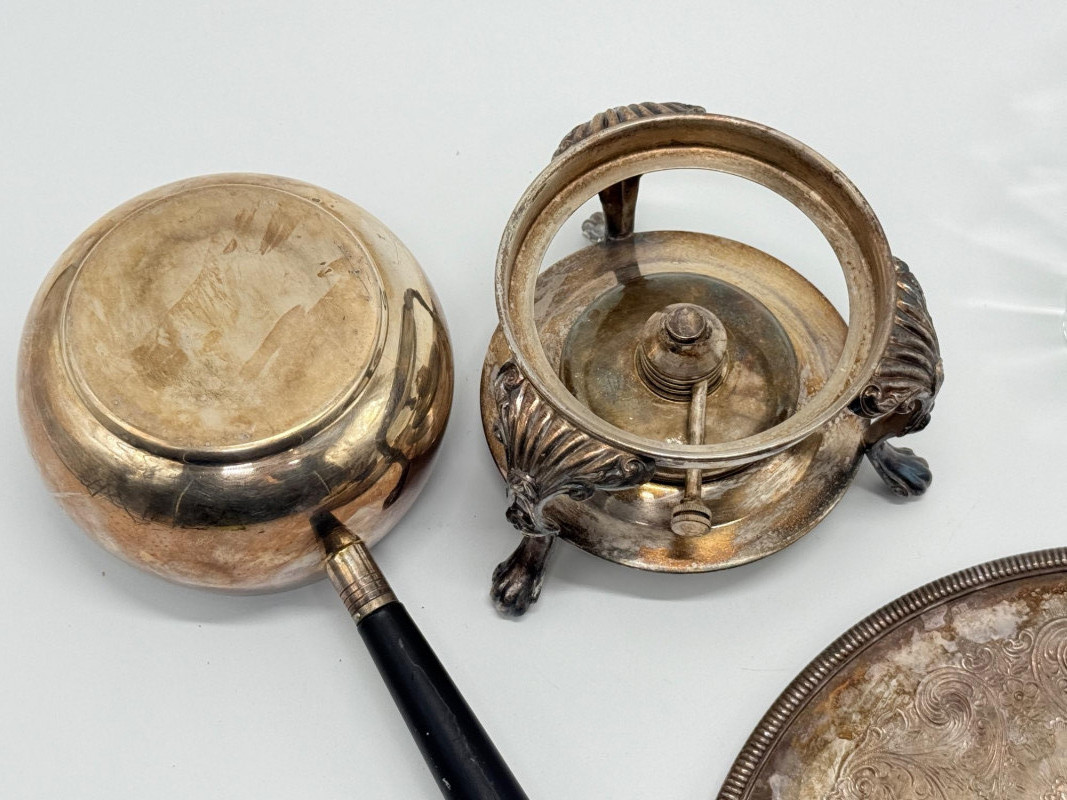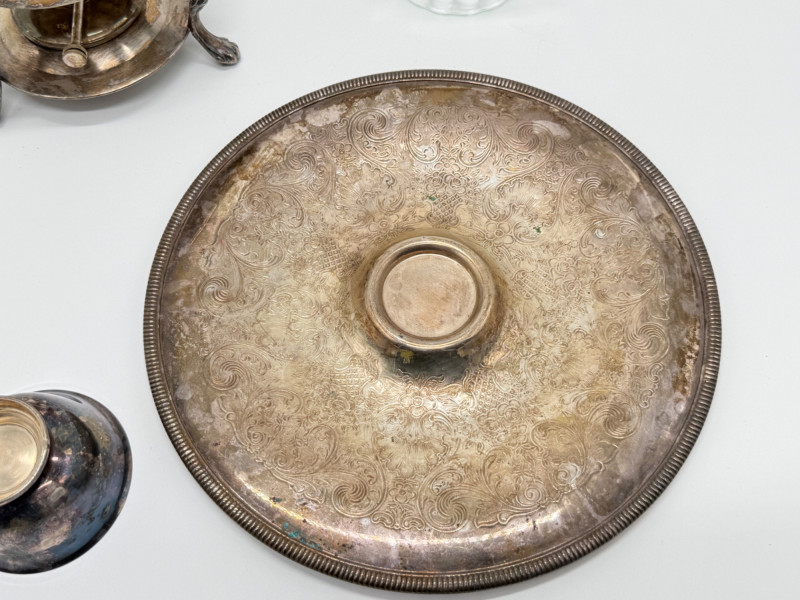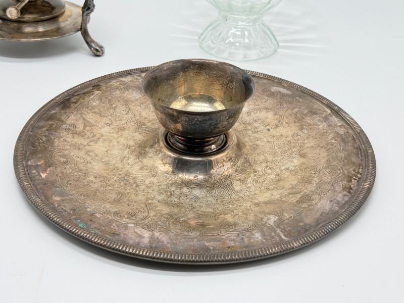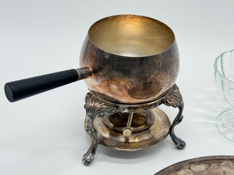 Lot # 79 - Vintage Silver-Plated Fondue Pot + Chip & Dip Set & Glass Dessert Dish