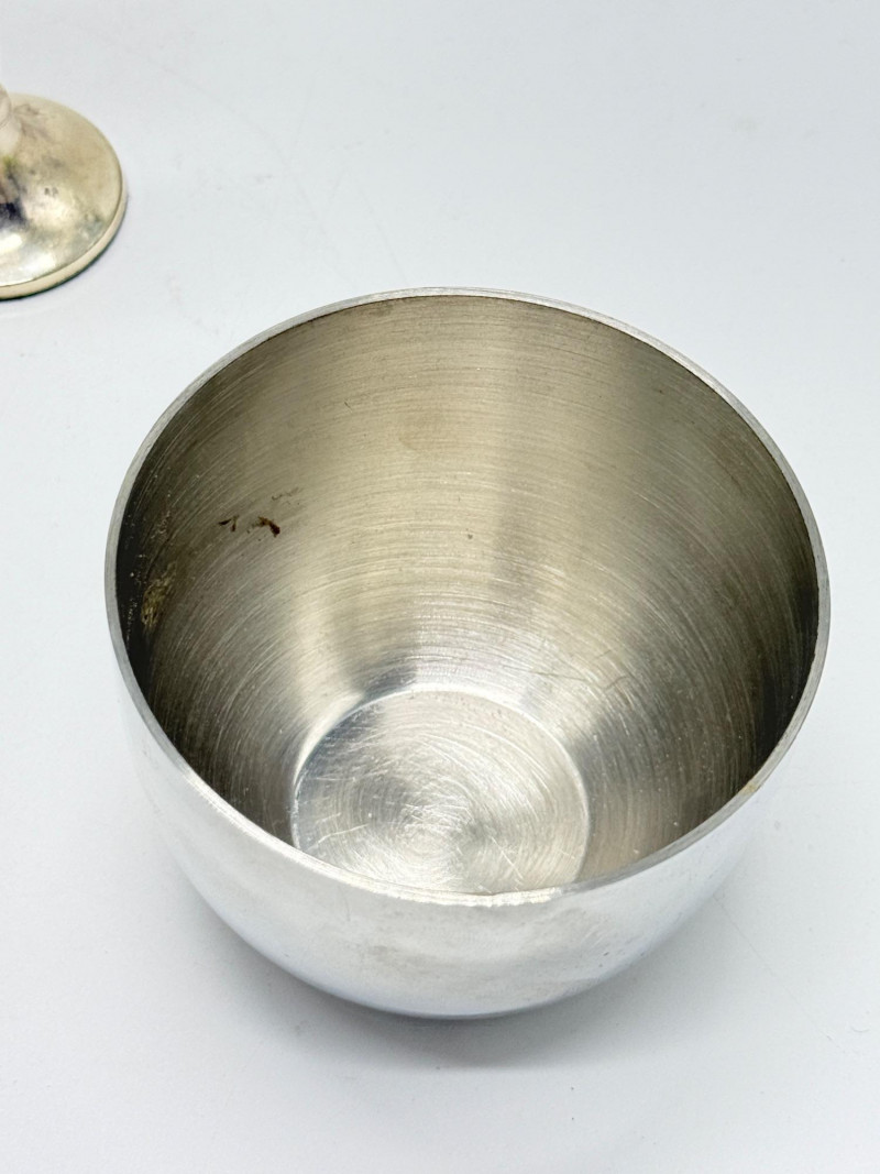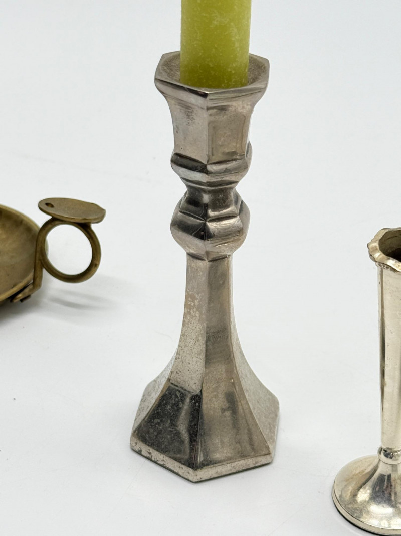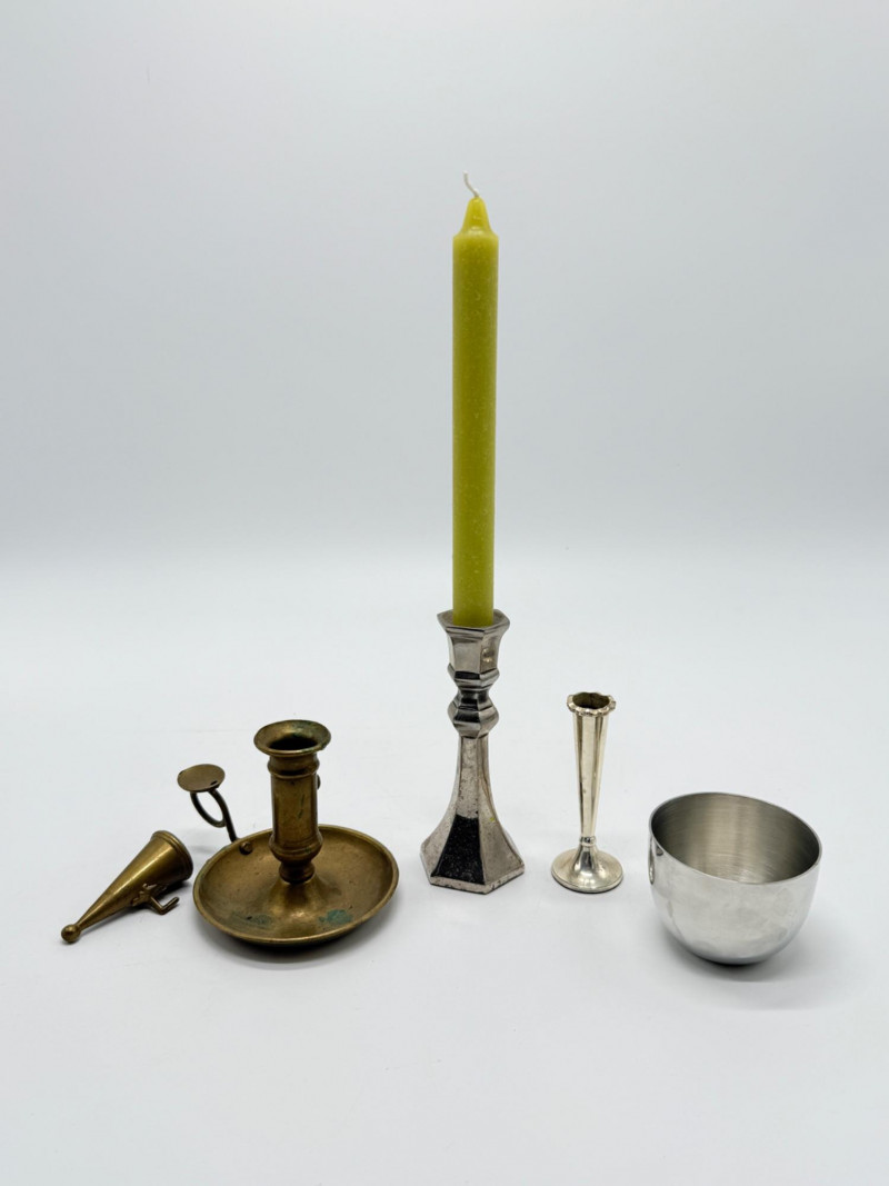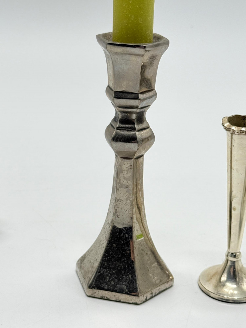 Vintage Brass & Silver-Plated Candle Holders, Bud Vase & Pewter Cup Disclaimer: We do not test the metals of the items listed for auction. By placing a bid, you acknowledge and agree that you are purchasing the item "as is" and without any guarantee of metal quality. We do not offer refunds based on metal content or purity.