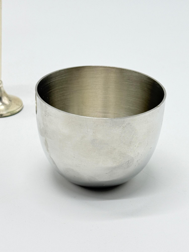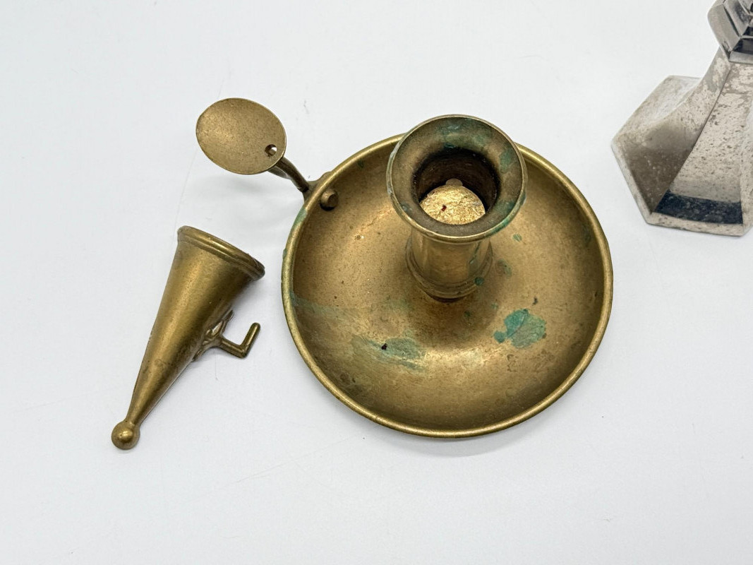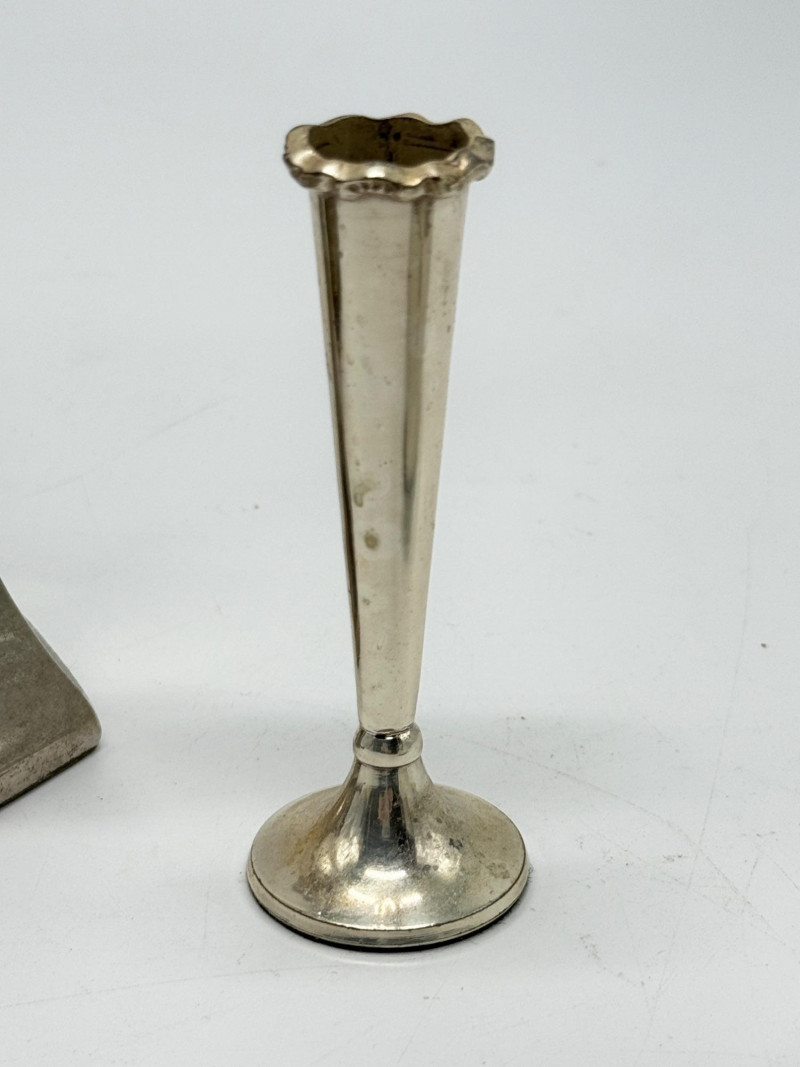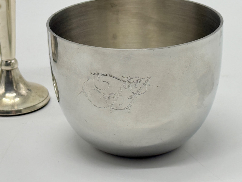 Vintage Brass & Silver-Plated Candle Holders, Bud Vase & Pewter Cup Disclaimer: We do not test the metals of the items listed for auction. By placing a bid, you acknowledge and agree that you are purchasing the item "as is" and without any guarantee of metal quality. We do not offer refunds based on metal content or purity.