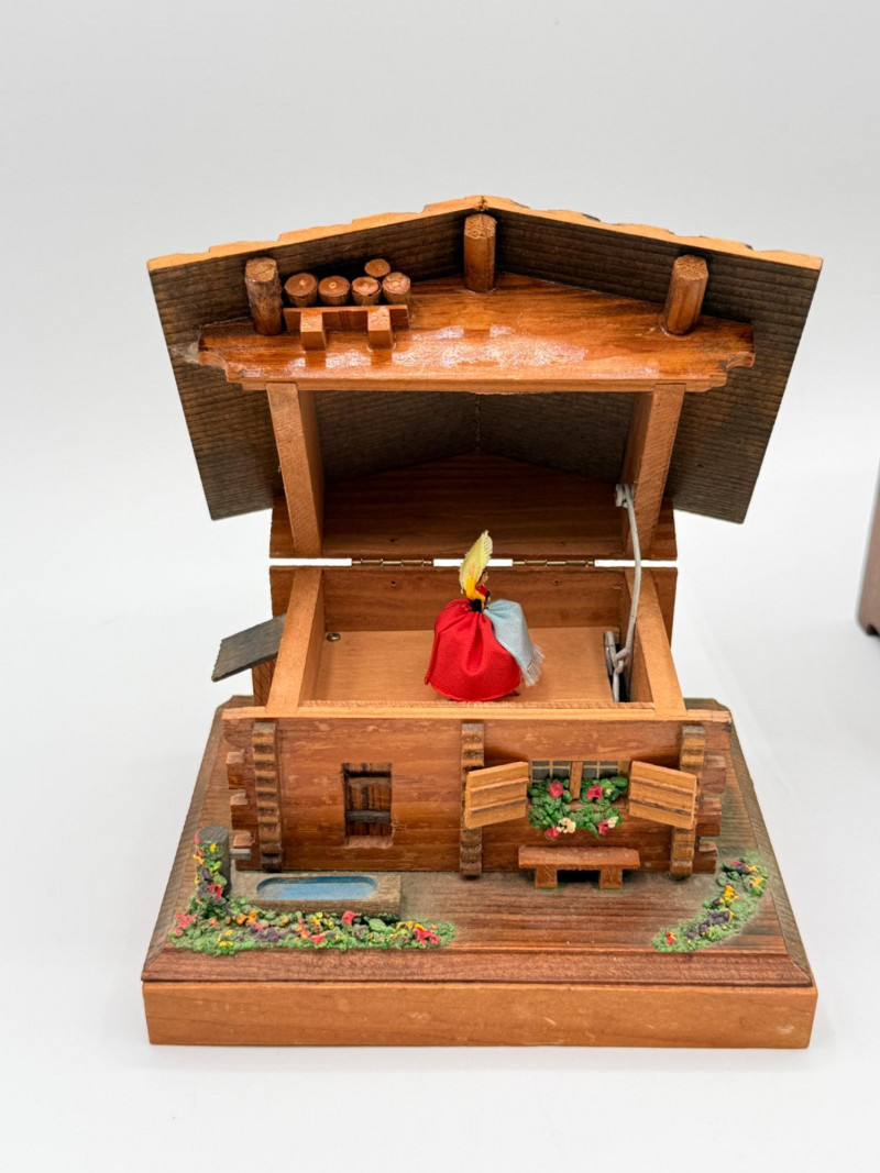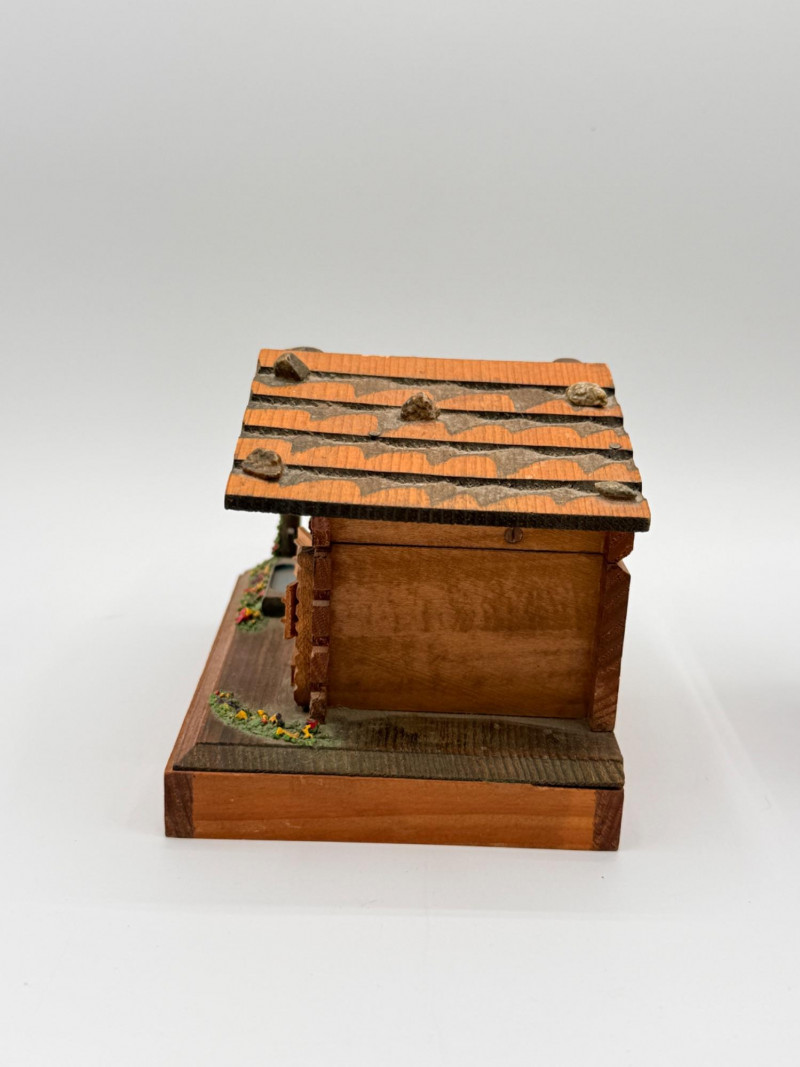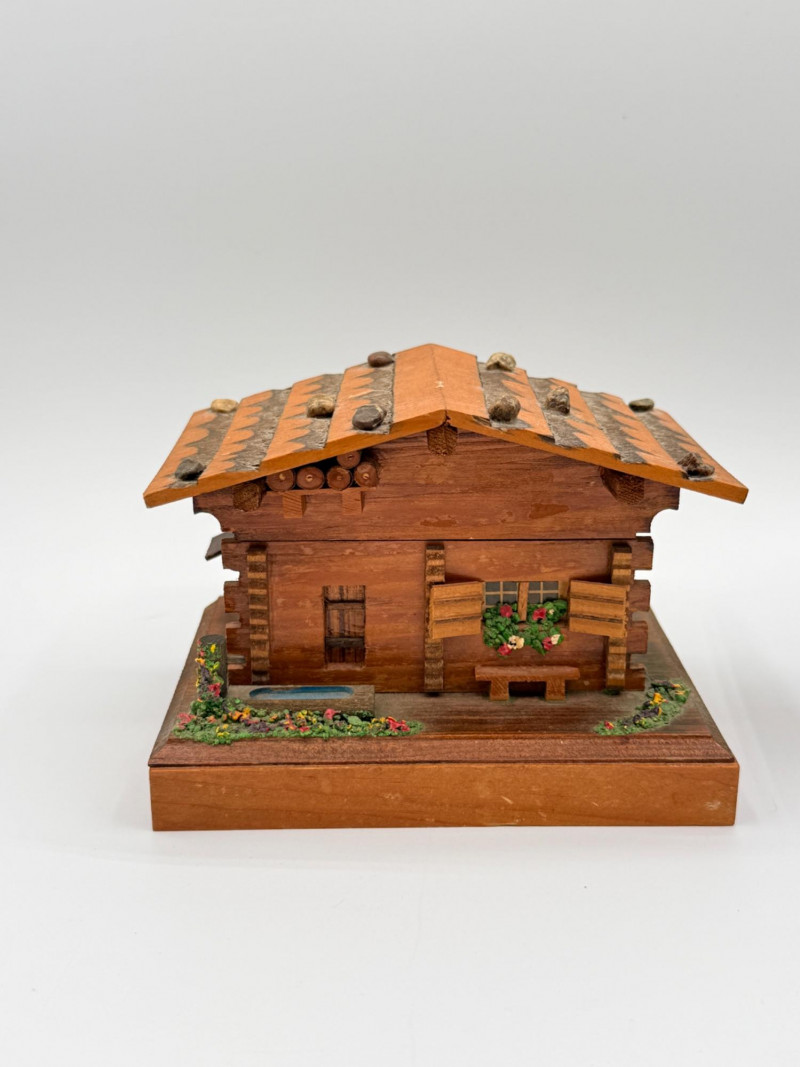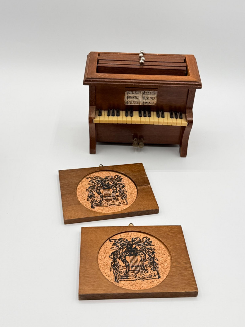 Vintage Miniature Swiss Chalet Music Box & Enesco Piano Coaster Holder