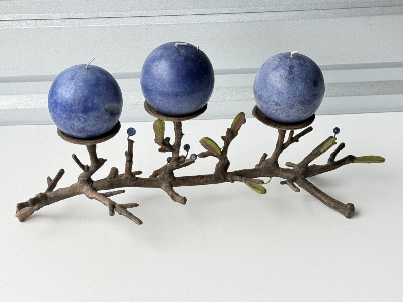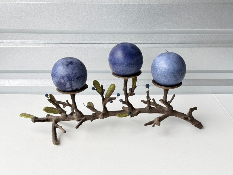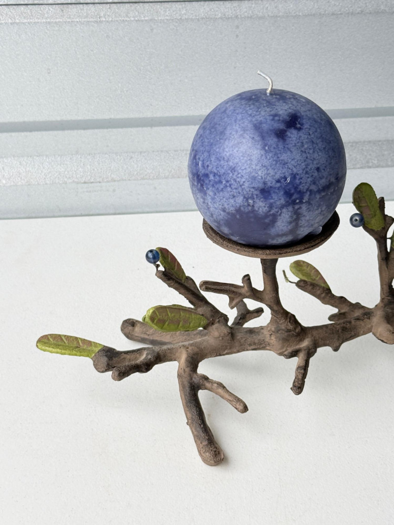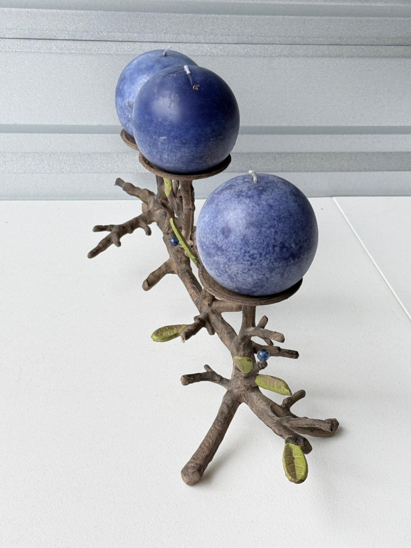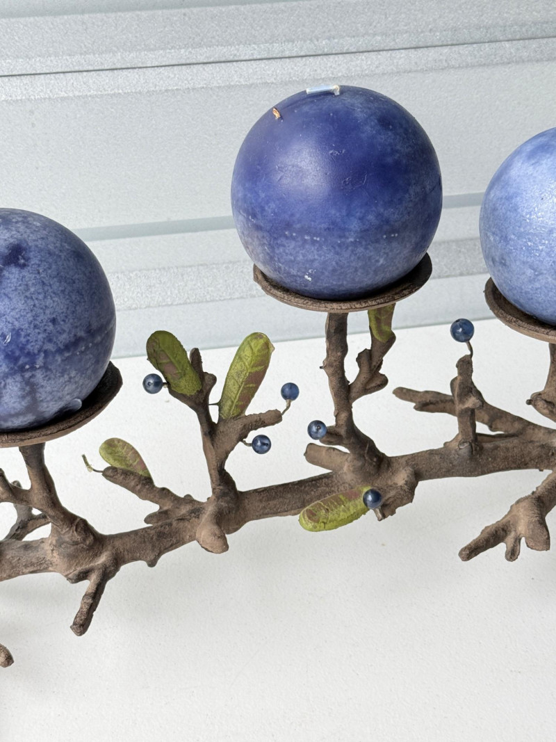 Vintage Cast Iron Blue Berry Branch 3-Pillar Candle Holder