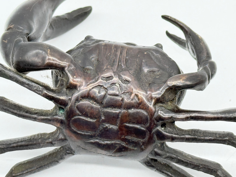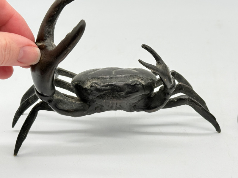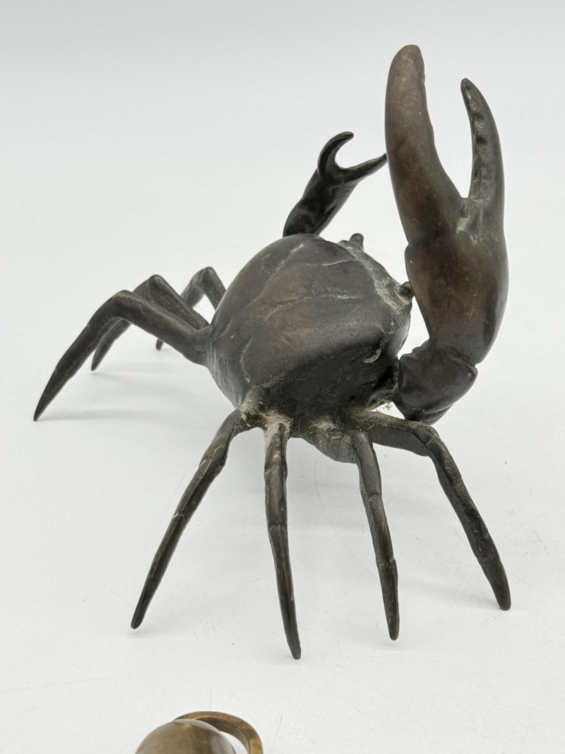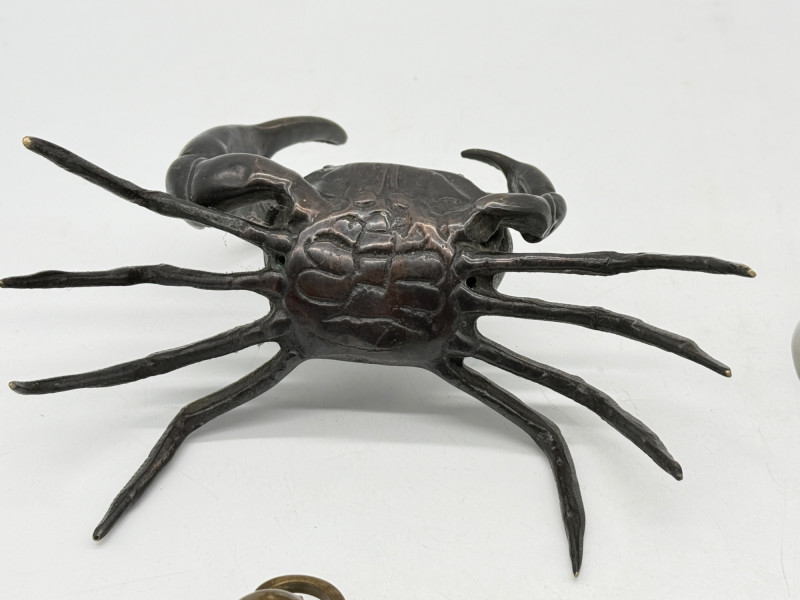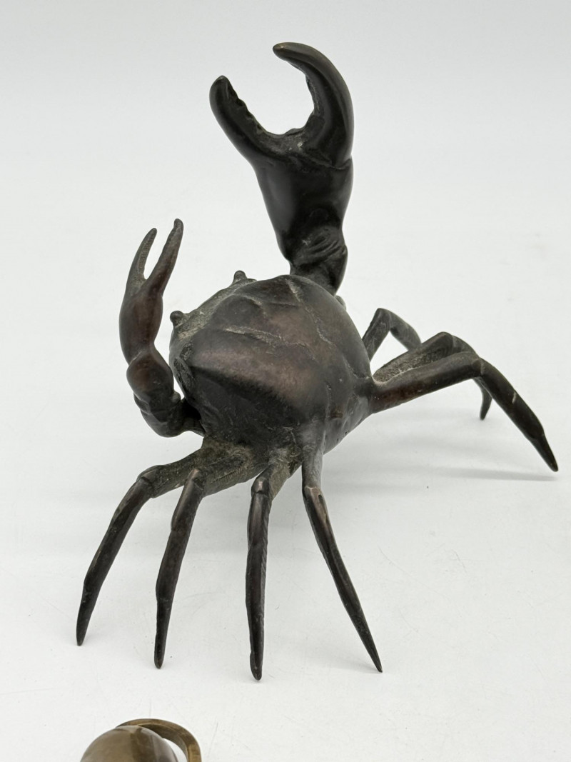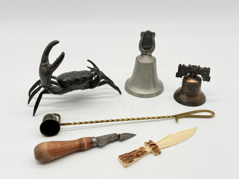 Lot # 43 - Mix Metals of Crab, Bells, Candle Snuffer, Can Opener & Antler Blade