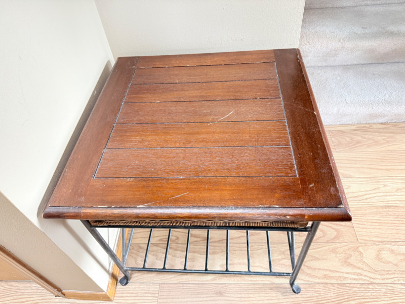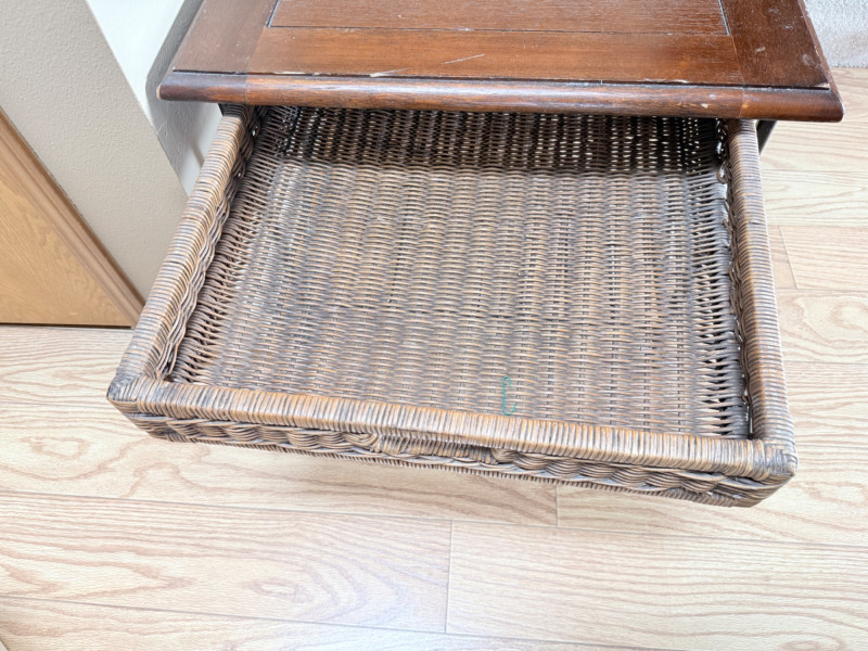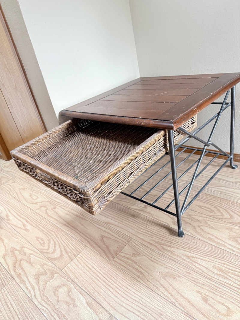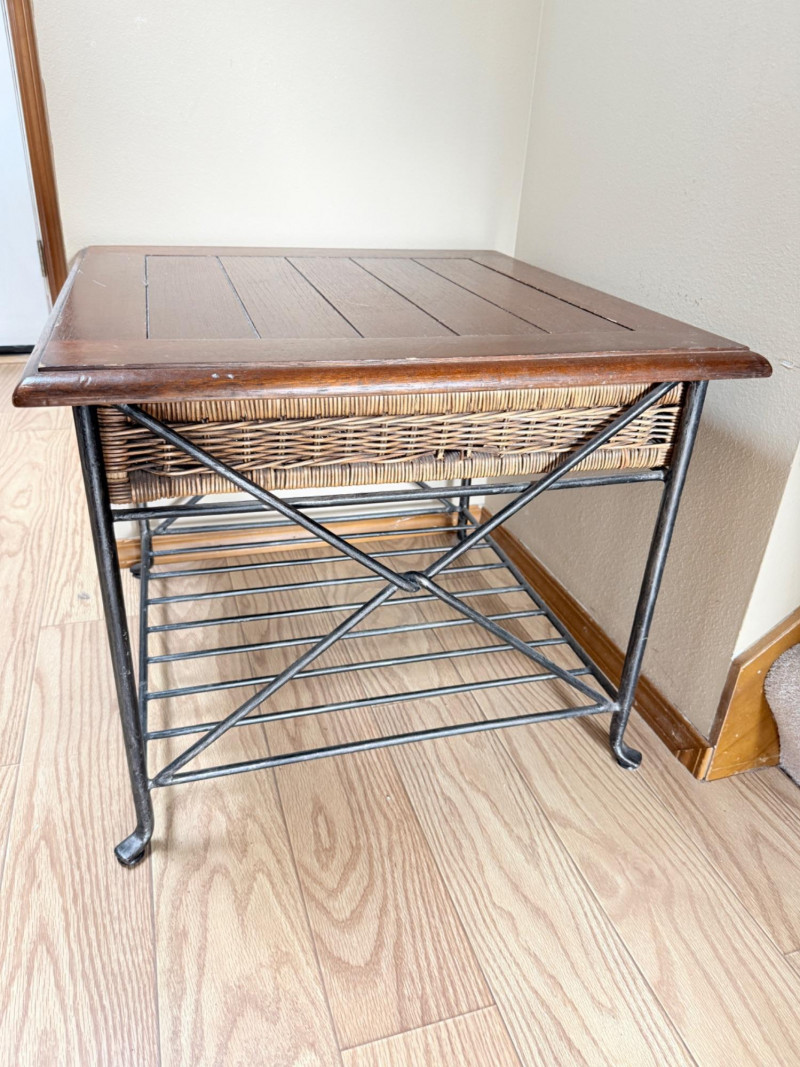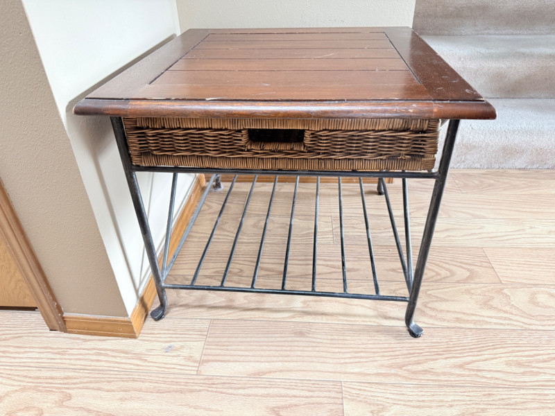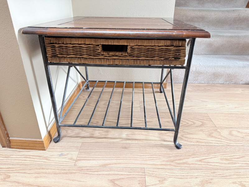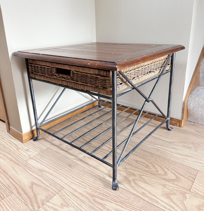 Metal Framed Wooden Side Table w/ Wicker Drawer