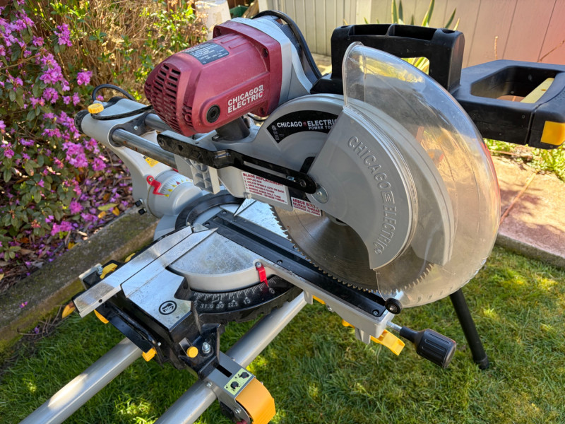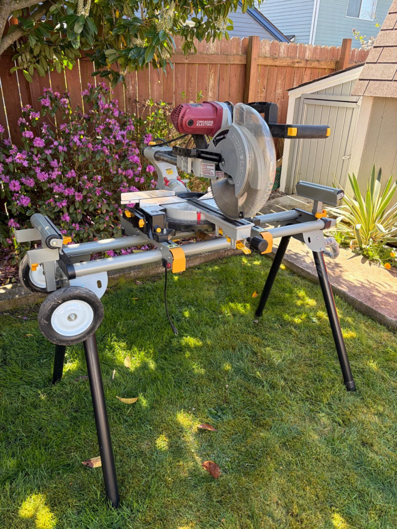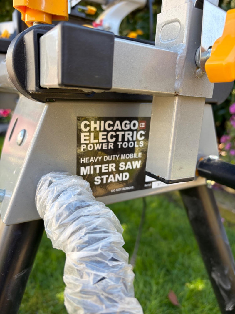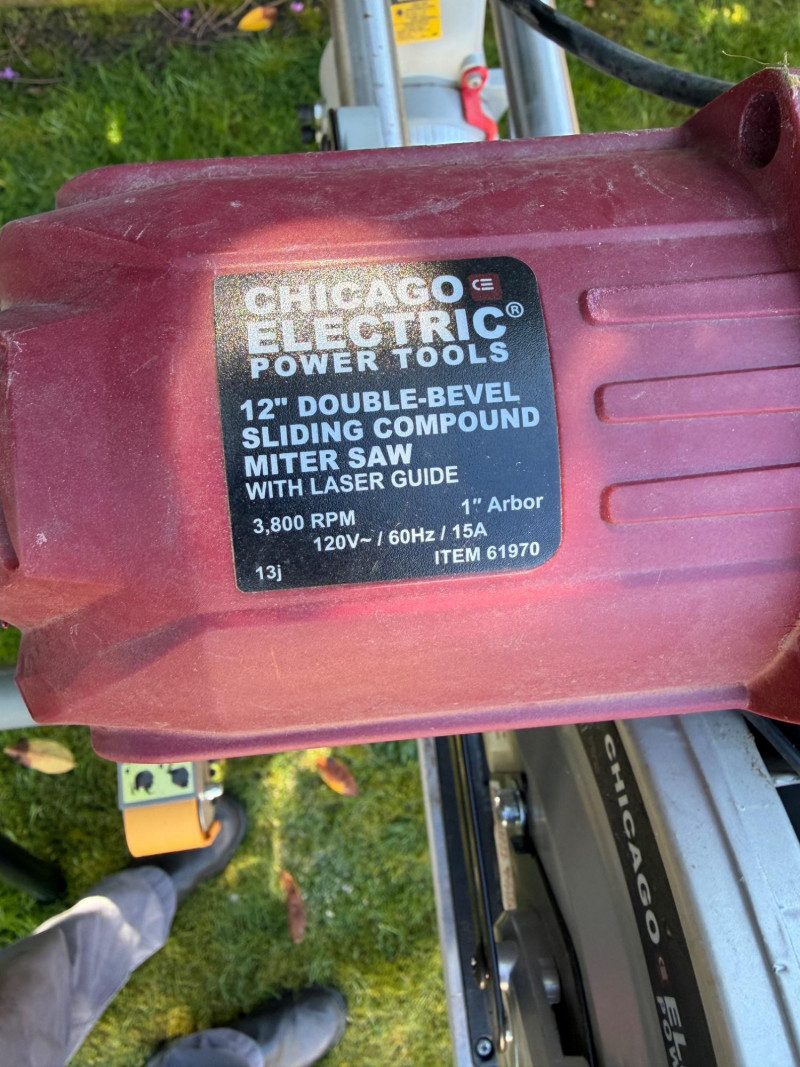 Chicago Electric 12" Sliding Compound Miter Saw on Rolling Stand Bidding on this lot is an agreement that: (1) You will have 2 or 3 capable, able bodied persons to lift and load at a minimum. (2) You will bring a hand truck and/or any other tools needed to remove this item. If these steps are not followed your next item will be forfeit and no refund given.