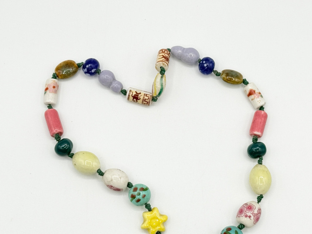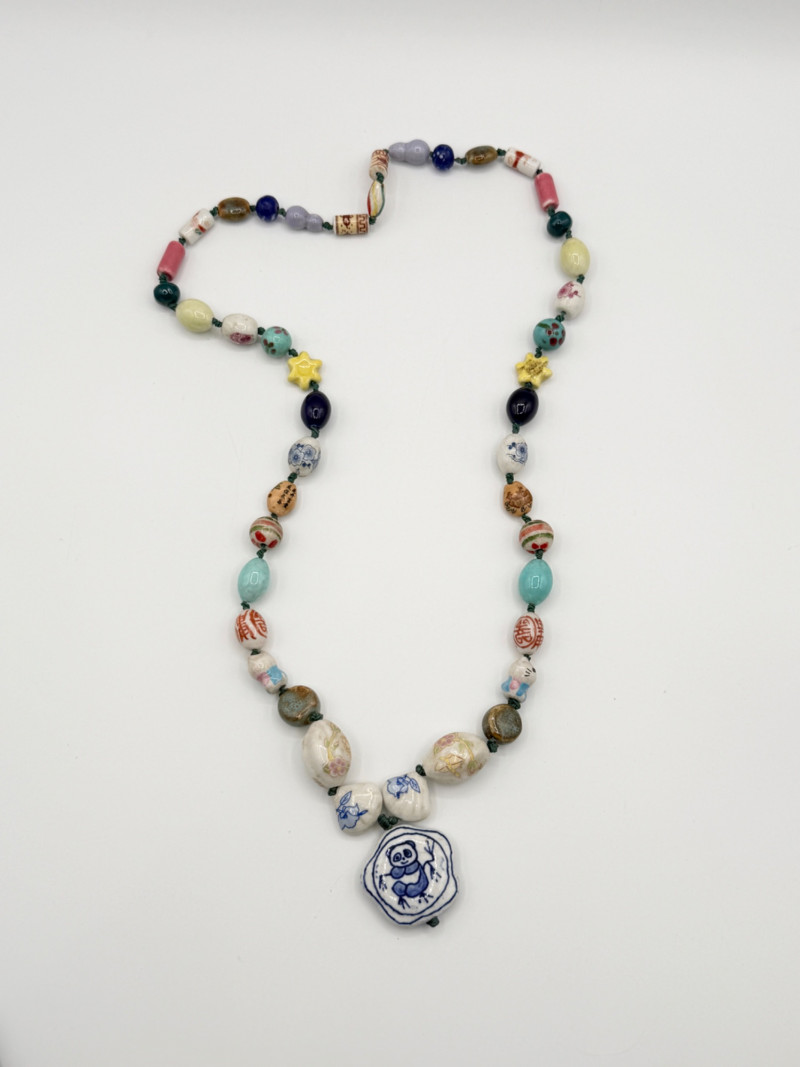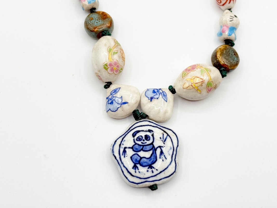 Chinese Porcelain Beaded Lariat Necklace w/ Panda Pendant